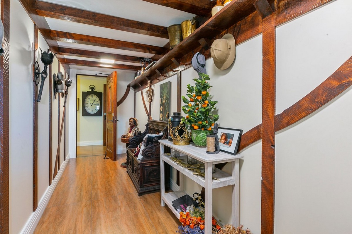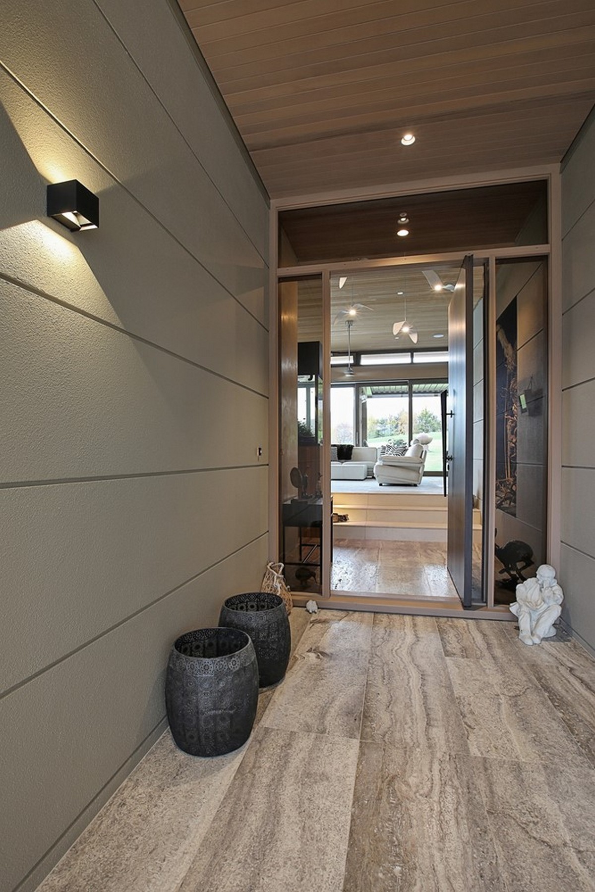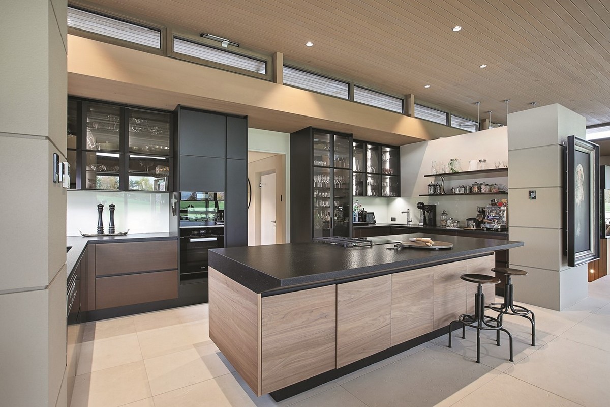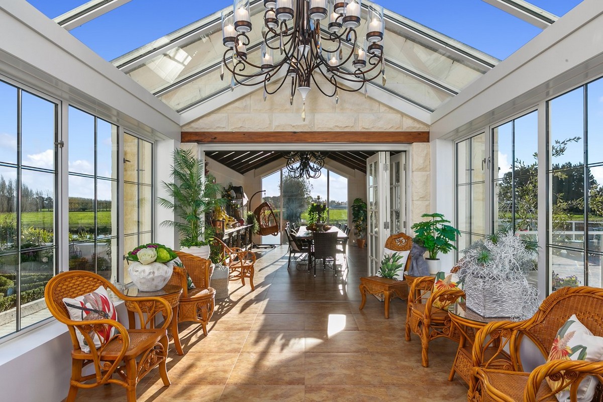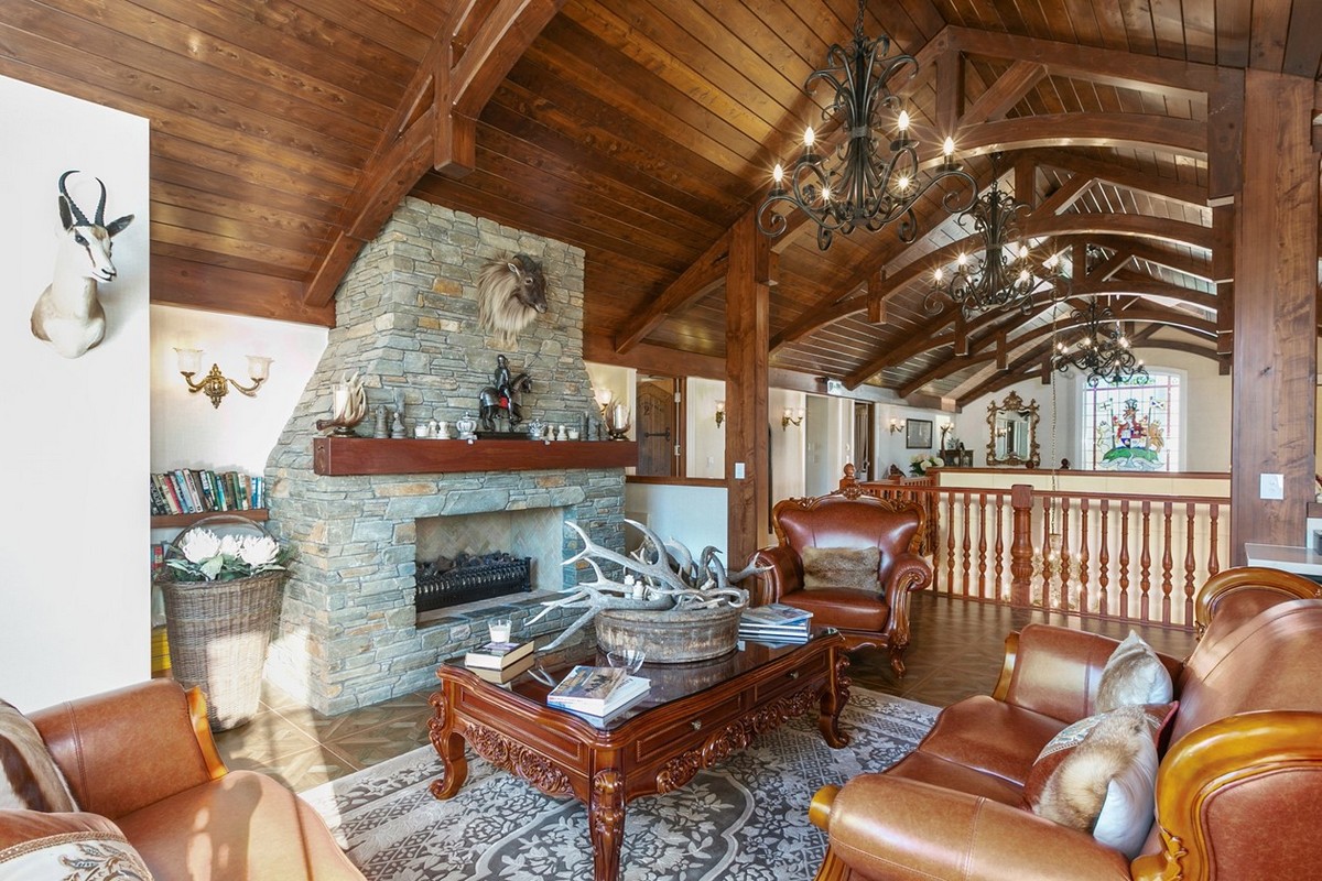 Underfloor heating comes from moat water passing through heat pumps and a furnace that warms the pipes. Some of the internal beams are made from century-old macrocarpa from the owners’ farm.