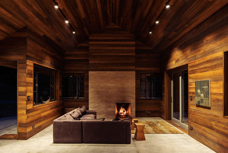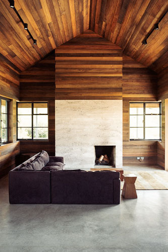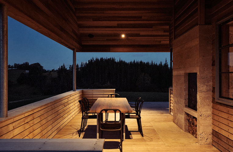 Lined with native timbers (rimu, kahikatea and matai), all salvaged from Northland rivers, the fireplace surround is an attempt to recreate the material used in a century old dairy factory onsite, a boney clay rubble and lime mixture.
