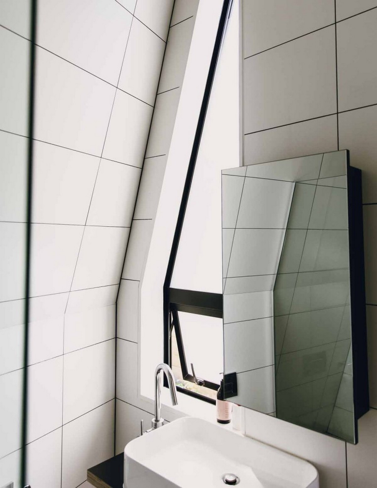 The 135 square metre home sits snugly against the slope. Using educated solutions has meant that excavation was kept to a minimum and the ground underneath has been left untouched. An angled wall divides the living areas from the bedrooms and amenities. The layout, using differing levels and angles, ensures the house is fit for purpose.