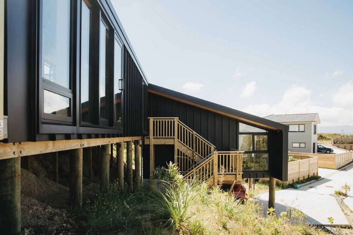 This NZIA award winning home is a prime example of responsive design. It maximises the stunning views of Wellington Harbour and ensures solar gain is prioritised. Under challenging site conditions, it avoids falling into the trap of sitting heavily on the site. Instead it uses a small retaining wall to anchor the structure and organic pole foundations to allow the building to hover over the landscape. In time, those poles will blend in seamlessly with the future planting of native bush.