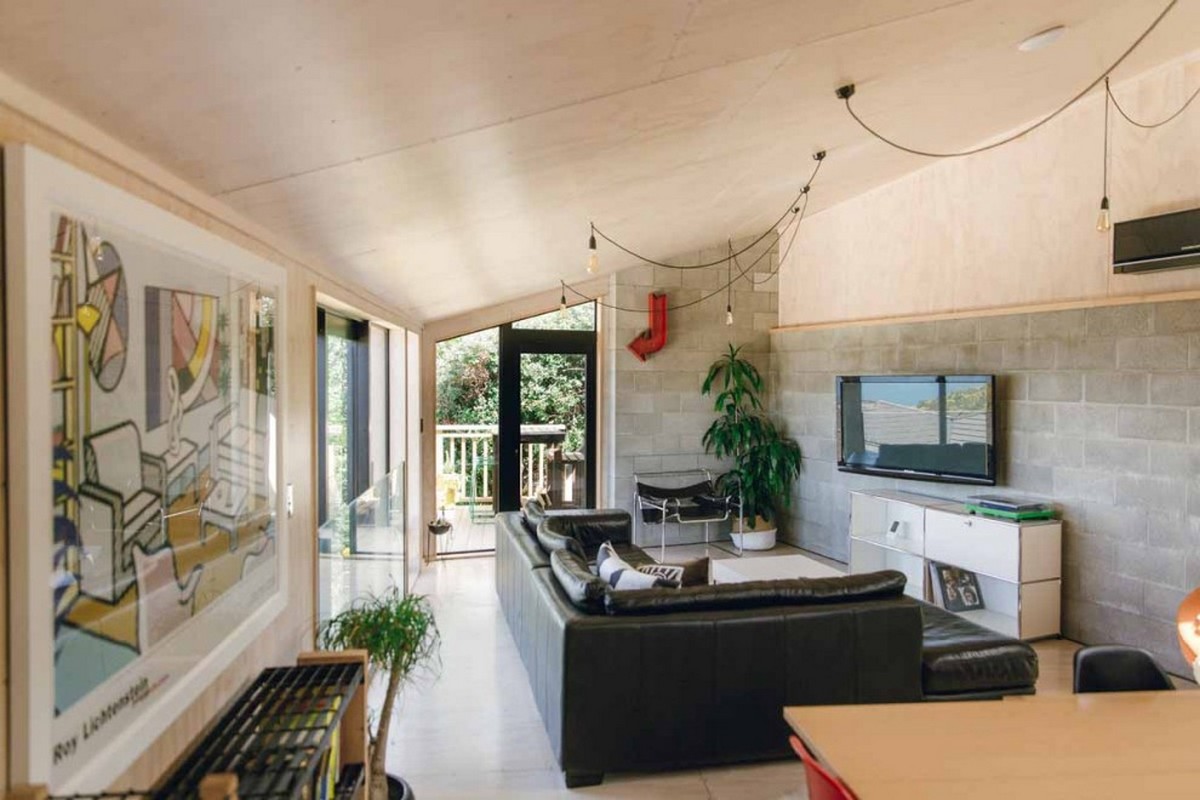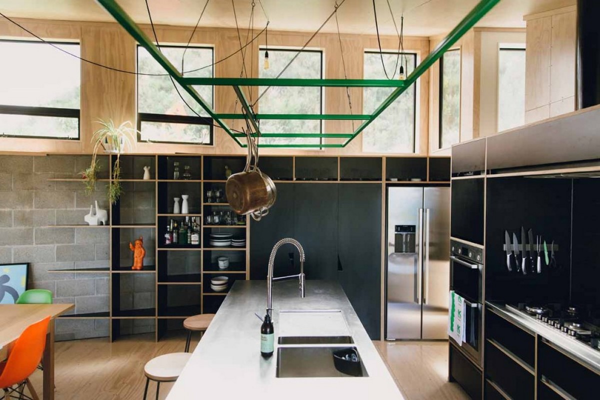 The resourceful approach to design continues inside, with the simple beauty of blonded plywood mixed with the solidity of masonry blocks and painted plasterboard walls. The kitchen mixes black HPL coated plywood joinery, with looped LED lights and a stunning green hanging frame highlighting the space.