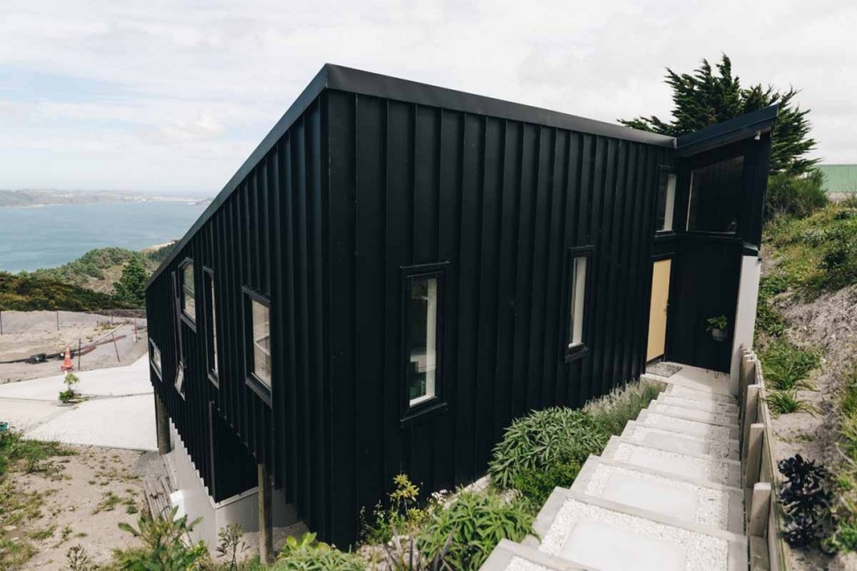 The exterior cladding is kept simple by encasing the home in wide pan black steel cladding, making a statement of modernity, while also insuring this is an easy care, low maintenance option for the homeowners. Vosterman Architects are not timid and revel in adding a splash of colour with bold exterior doors shouting a hello in citrus hues. The black exterior is softened with ply soffits and timber stair balustrades.