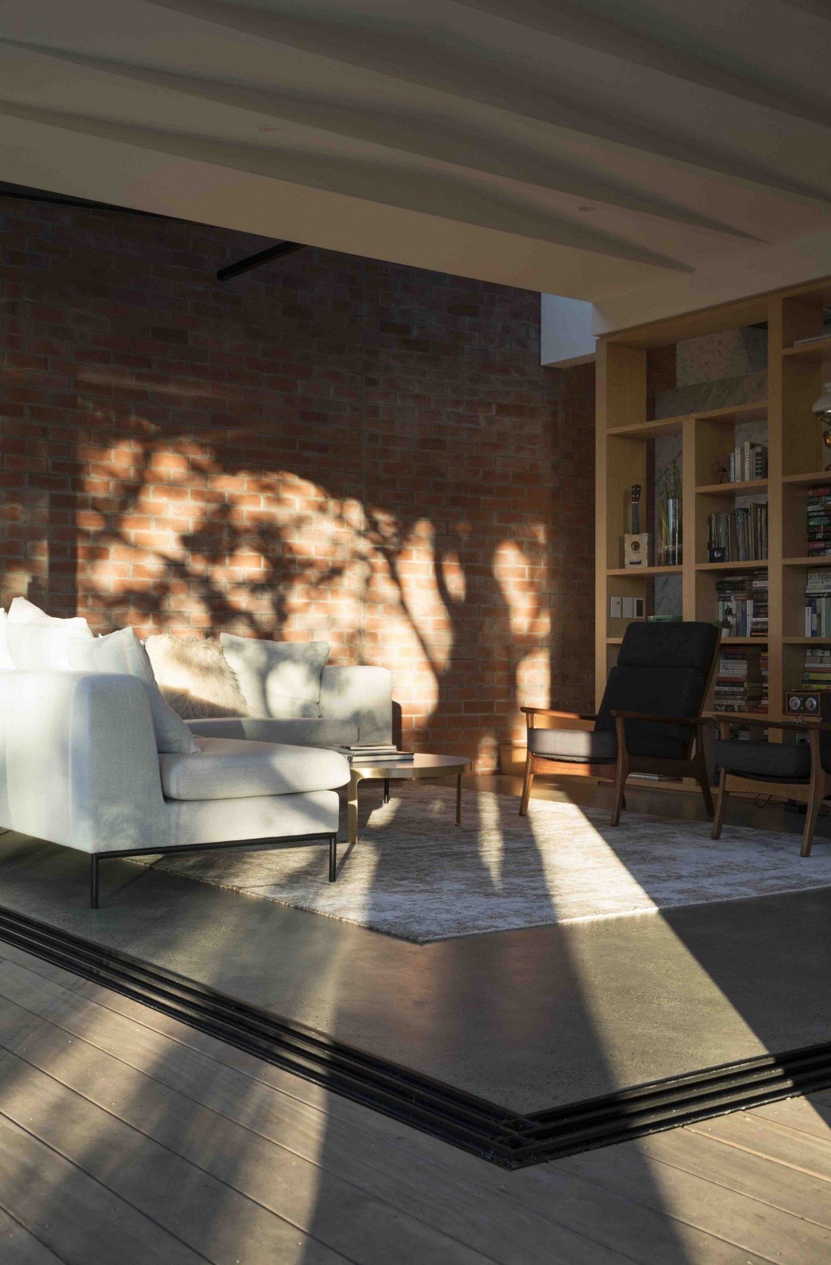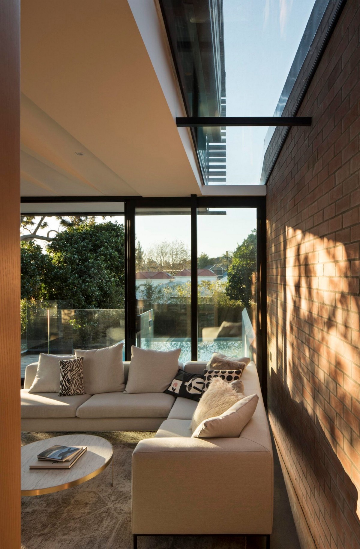 The interior of the house delights in showcasing the craftsmanship from a century ago directly alongside modern craftspeople, including a mixture of highly functional storage options, negative detailing and beautiful crafted joinery. The combination of raw materials, natural wood and the deliberate use of old brick retaining walls establish an aesthetic that stimulates the eye at every turn. This house is a visual feast, with shadows from an ancient Pohutukawa tree creating a living piece of art on a red brick wall, just one example of Matter Architects thoughtful translation of light and space.