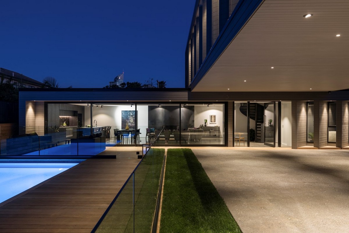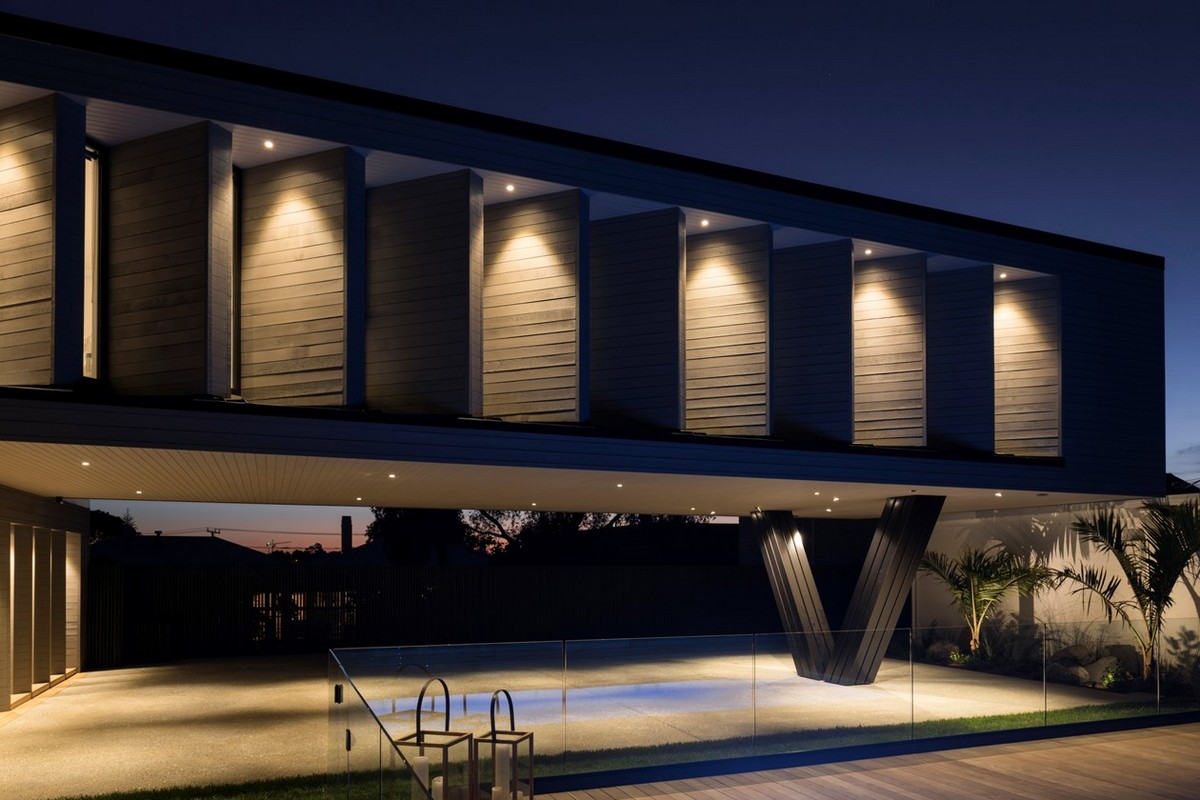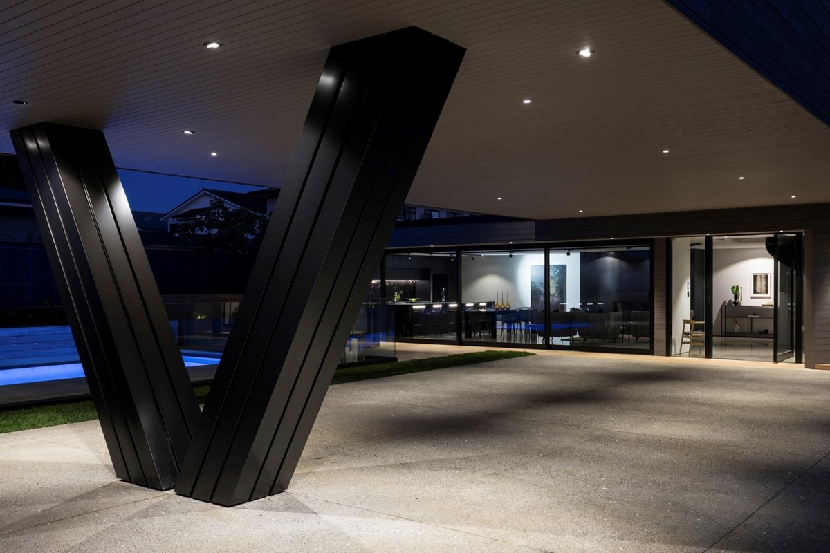 Clean contemporary lines take nothing away from the spectacular black V-shaped support under the house, with parking for up to four vehicles and a boat.
