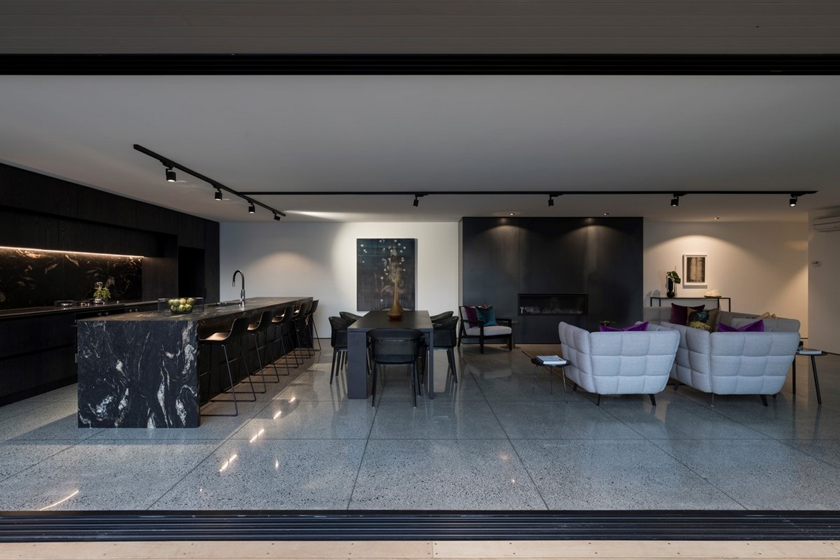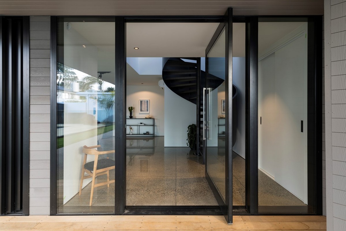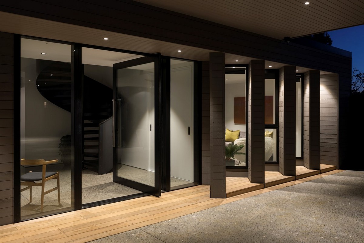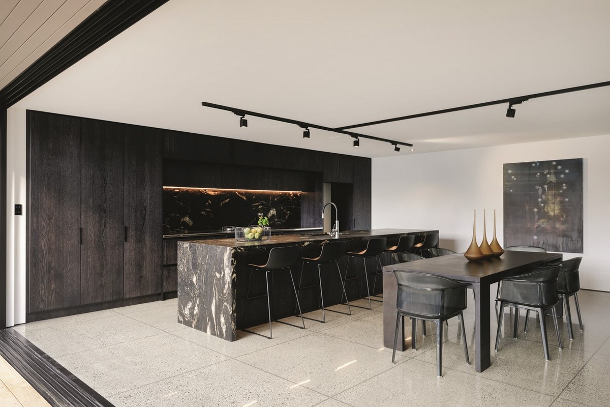 Clean contemporary lines take nothing away from the spectacular black V-shaped support under the house, with parking for up to four vehicles and a boat.