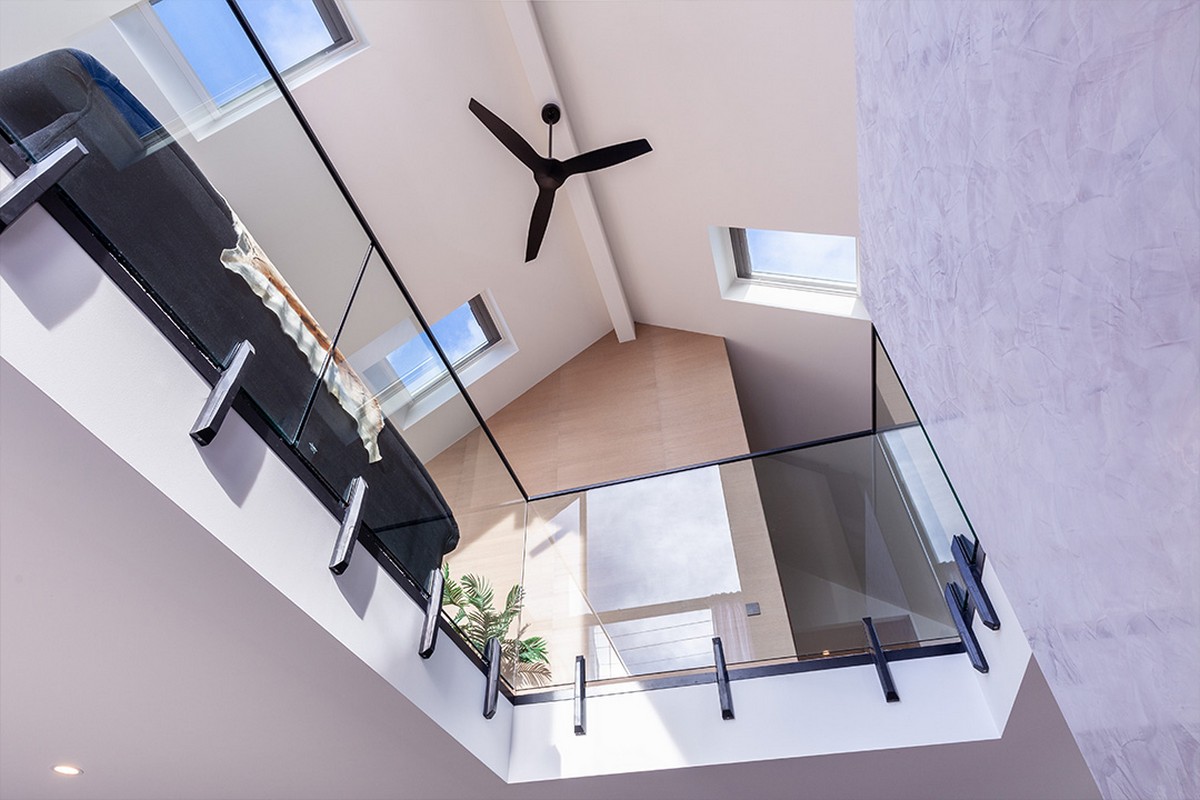 The modern exterior of the four-bedroom home features a mix of polished plaster cladding, cedar weatherboard and glass gable facade, while inside are spacious open-planning living, a mezzanine level and raked ceilings along with custom joinery and contemporary kitchen and bathroom design.