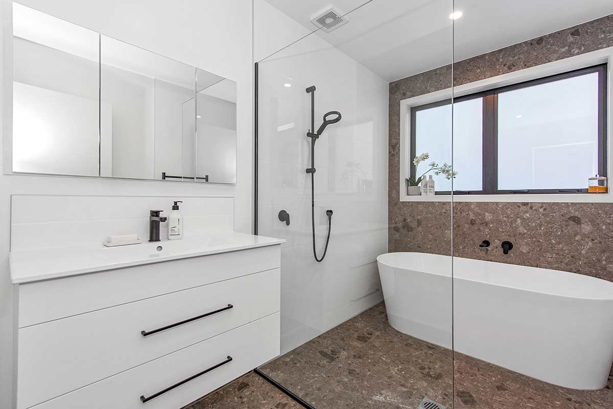 Tiled bathrooms featuring a freestanding bath in the main bathroom along with Robertson’s vanities and tap ware completes the look.