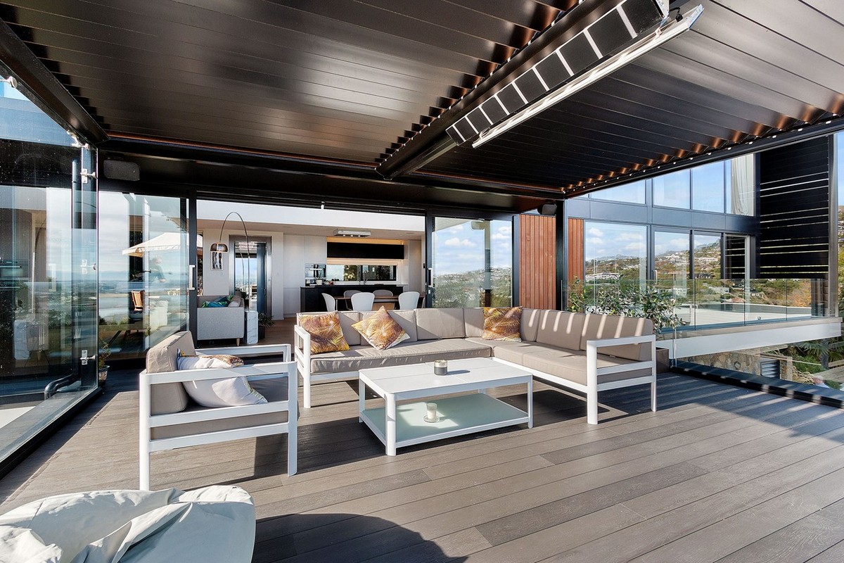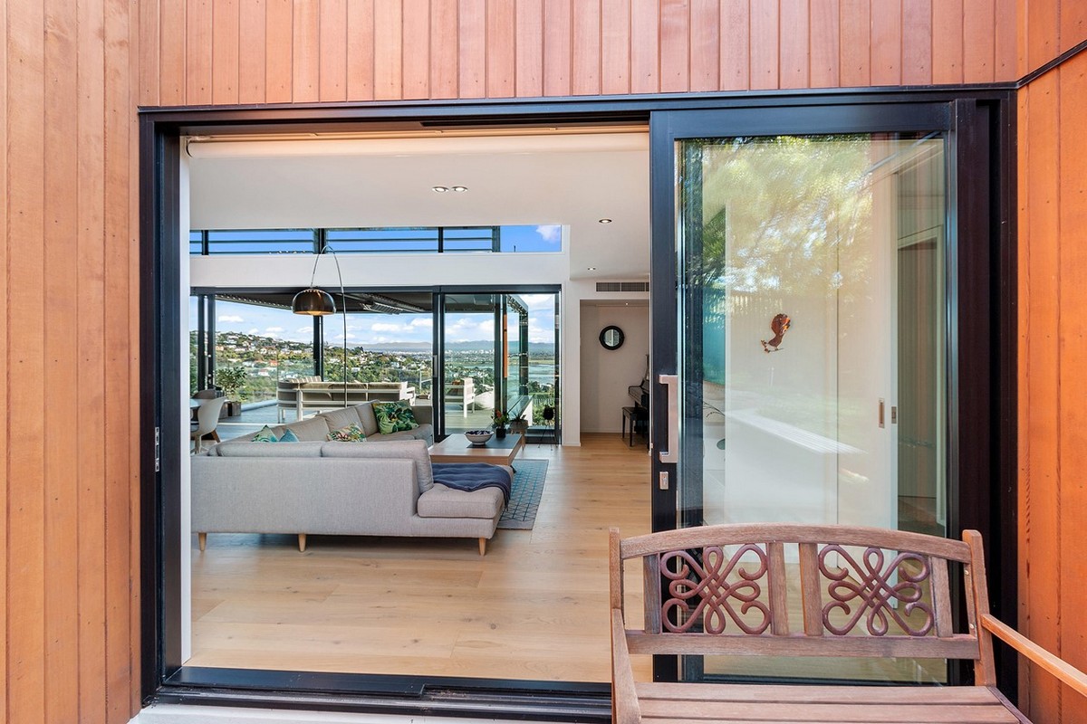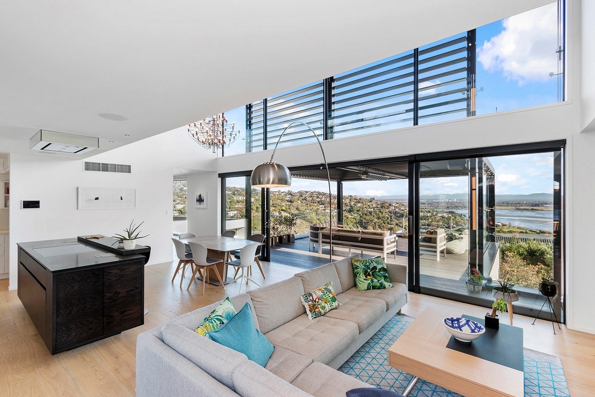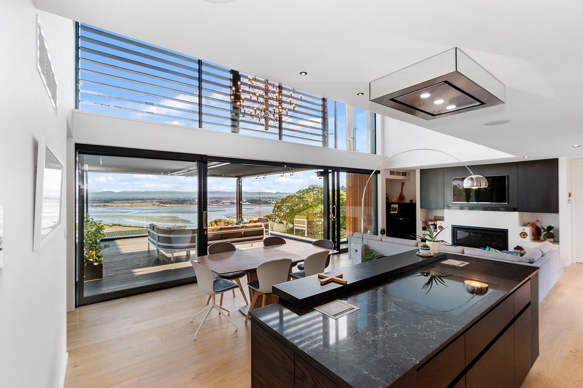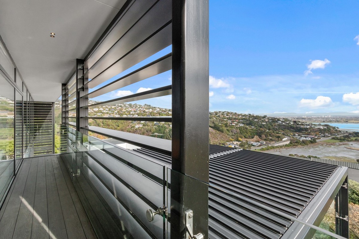 Exceptional outdoor living options offer refuge from prevailing winds without compromising the incredible outlook. Structured glass, louvres and a clever arch have helped to achieve this.