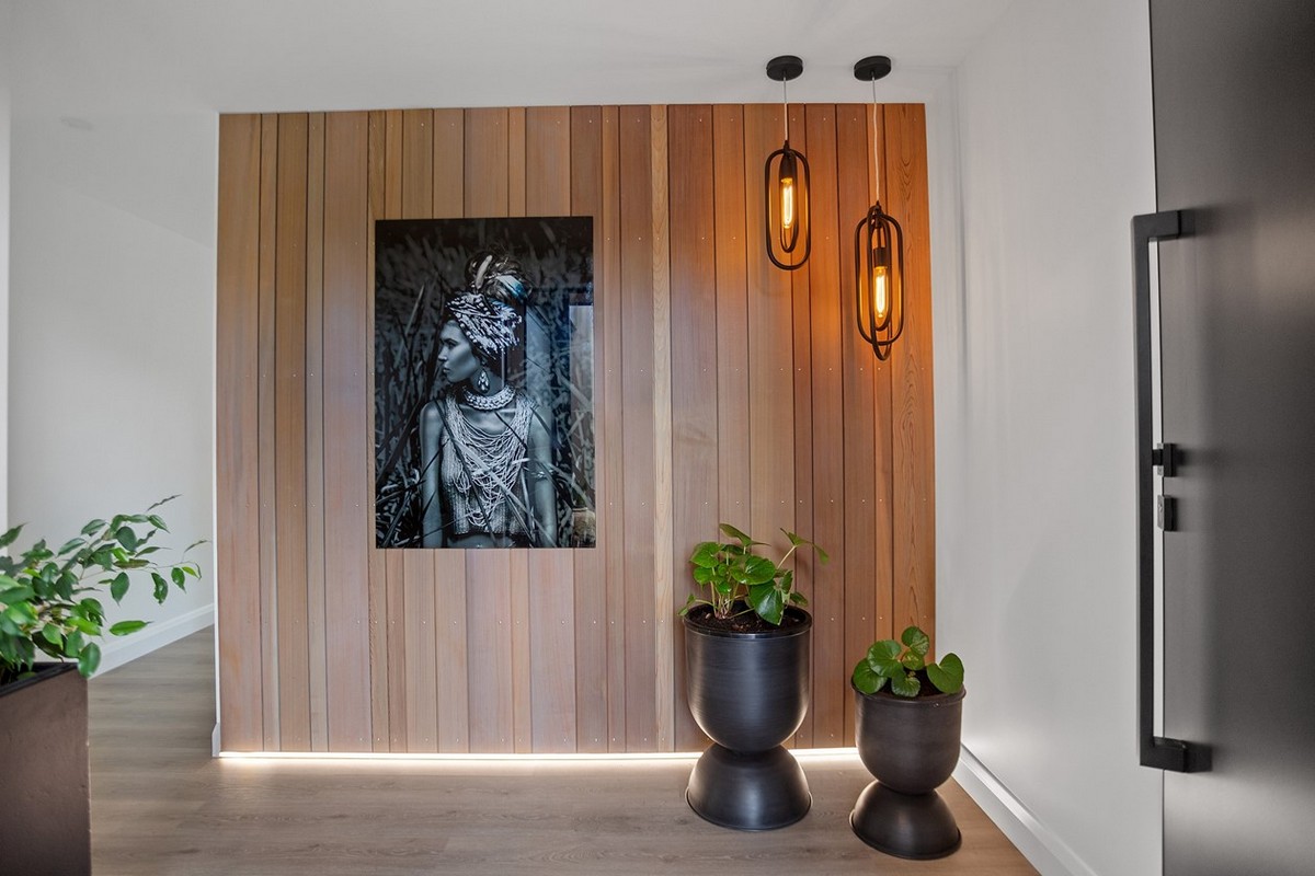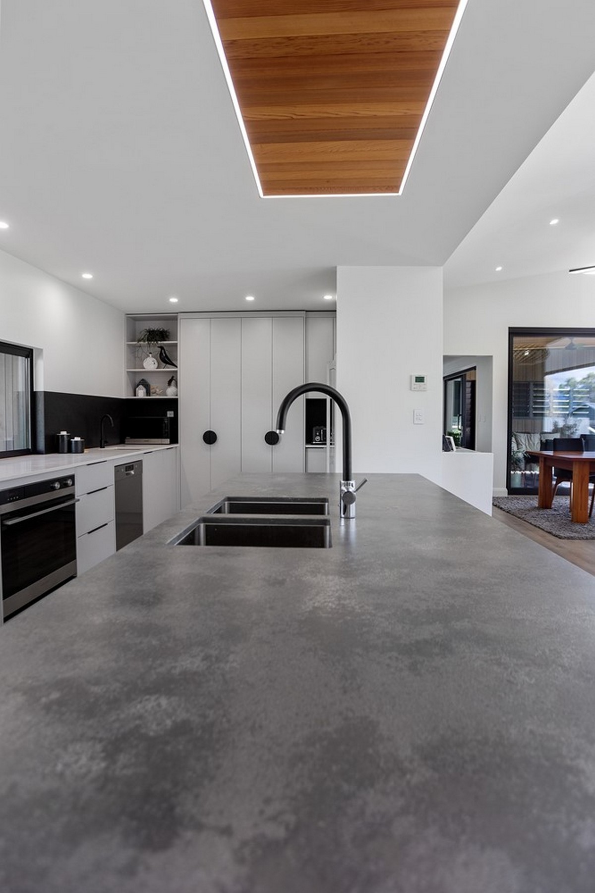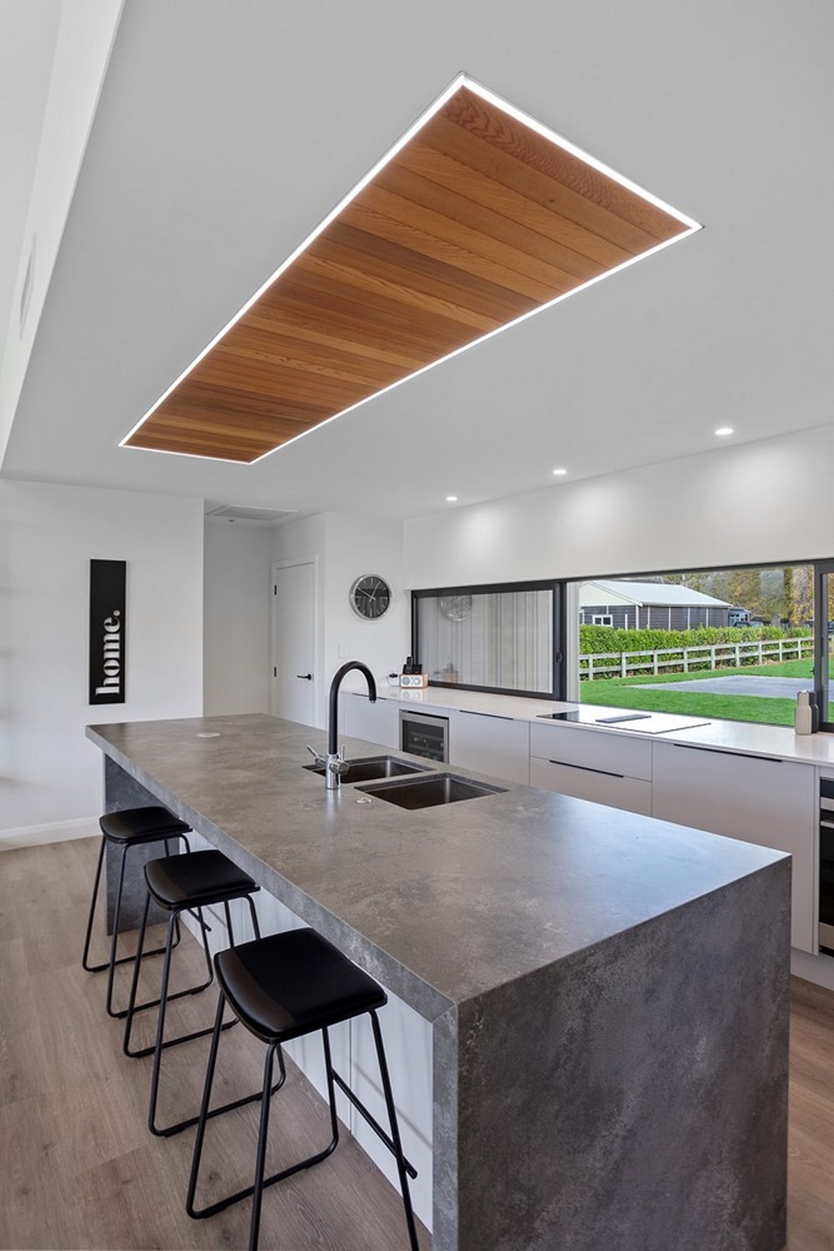 Even the kitchen features cedar panelling in the centre of the roof and lined with LED lights, matching the bottom edge of the front entrance wall.