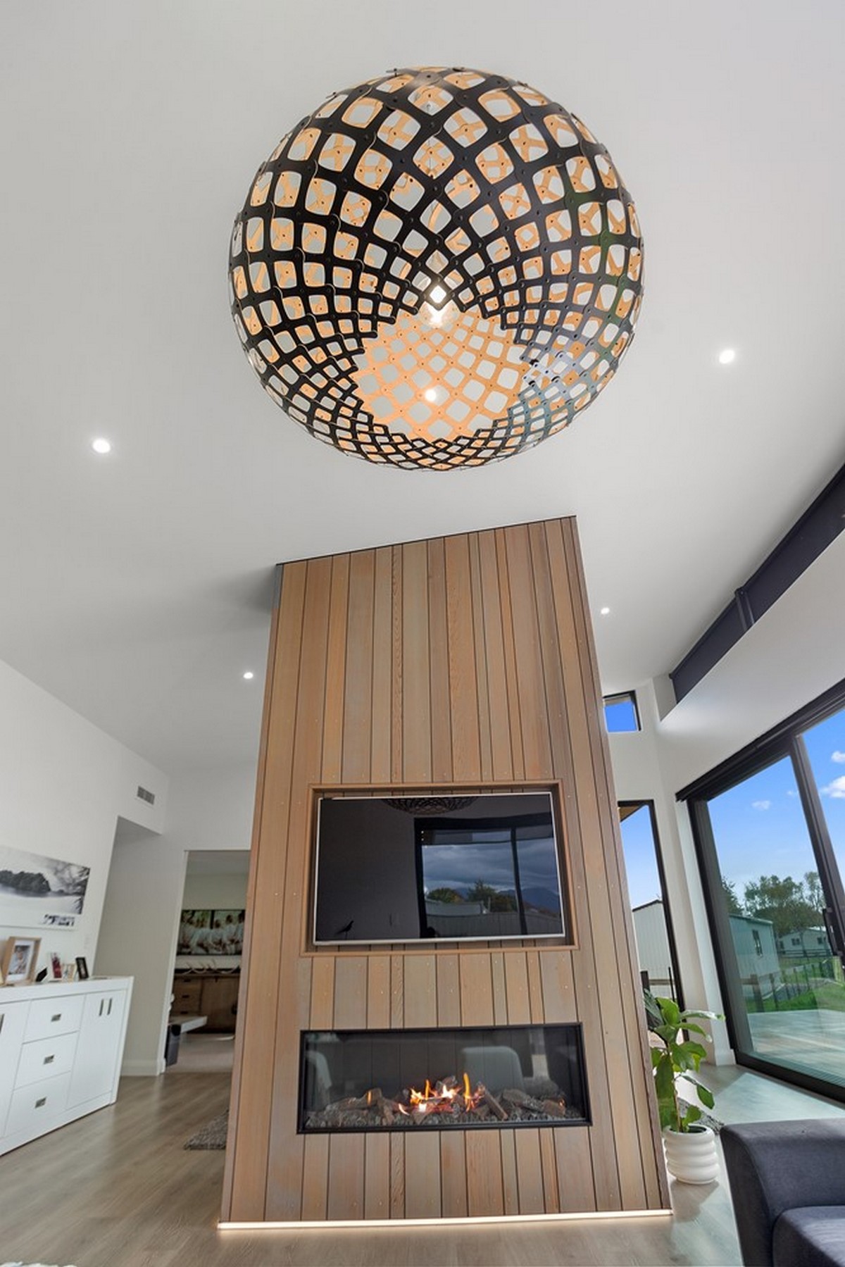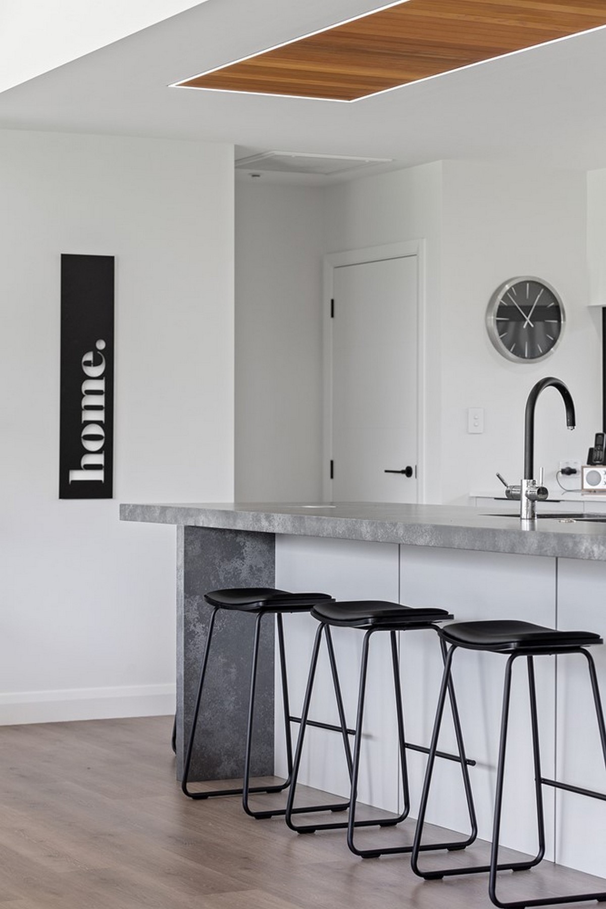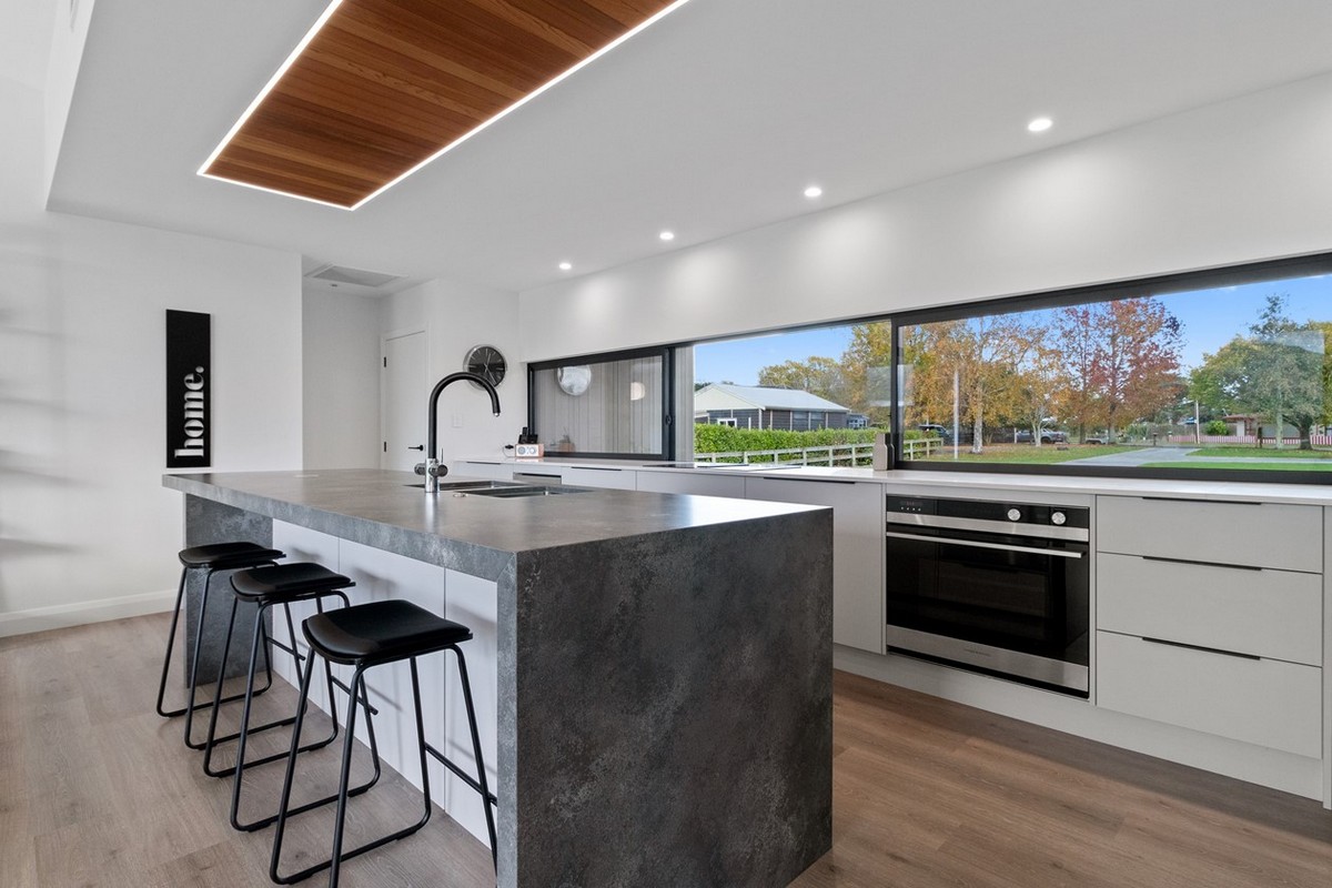 Even the kitchen features cedar panelling in the centre of the roof and lined with LED lights, matching the bottom edge of the front entrance wall.