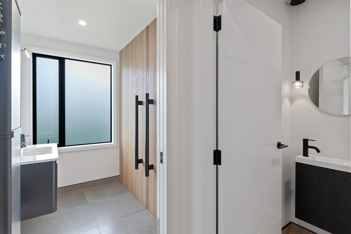 A bold Western Red cedar wall with a random profile greets you inside the front entrance of this superbly built home.
