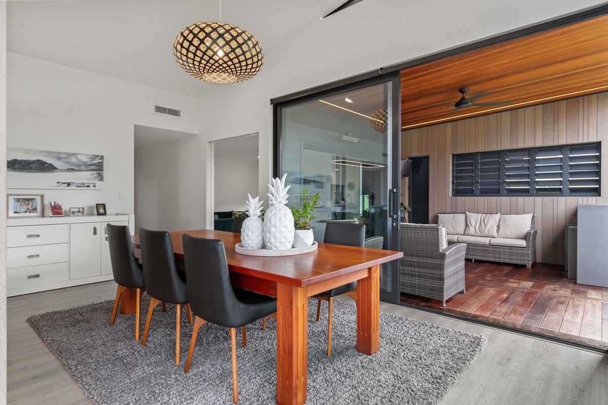 Large floor-to-ceiling windows and doors 8.5 metres wide by 2.5 metres high open up this house to the elements, so that it’s hard to tell where the inside ends and the outside entertaining area begins.