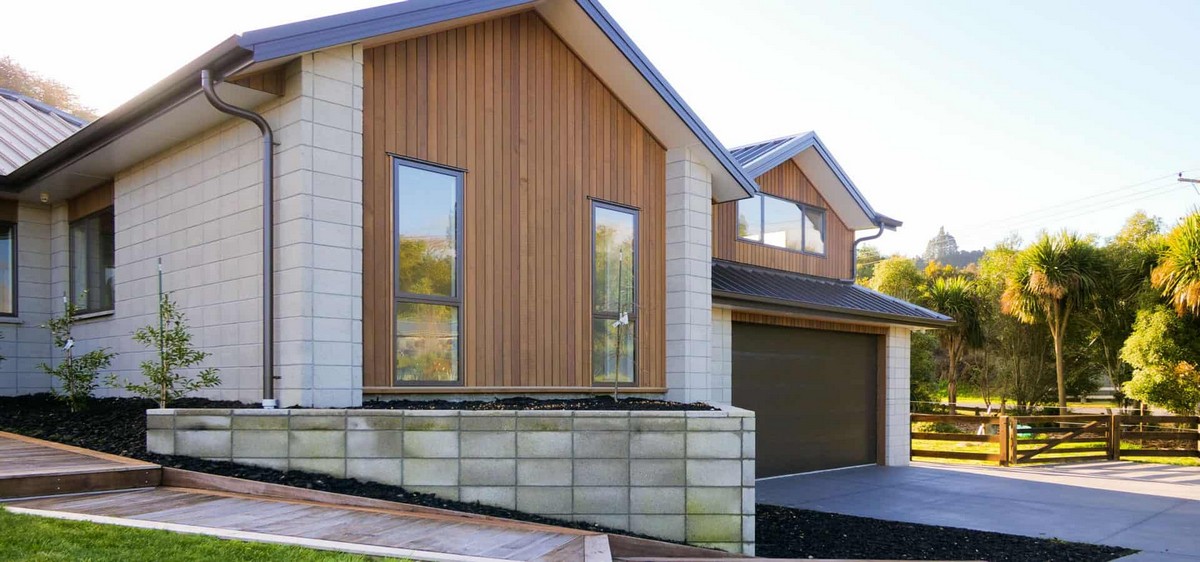 Shot blasted Bowers block and cedar provide a very contemporary high-end exterior finish, while the cedar is also featured inside to give a seamless indoor outdoor flow. The stretched block is mostly stack bonded creating wonderful clear lines.