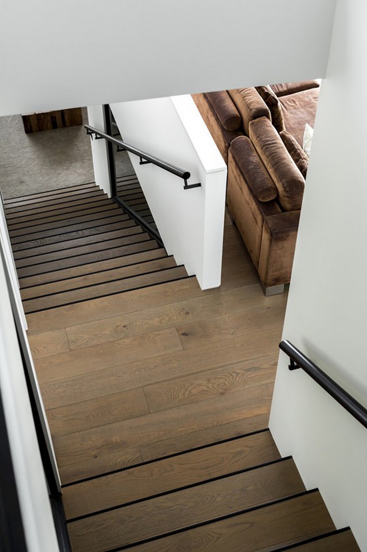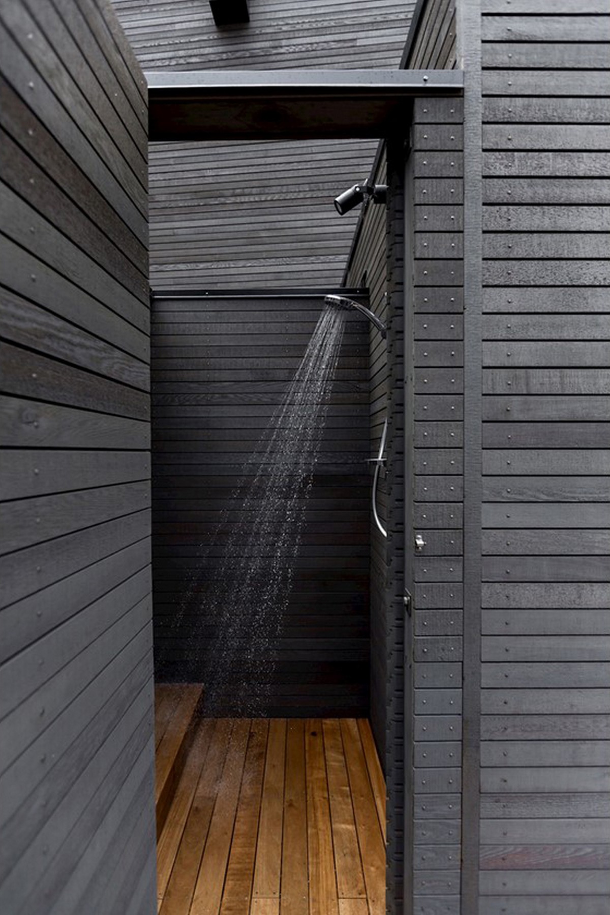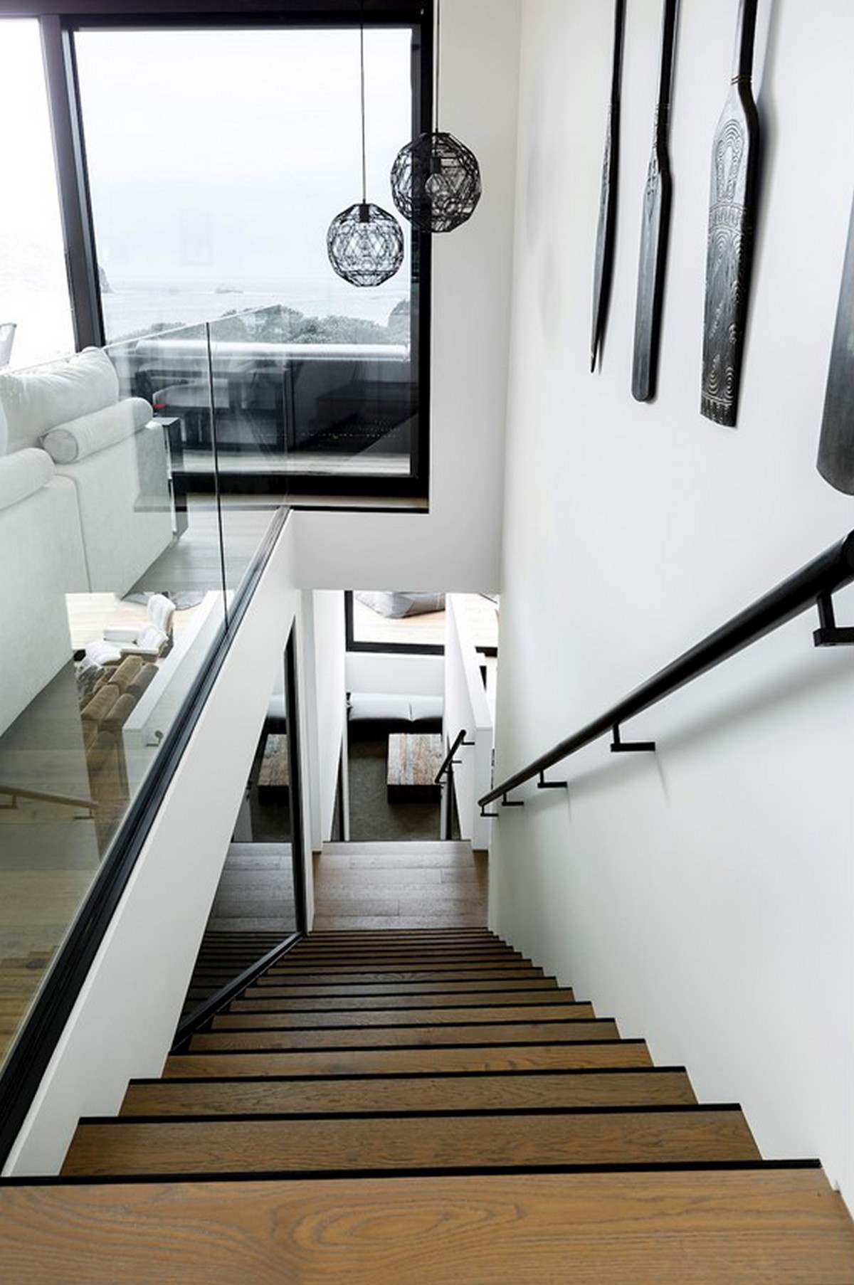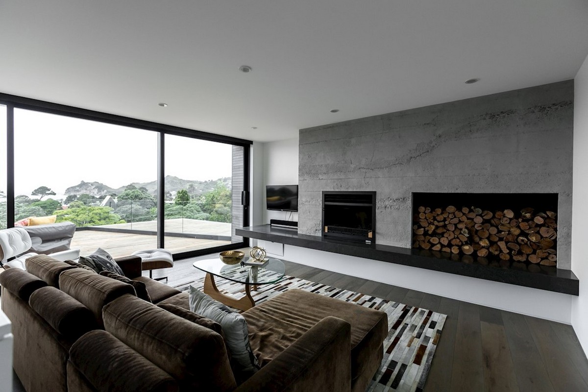 The artisan craftsmanship continues inside the home. A raw, rugged concrete wall houses an immense fireplace and stacked firewood become a piece of art, even competing with the green canopy visible from the adjacent window. An internal staircase has walls of glass, letting nature step inside. An outdoor shower is a cavern of privacy and surrounds the occupant in luxurious wooden panelling.