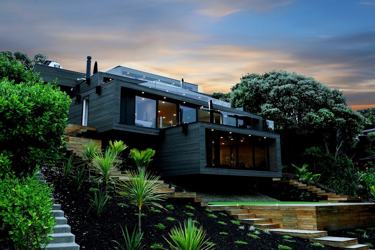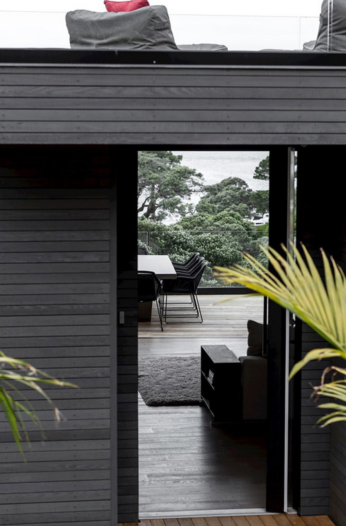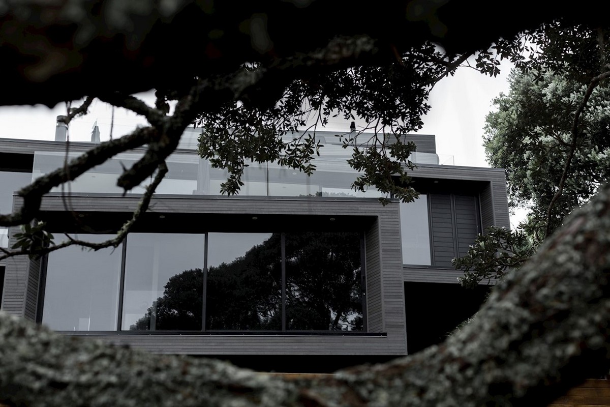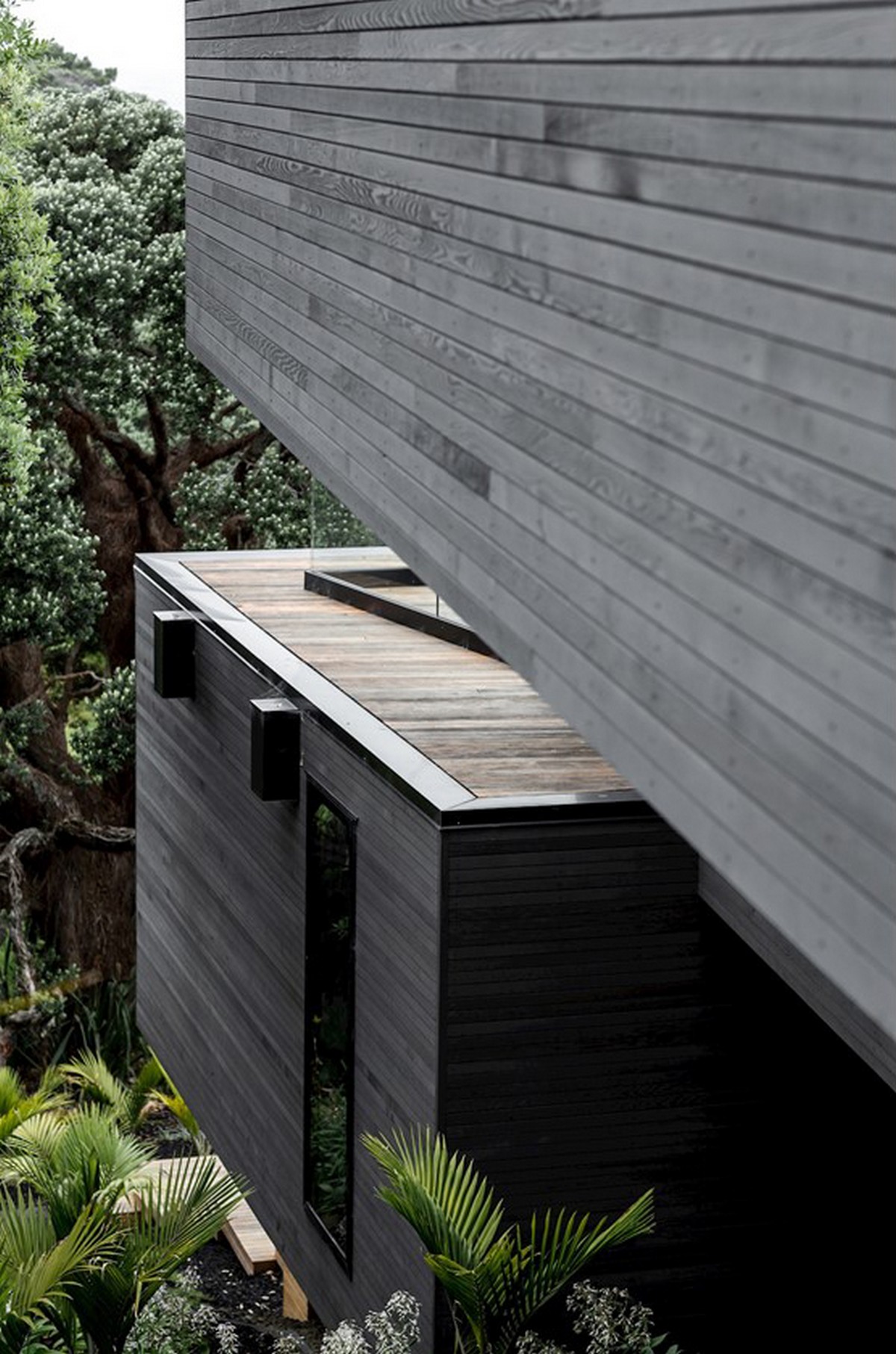 The holiday home looks simple at first glance, four floating pavilions sit lightly on the whenua. This has been achieved by Cove Construction overcoming the steep topography with support structures that mimic the rugged beauty of the surrounding pohutukawa trunks, ancient and majestic in form. The house positions itself down the slope in a cascade of stacking blocks, slightly askew and using meticulous structural engineering to ensure the finish compliments the natural surroundings. The exterior is wrapped in blackened cedar batons, laid with precision and adding another geometric dimension to the structure.
