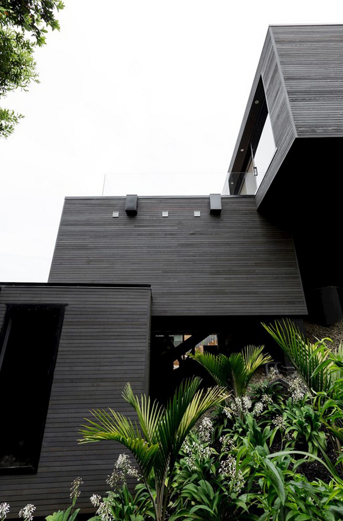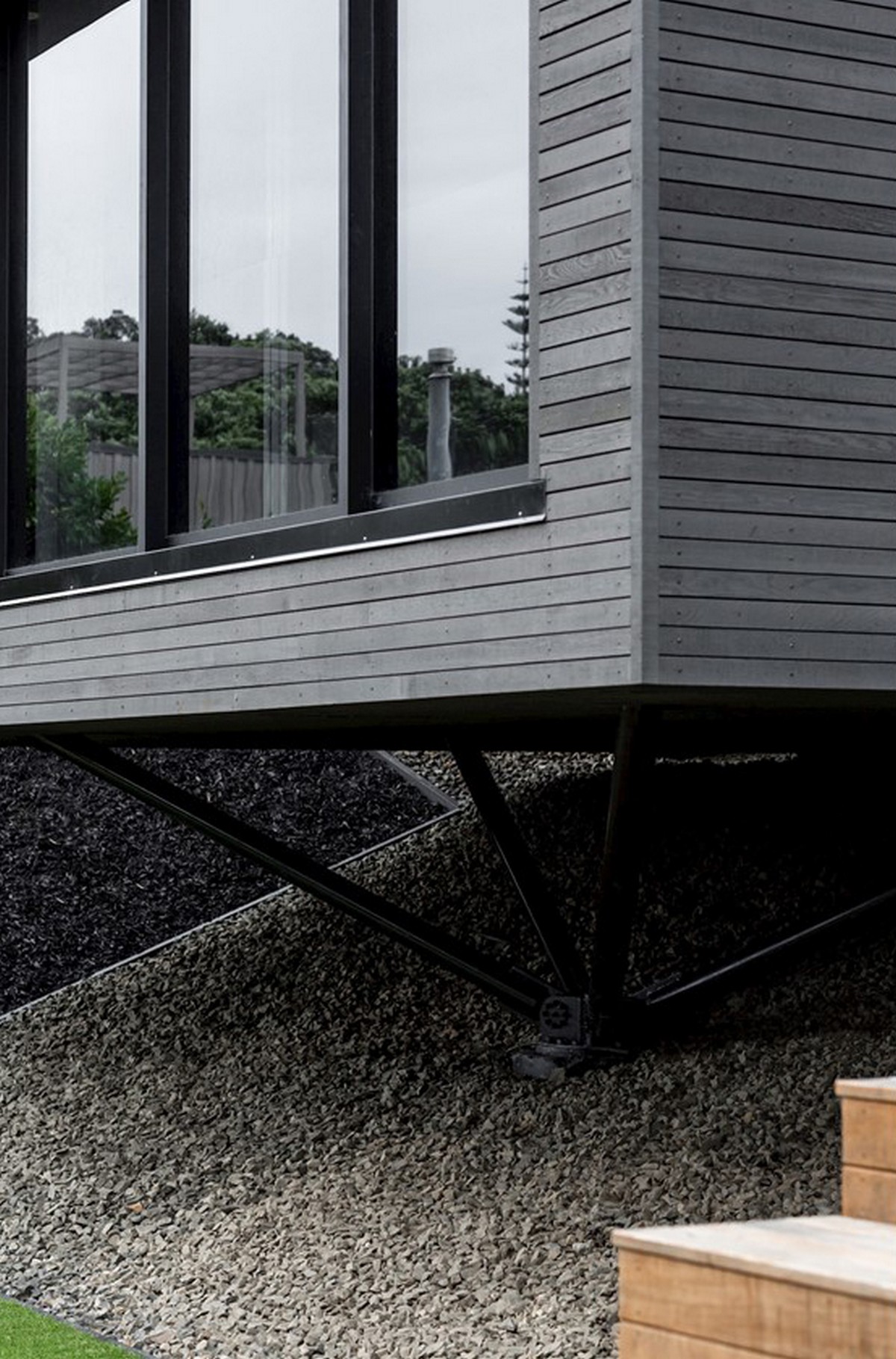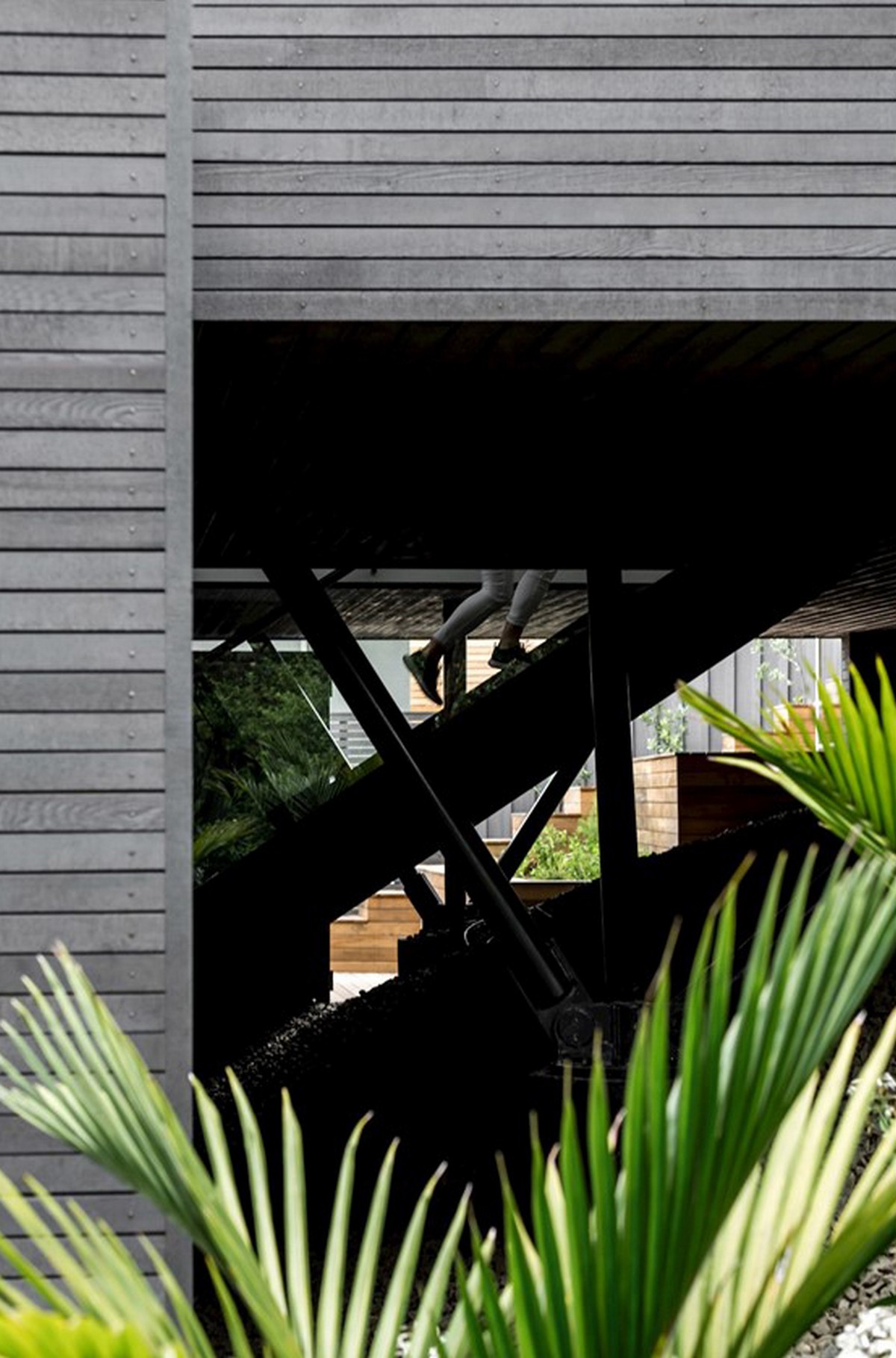 The holiday home looks simple at first glance, four floating pavilions sit lightly on the whenua. This has been achieved by Cove Construction overcoming the steep topography with support structures that mimic the rugged beauty of the surrounding pohutukawa trunks, ancient and majestic in form. The house positions itself down the slope in a cascade of stacking blocks, slightly askew and using meticulous structural engineering to ensure the finish compliments the natural surroundings. The exterior is wrapped in blackened cedar batons, laid with precision and adding another geometric dimension to the structure.