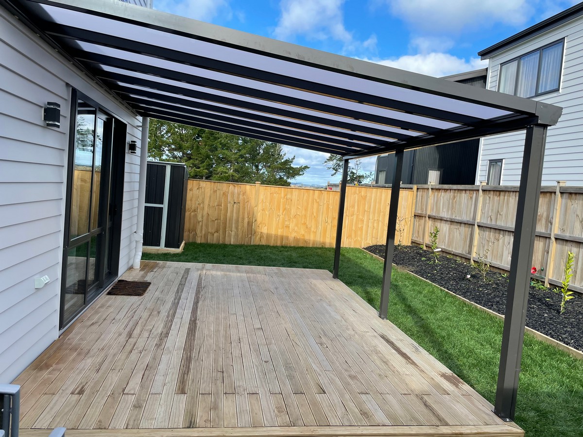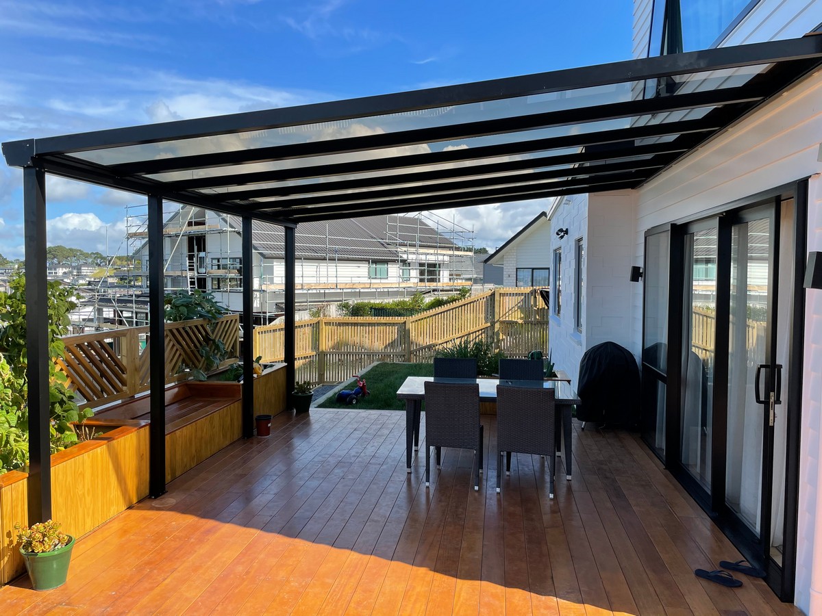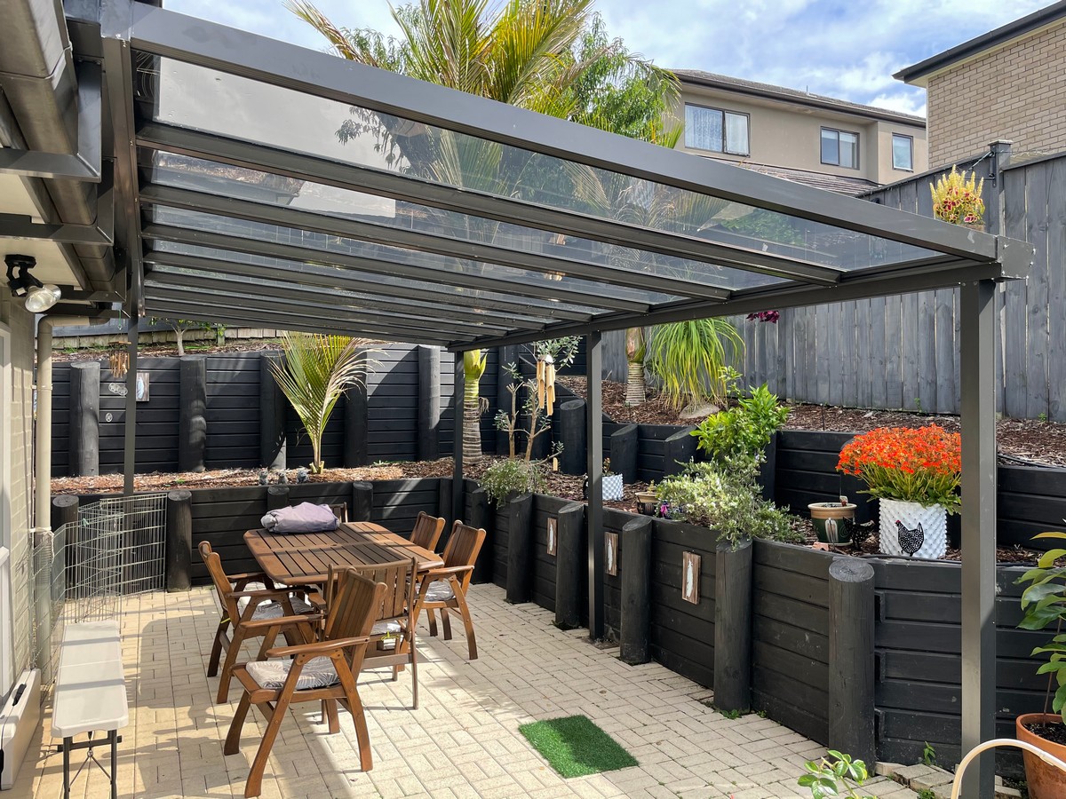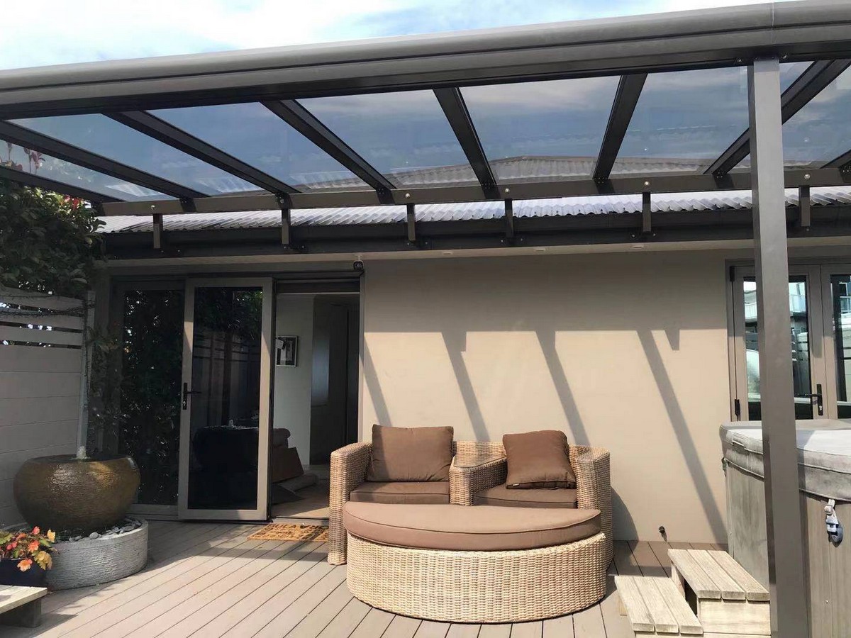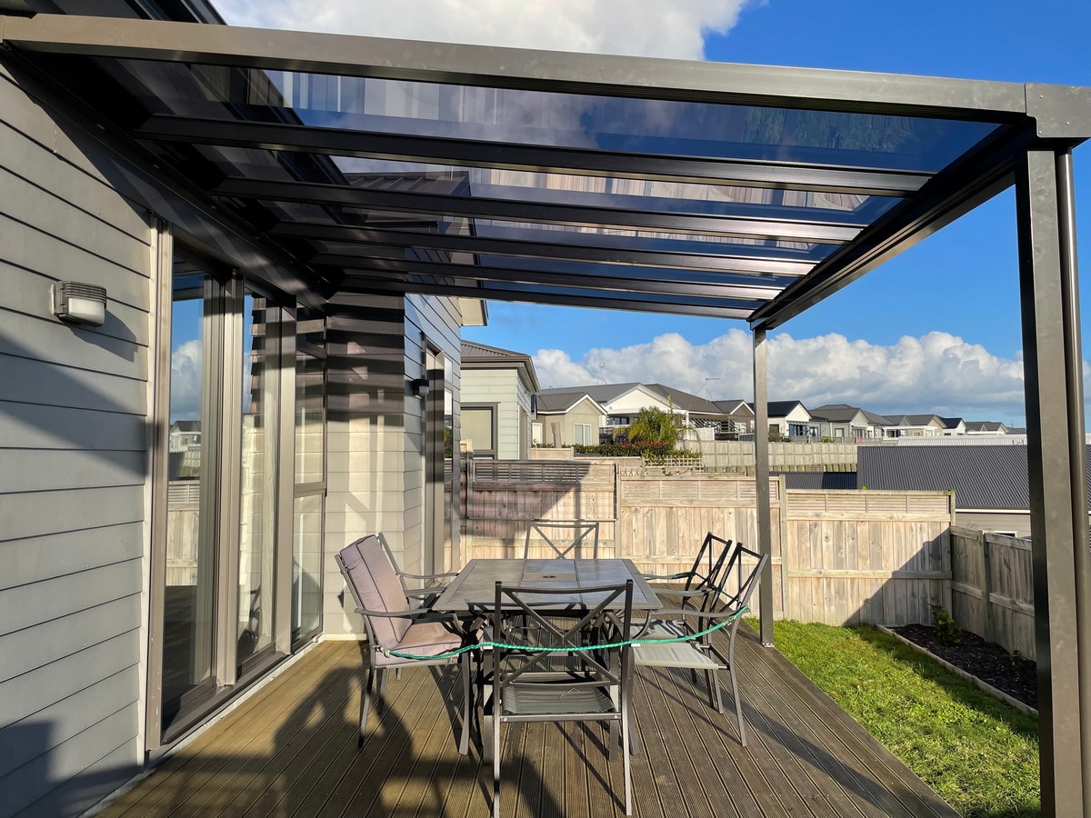 Smart Shade NZ is one of the installers of TransroofTM , which also features a solid flat clear polycarbonate sheet roof for a clear view. Canopy Tech owner Ray Zhuang said outdoor living area is become more important then ever, “it is another heart of the house.” He believes timber structures with corrugated sheet roofing shelters have become outdated, and new aluminium structures are now dominating the market. The design of the hard roof canopy (flat sheet roofing) is simple but modern, complementing the ever-changing New Zealand housing market.
