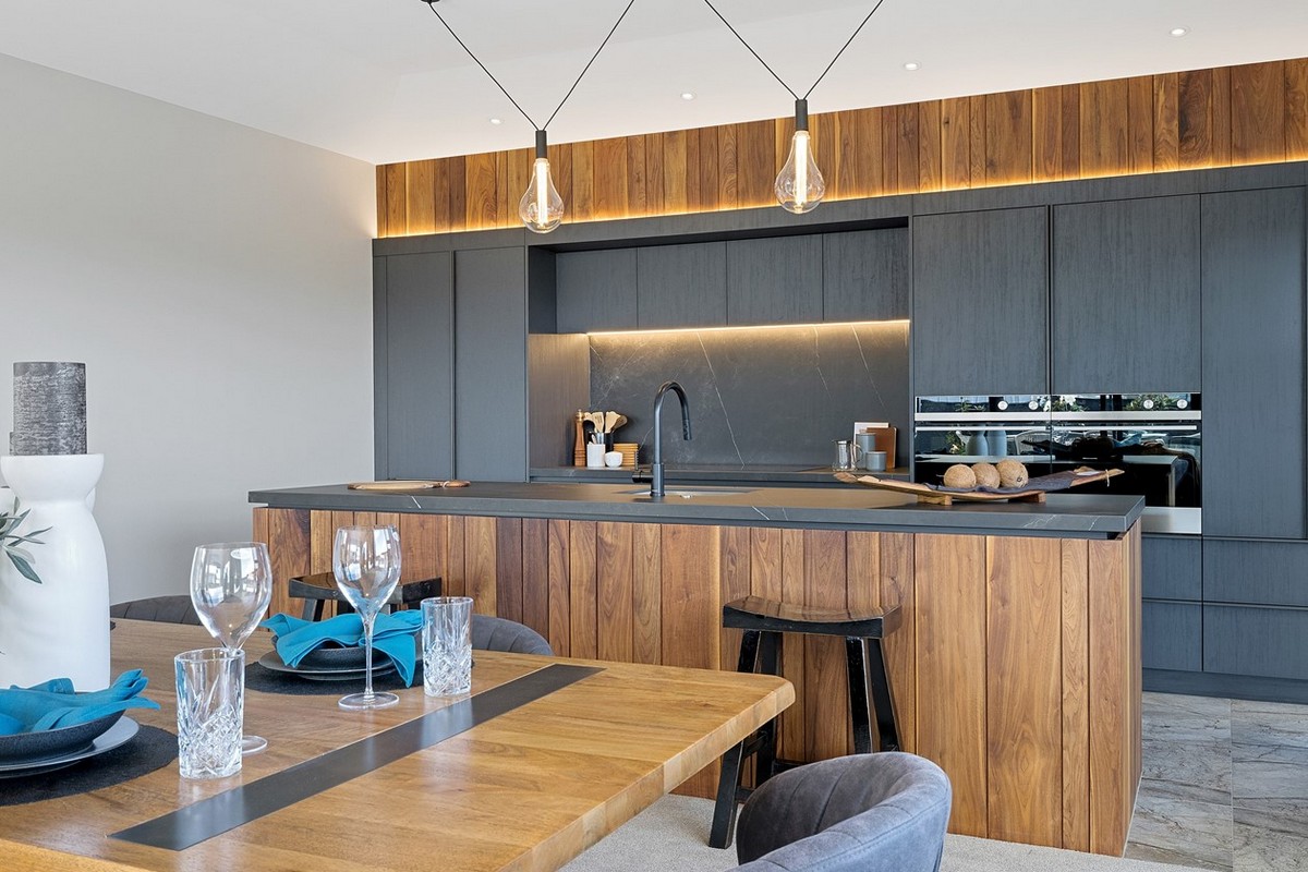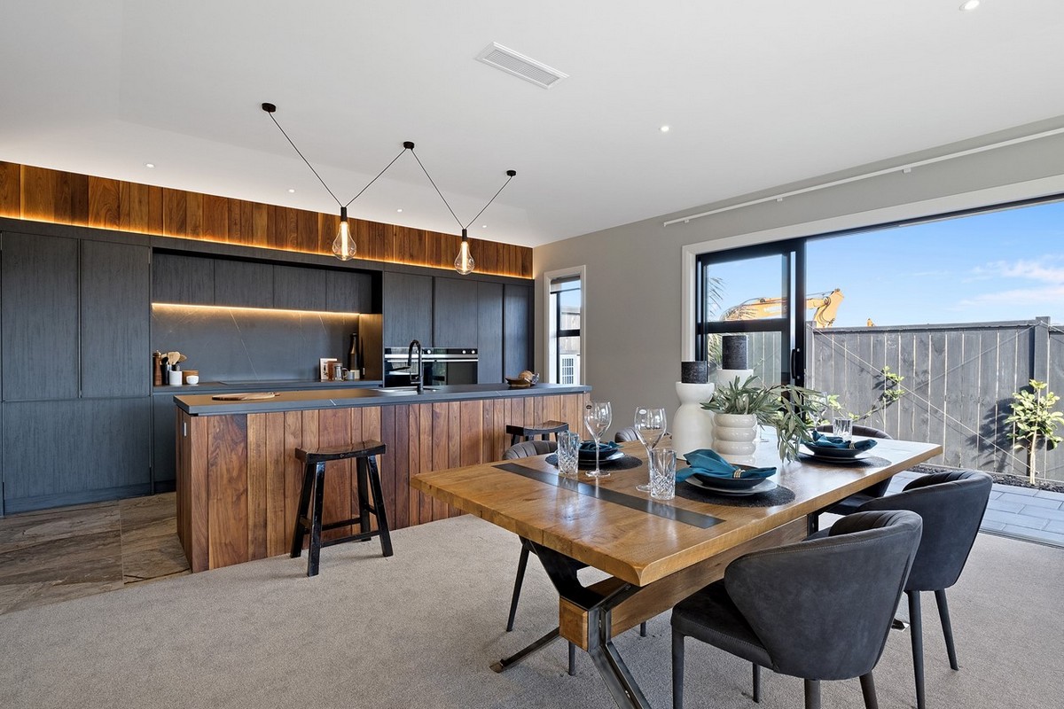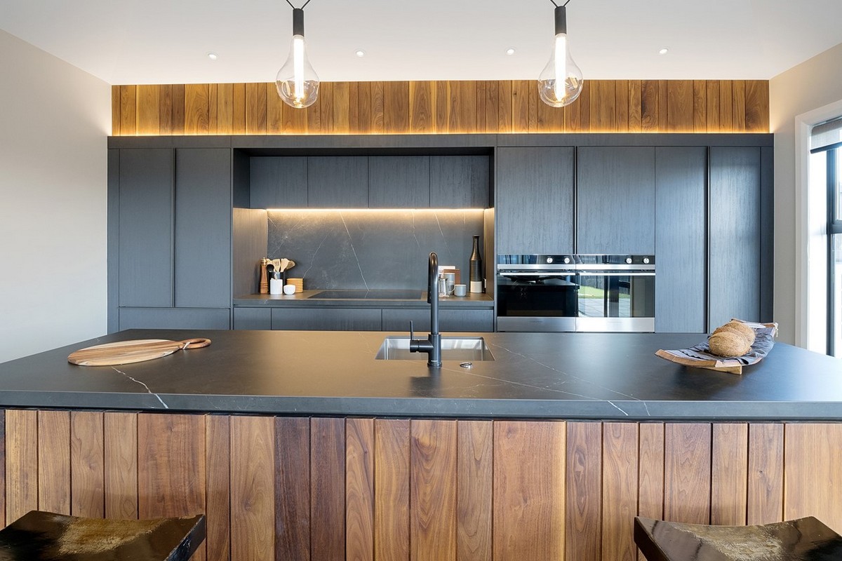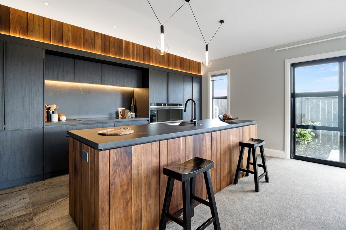 In the shared living and entertainment zone beyond, the elegant kitchen commands attention. Dark cabinets contrast with an island of rich wood, echoing the home’s façade. The splashback and countertops are cleverly crafted from tiles that add movement while strip lighting highlights the cool, modern profile.
