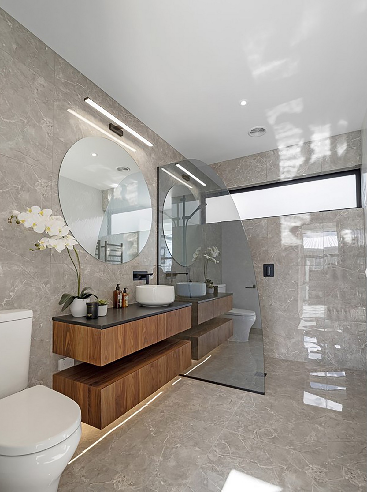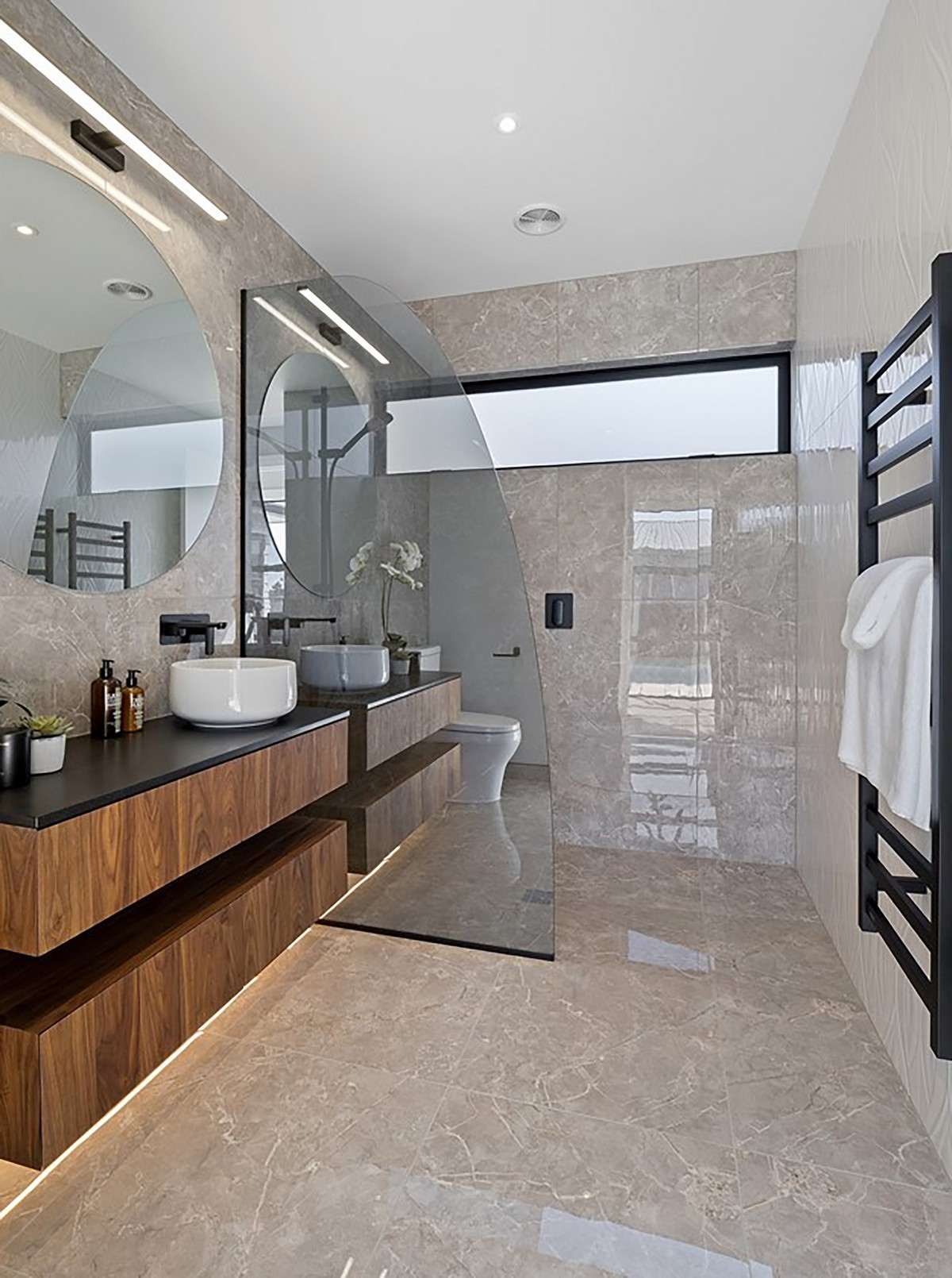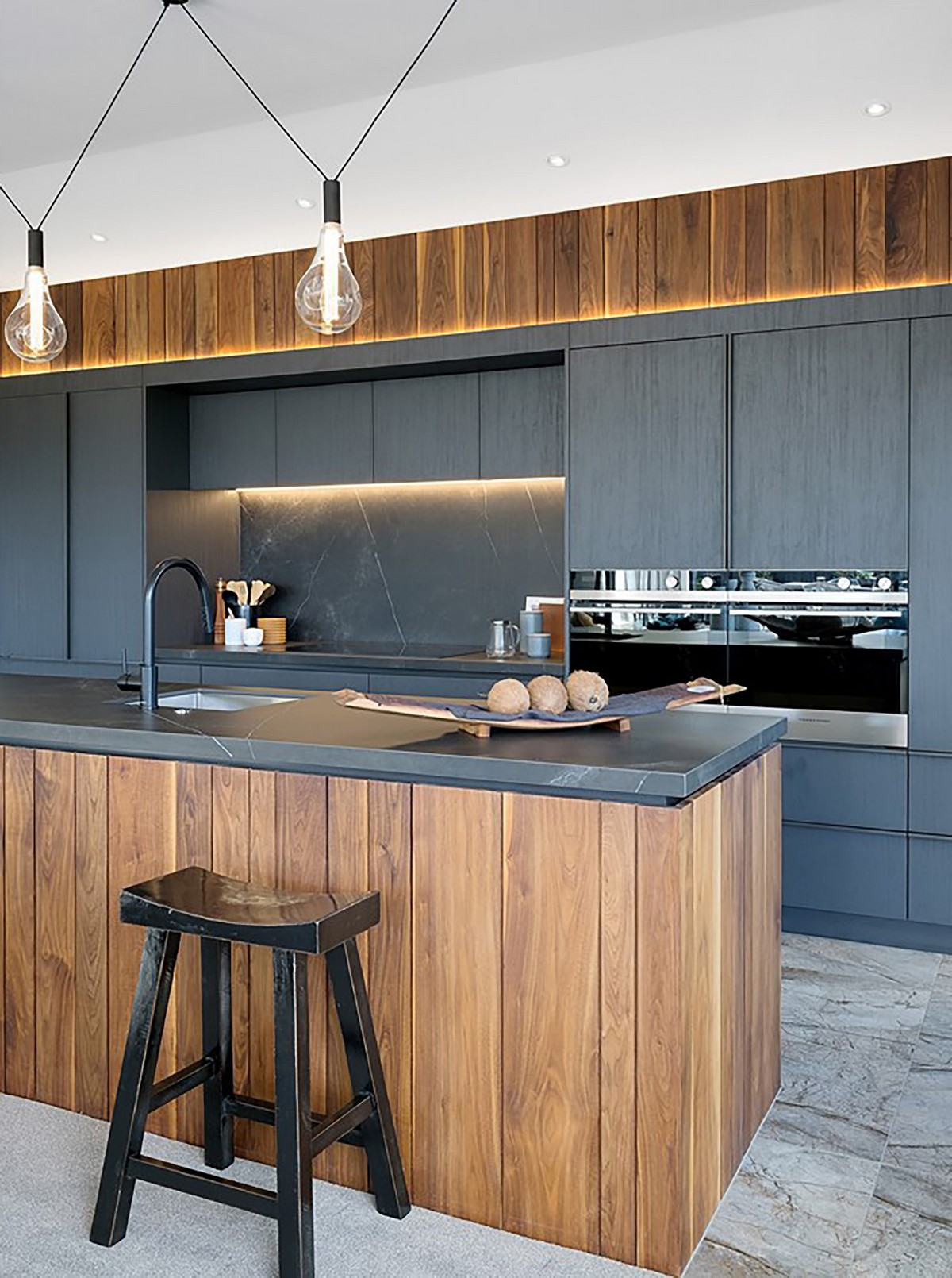 In the shared living and entertainment zone beyond, the elegant kitchen commands attention. Dark cabinets contrast with an island of rich wood, echoing the home’s façade. The splashback and countertops are cleverly crafted from tiles that add movement while strip lighting highlights the cool, modern profile.