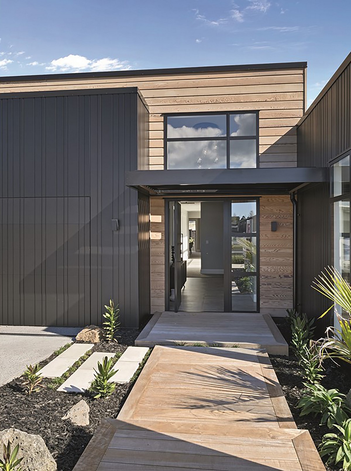 A suburban sanctuary and light-filled oasis that delights at every turn, Nu-wall aluminium cladding and rusticated cedar form a striking façade, the flush-mounted garage door concealed within the grooves. Contrasting colours and textures mixed with lush designer landscaping in a stunning statement to the street.