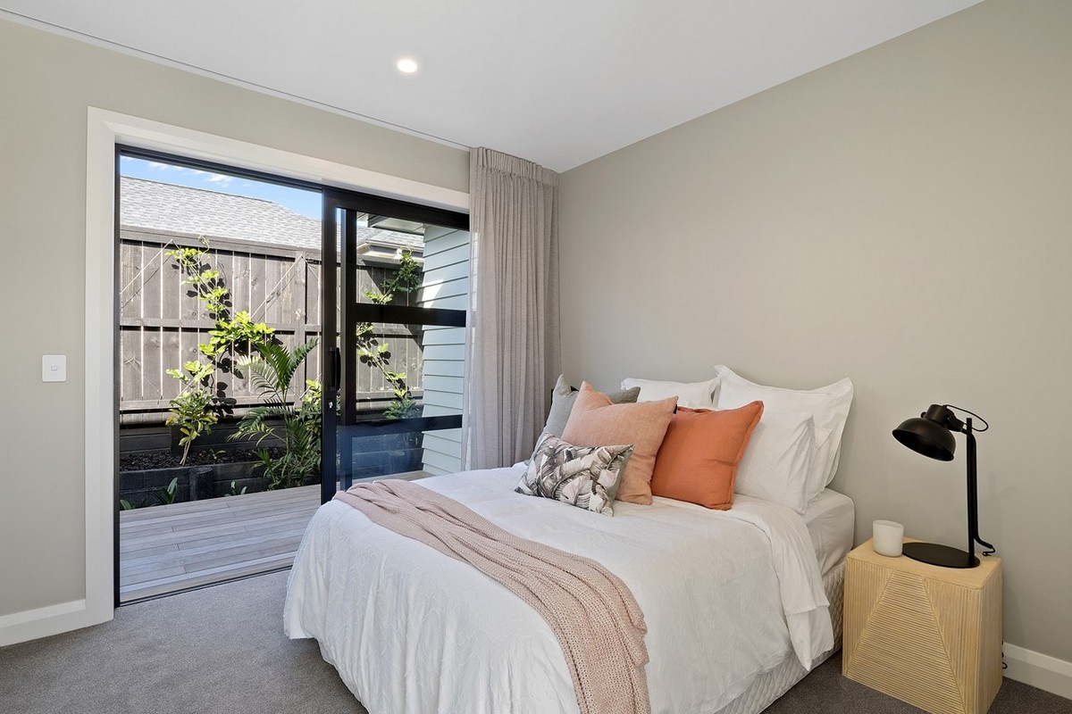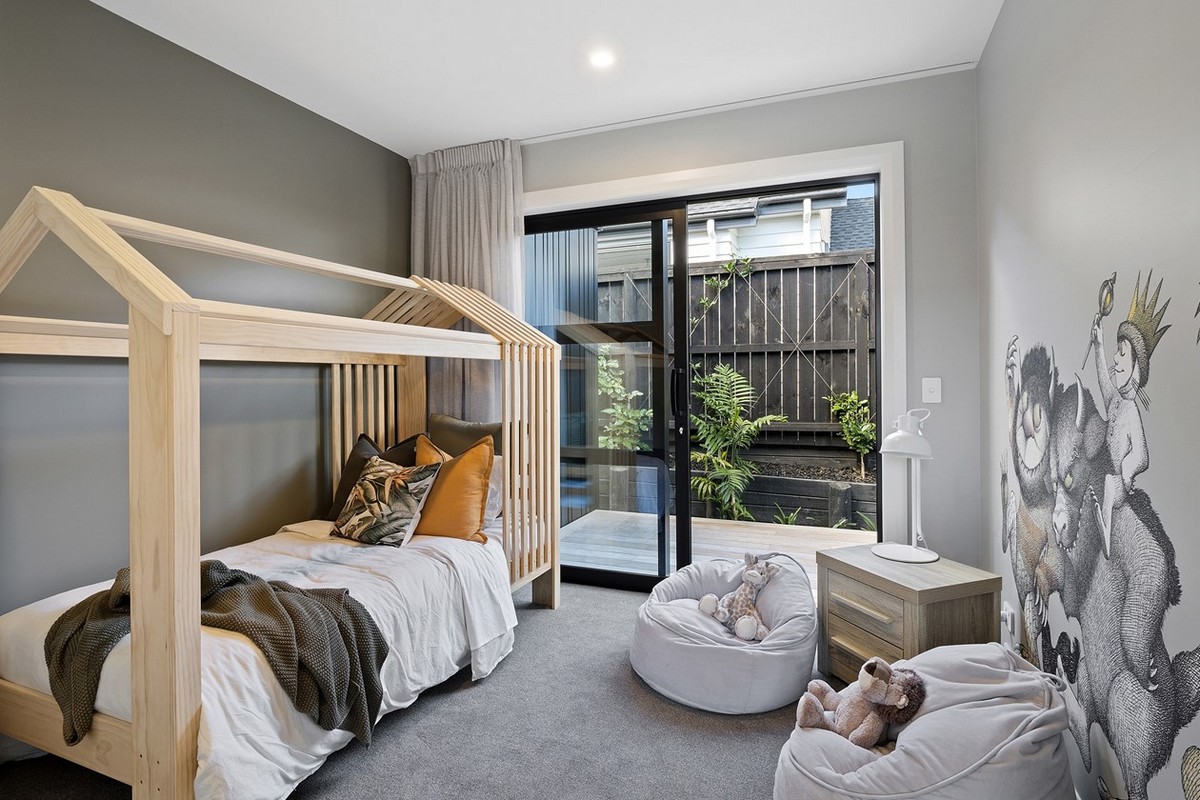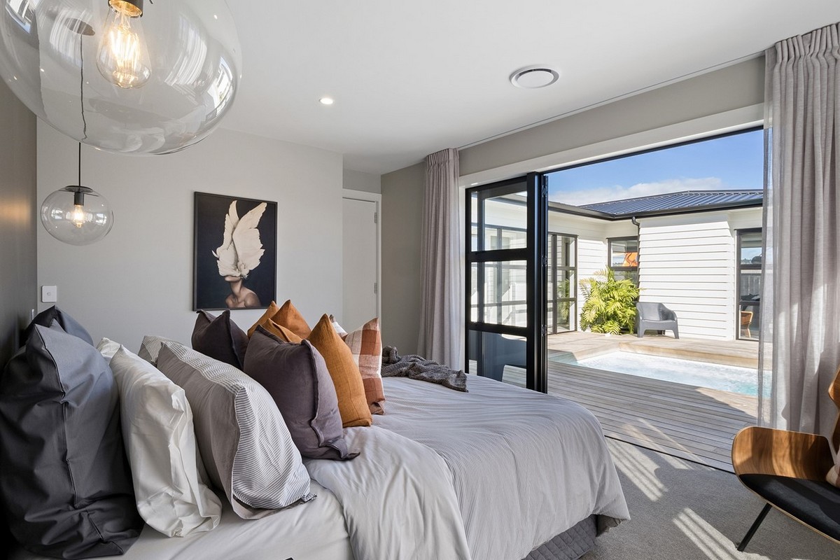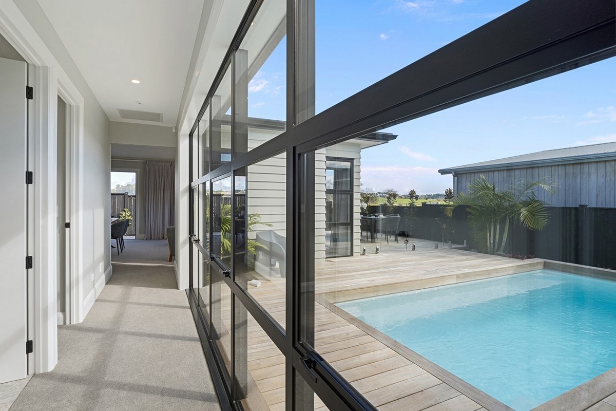 In the family bathroom an above-bench basin and bespoke cabinetry is finished with finesse. The glazed hall delights with further views of the pool. At the end a sliding door helps to separate and soften sound.