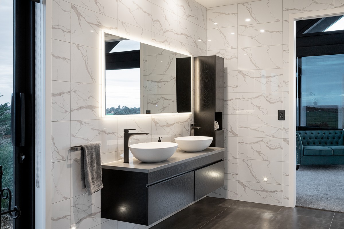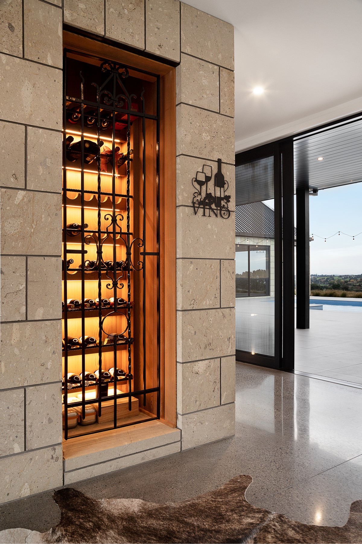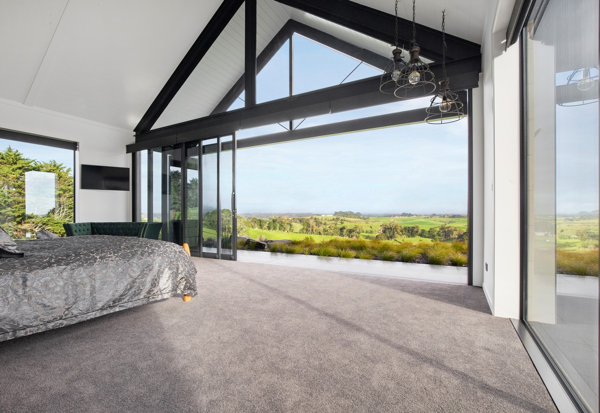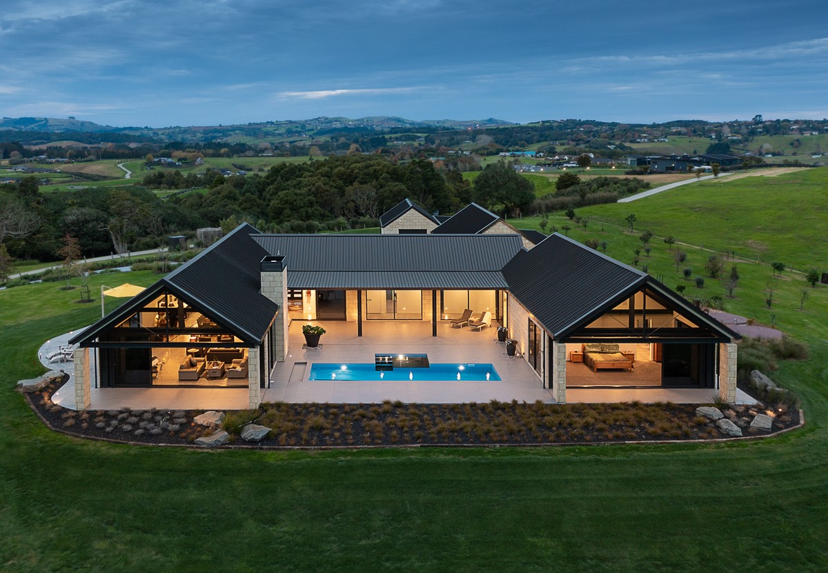 Built by Mark Price Builders, this large lavish 590sqm home situated between the Bombay Hills and Pukekohe is elevated just enough for expansive views out every window.