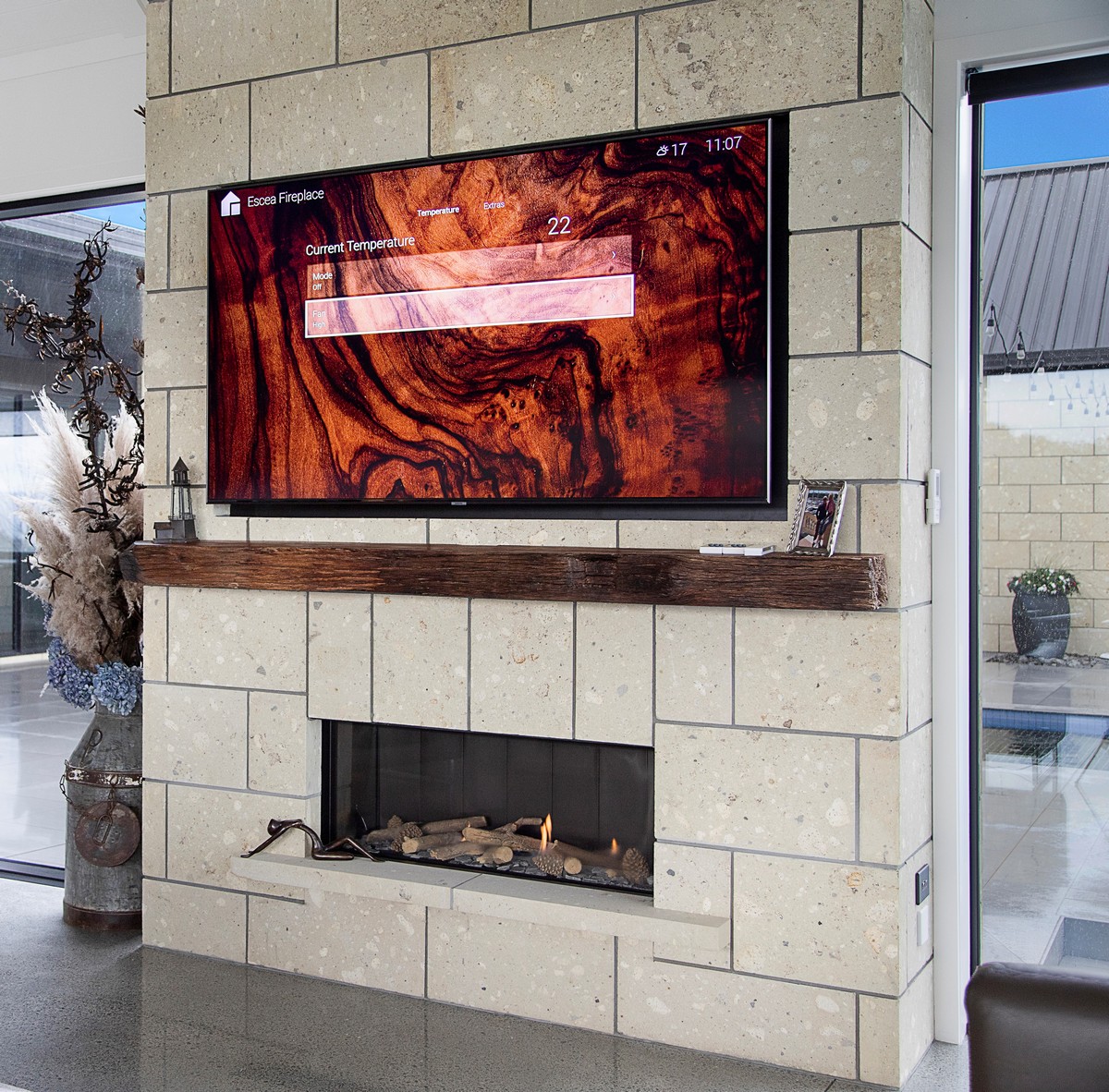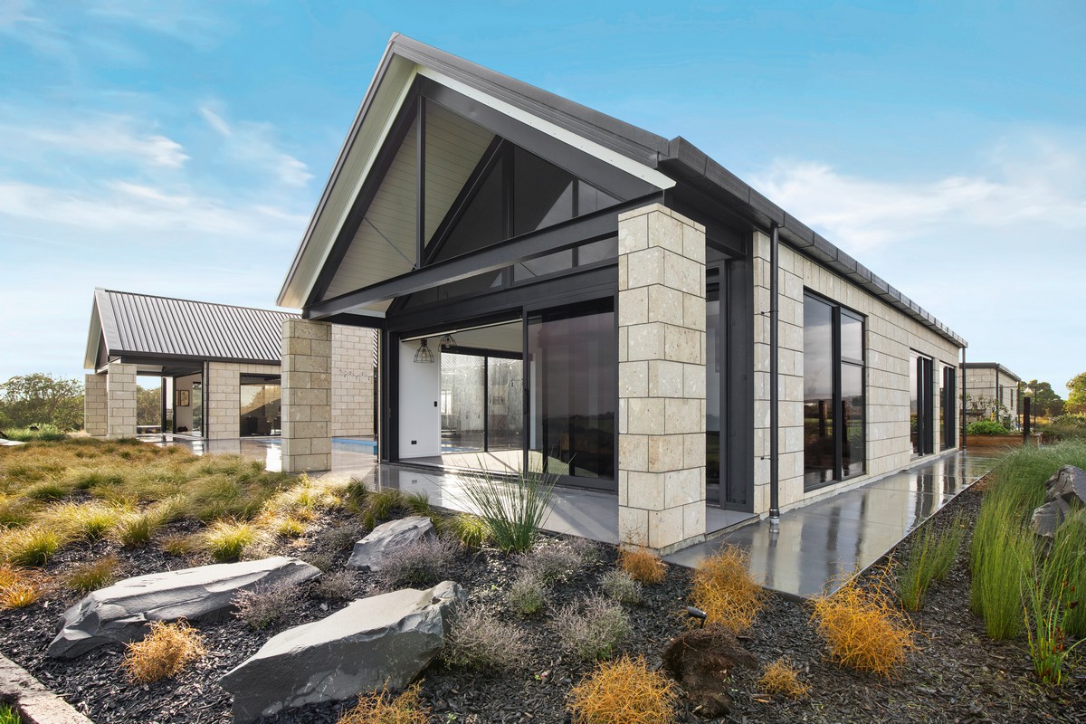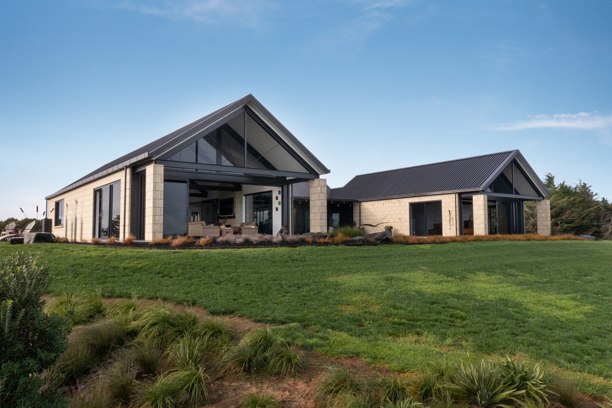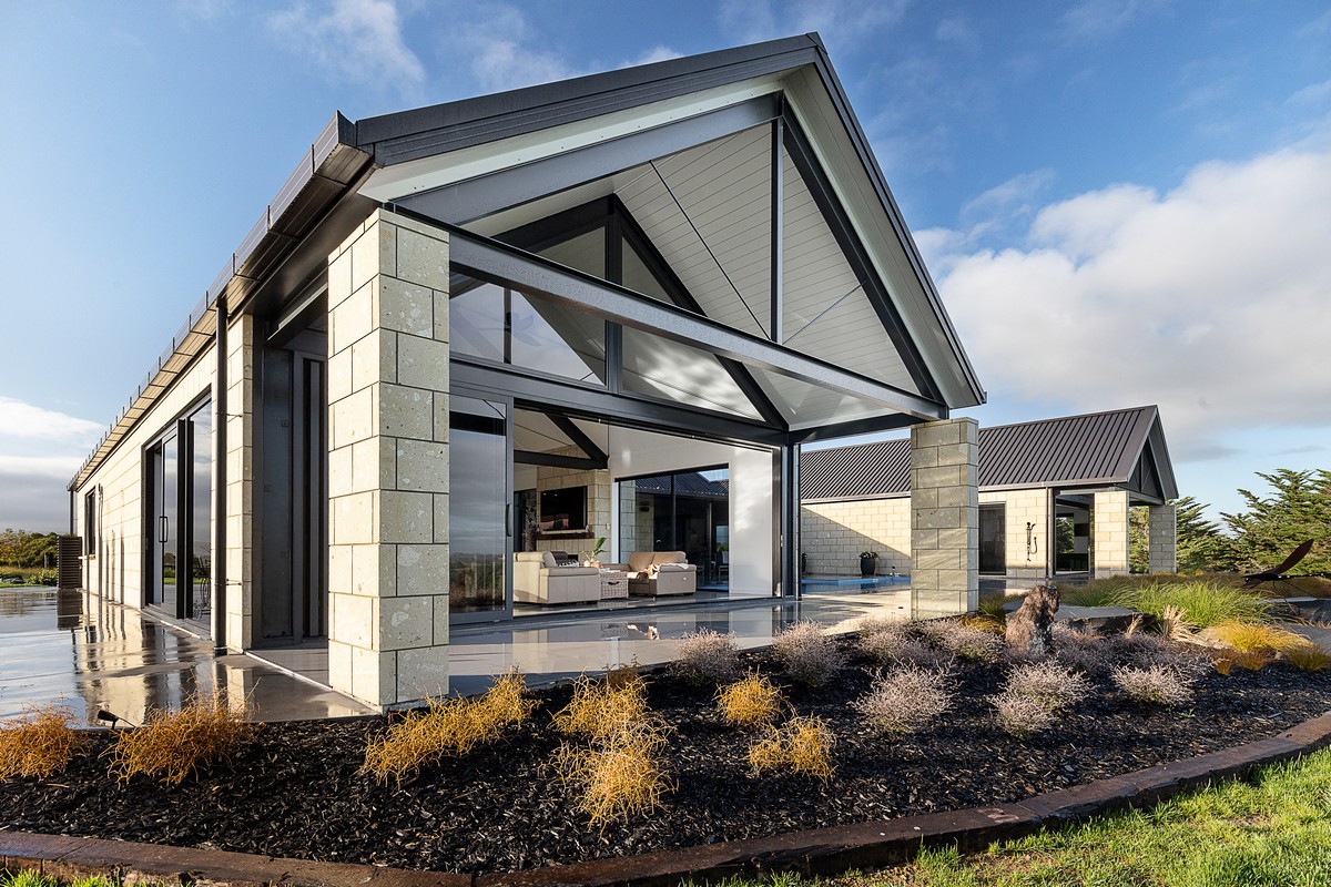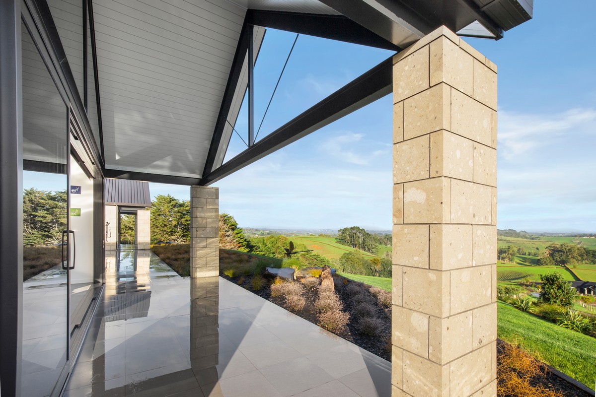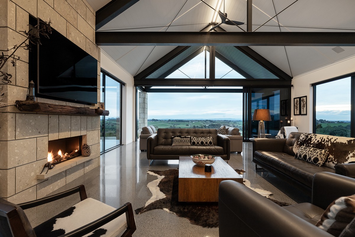 Built of natural rock Hinuera Stone and steel, the only exposed timber in this home is the Totara straining post from the farm, under the television in the lounge used as a hearth.
