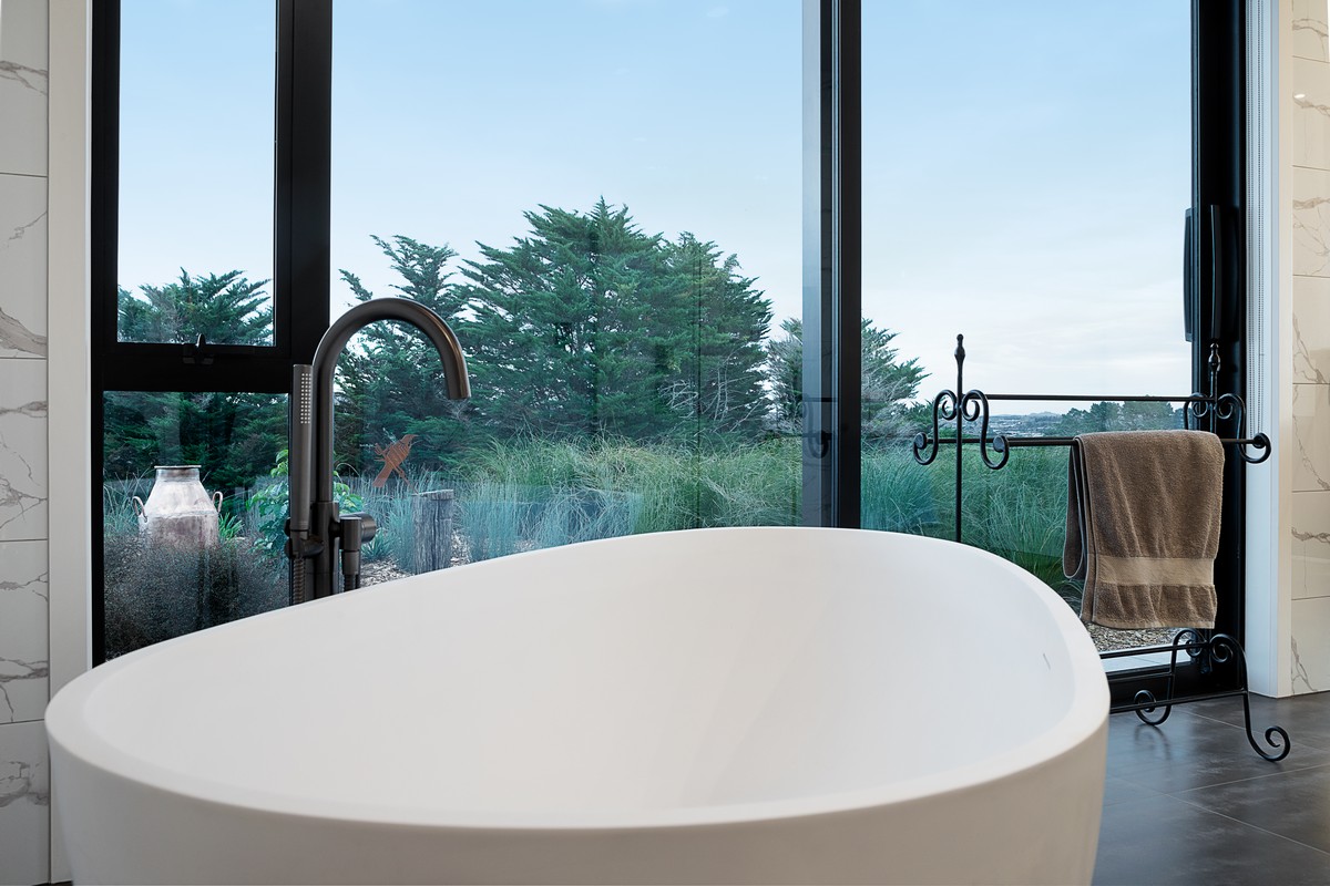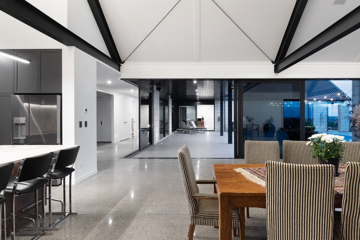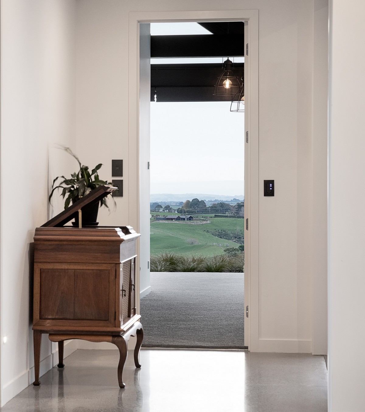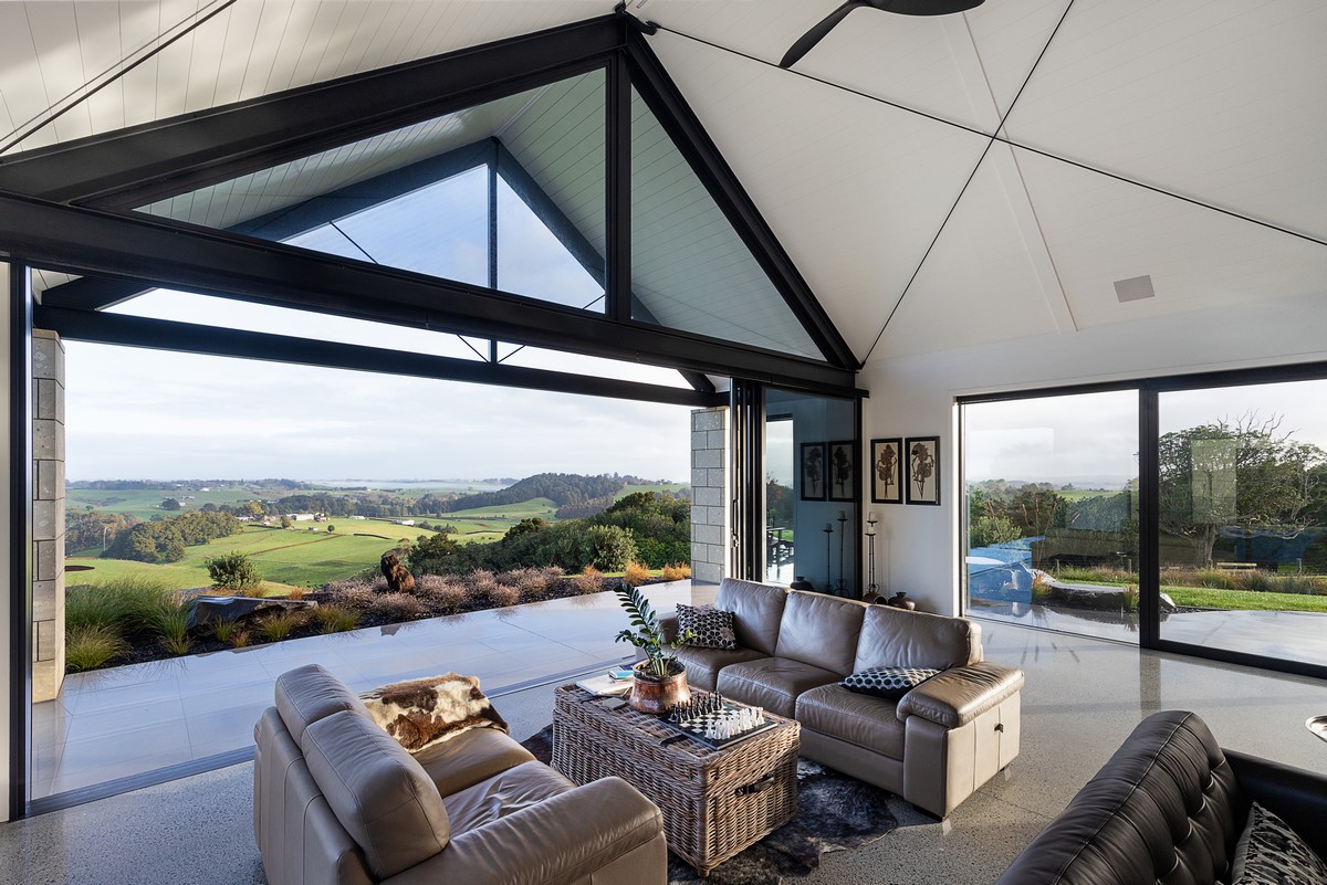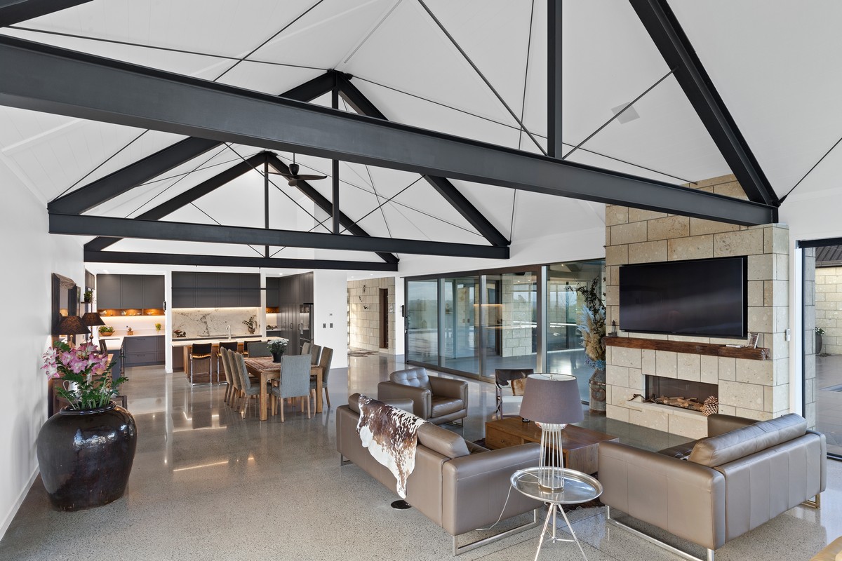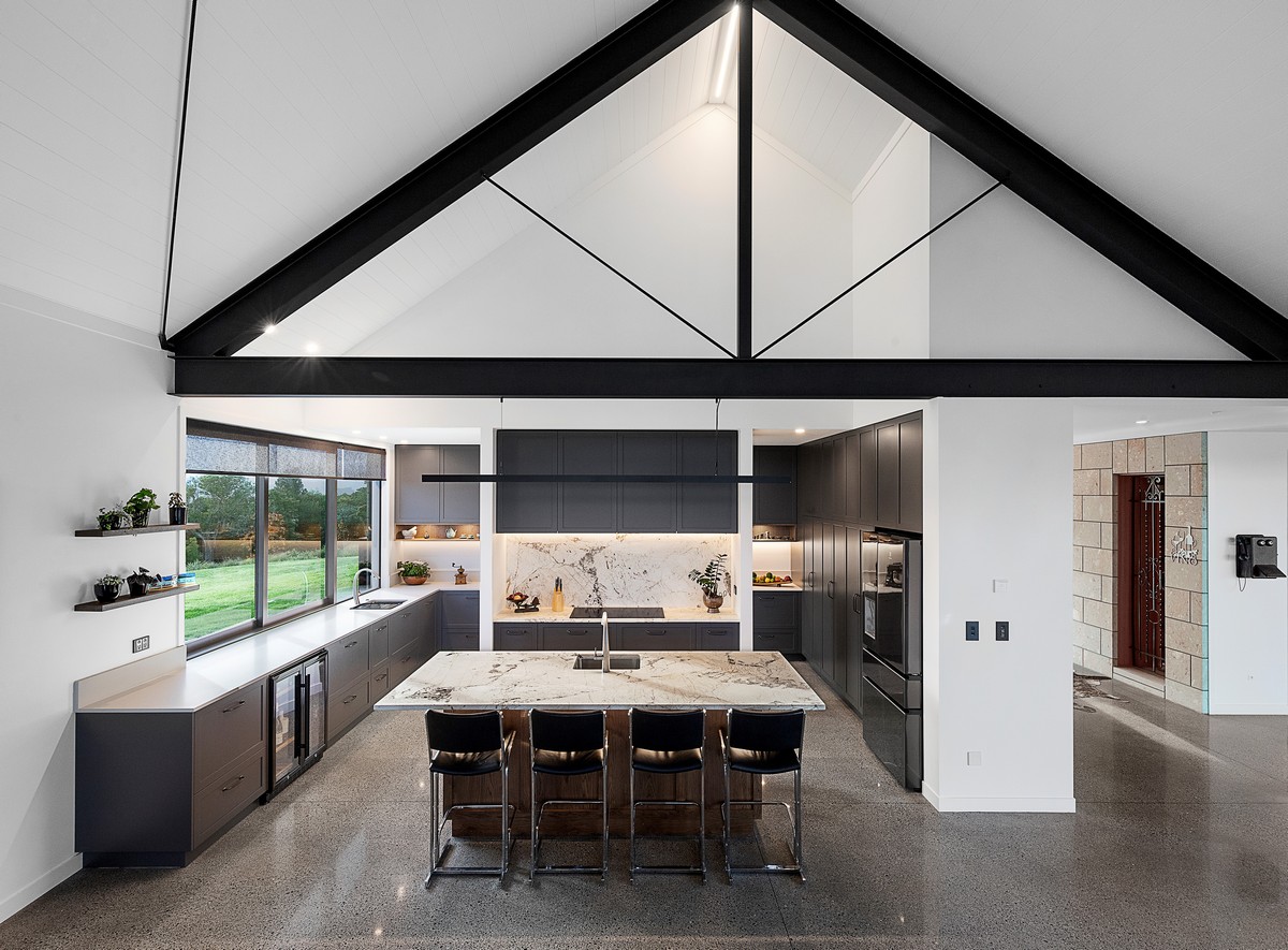 Exposed black painted Reid bracing accentuates the white ceilings, with the steel beams giving the lounge and bedrooms strength and a formal industrial feel.