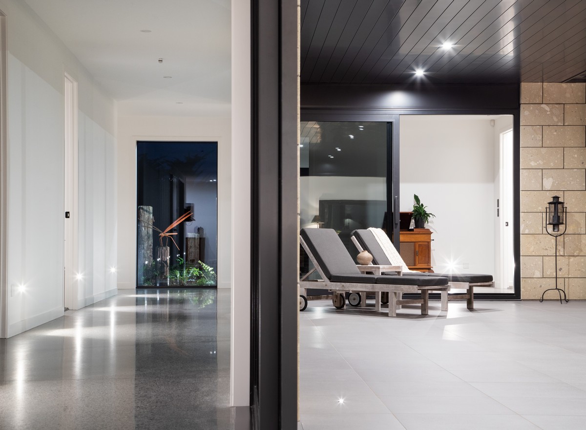 All of the undercover soffits including the front entrance cantilevered areas are clad using Ribbon aluminium soffit, and to keep the ceiling in the lounge and the master bedroom uncluttered, there is an LED light strip inset into the timber where the apex forms.