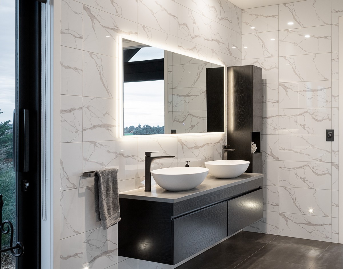 The main bathroom is a generous size with large whiter clean tiles mixed with a Carrera look to give them depth, and the ensuite matches this but on a smaller scale.
