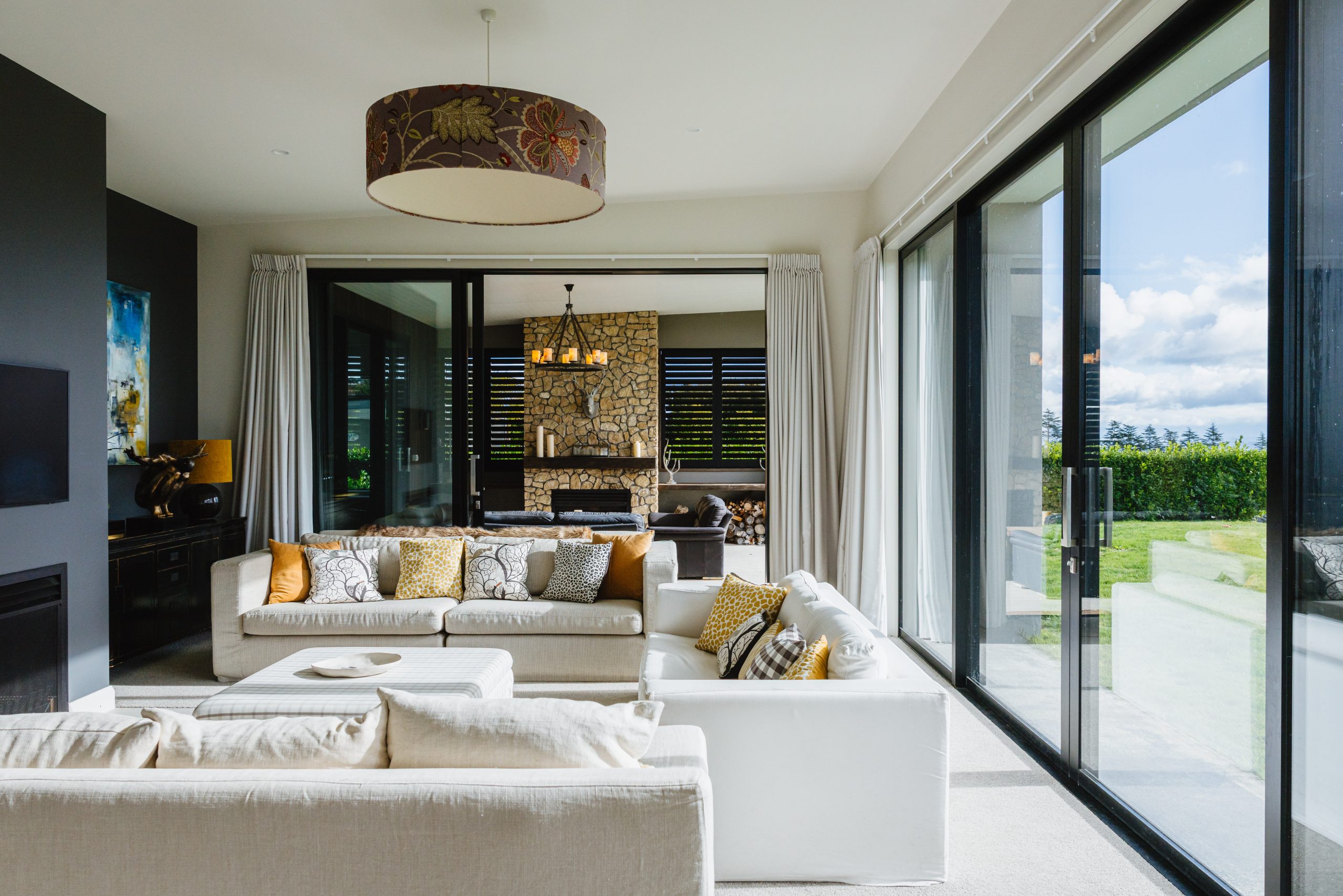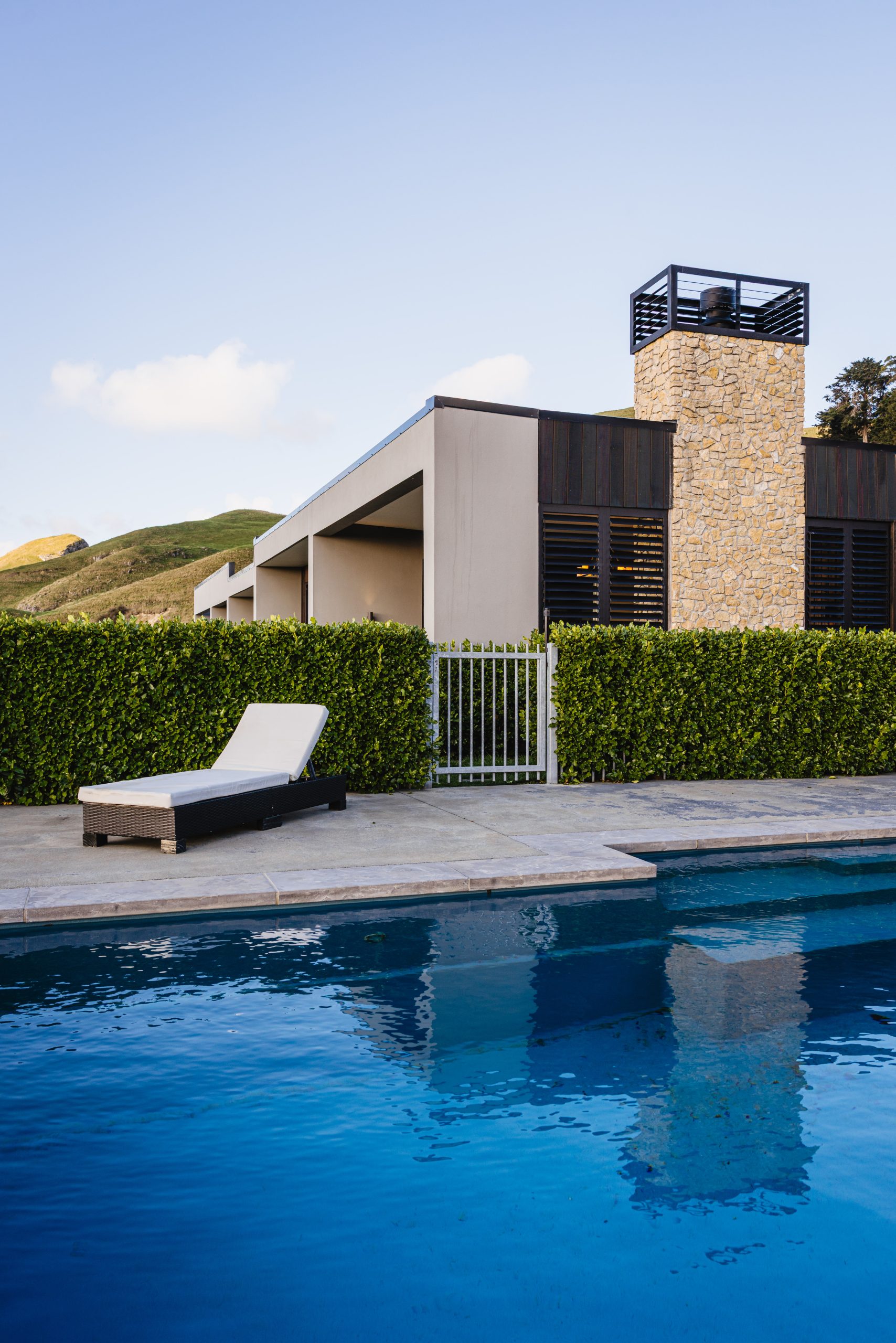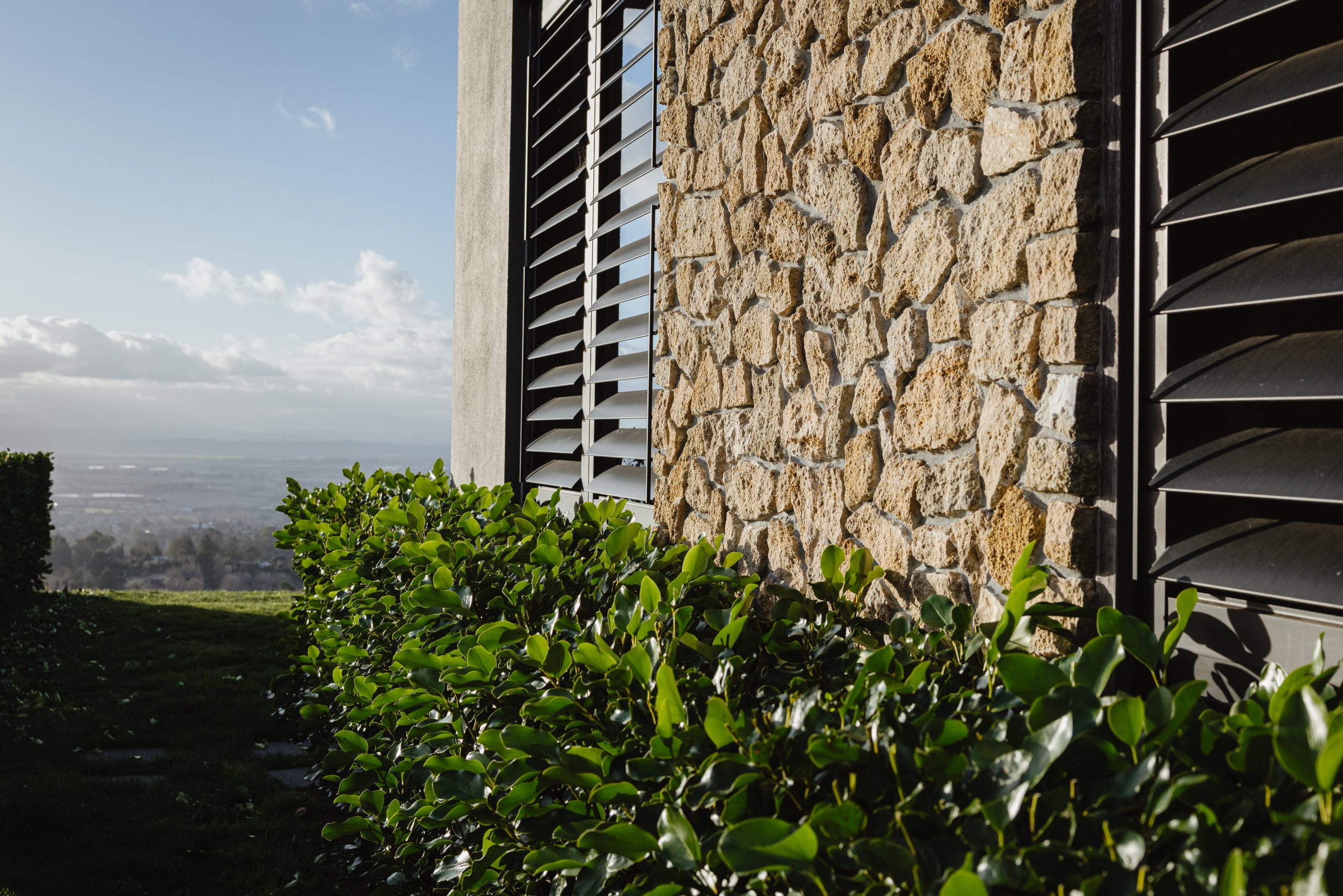 The Hatuma limestone exterior was selected specifically to reflect the golden hues of Hawke’s Bay’s parched summer grass, while design features like an 85-metre-long ha-ha wall and extensive retaining allow the home to sit low and unobtrusive on the land, in harmony with the natural contours of Te Mata Peak.