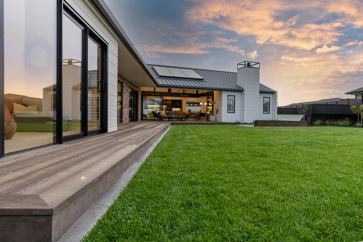 Large corner stacking sliders flow out onto an outdoor sanctuary with decking and a large front lawn for children to run around. There is something for everyone at this Cambridge property – even a skate ramp built by White Wood Homes.