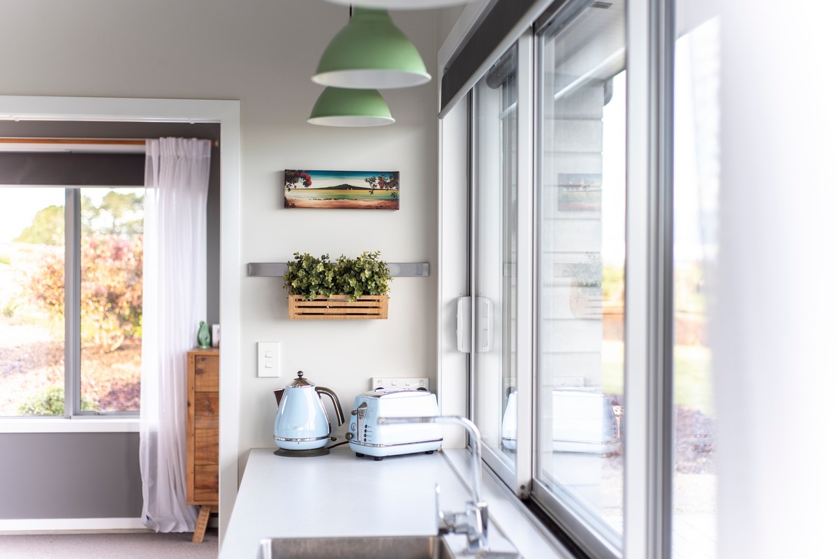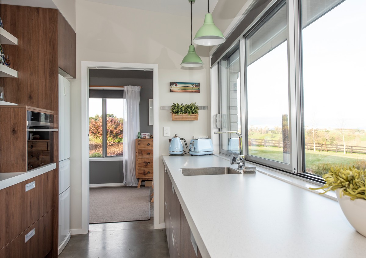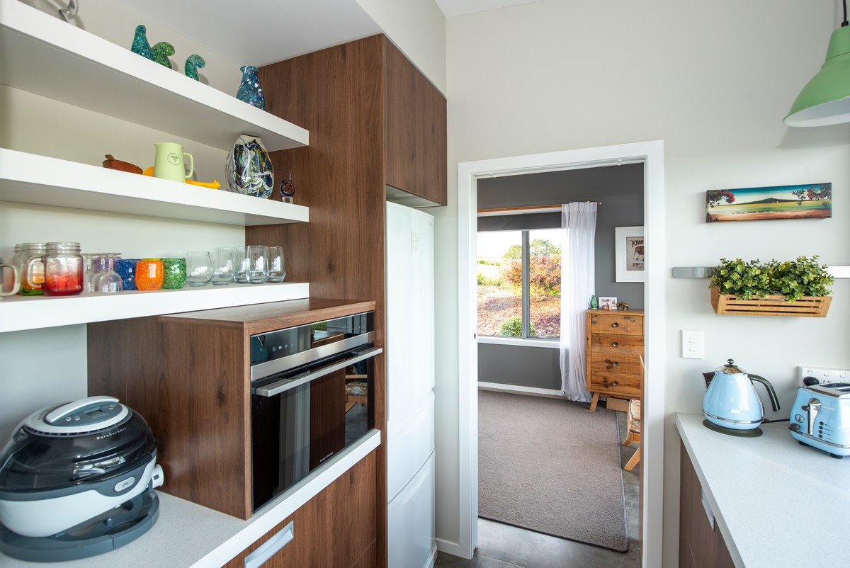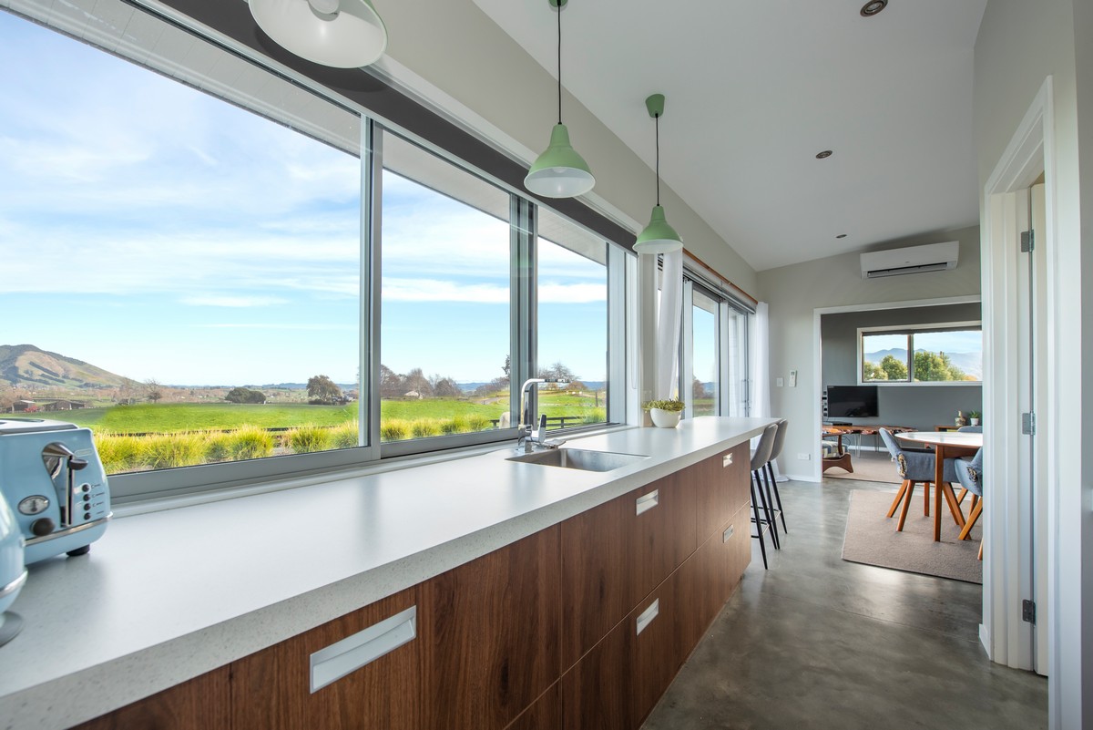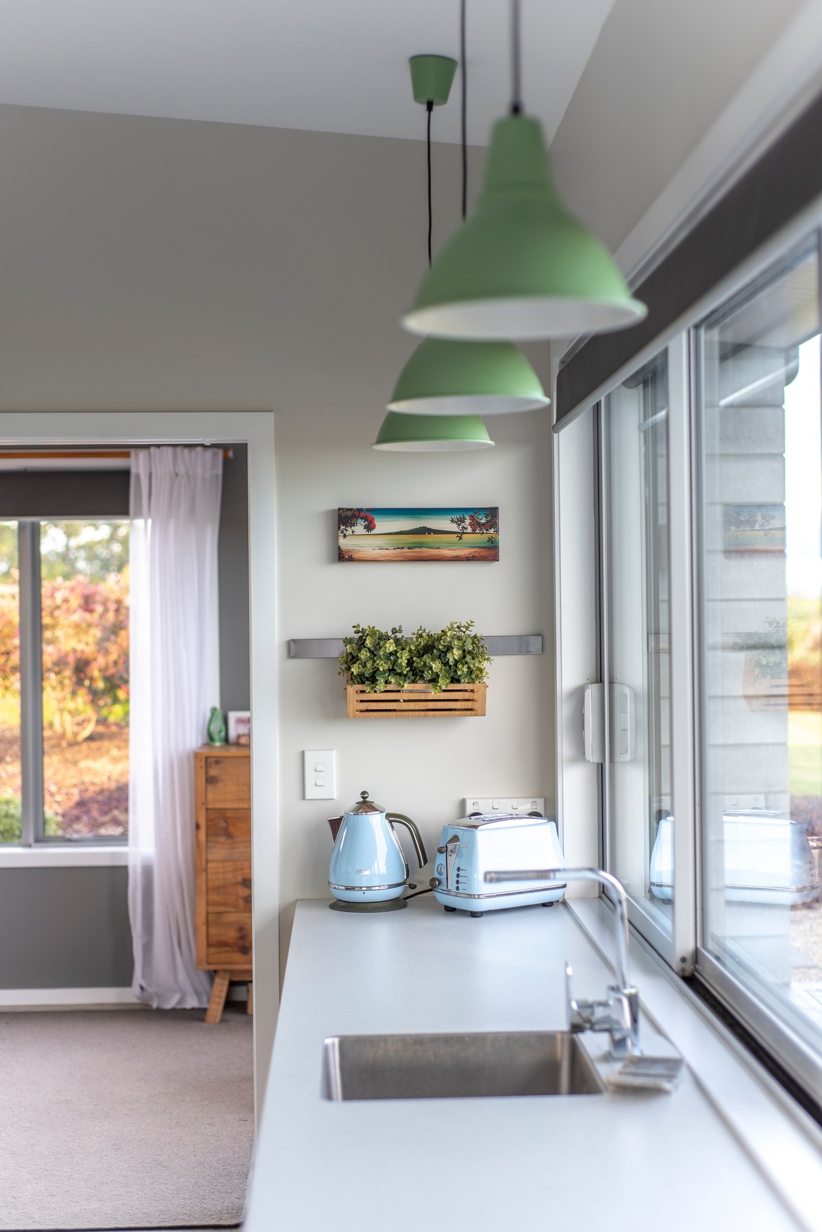 The outside of this small studio is made from a mixture of blockwork and Triclad weatherboard, with views over stunning Kakepuku Mountain and rolling farmland. Inside the studio, an extra long kitchen benchtop doubles as a working space, while looking out over the surrounding landscape, and Ikea vintage lights finish the scene in this Customtone Kitchen from Otorohanga.