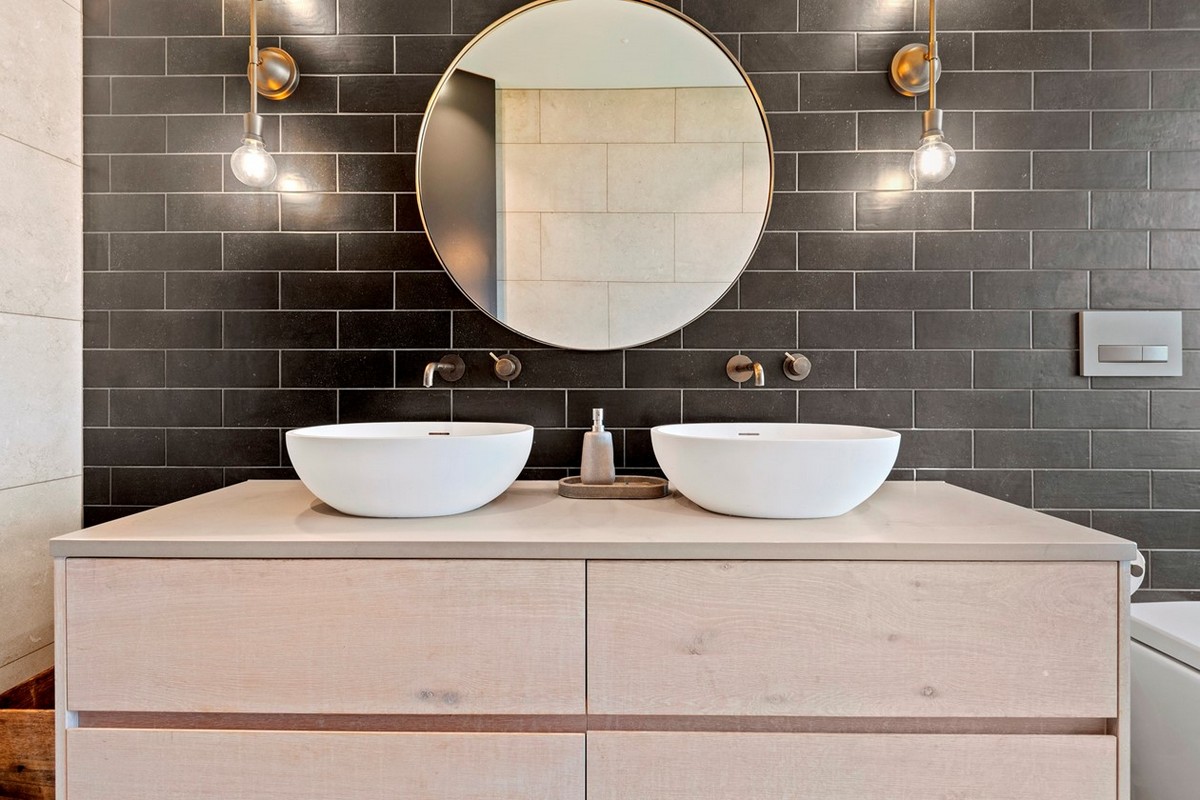 In the main ensuite, pistachio limestone tiles with a flamed, tumbled finish line the walls. The custom-built cabinetry with double-top mounted bowls over a slim stone top and aged brass tapware are timeless.