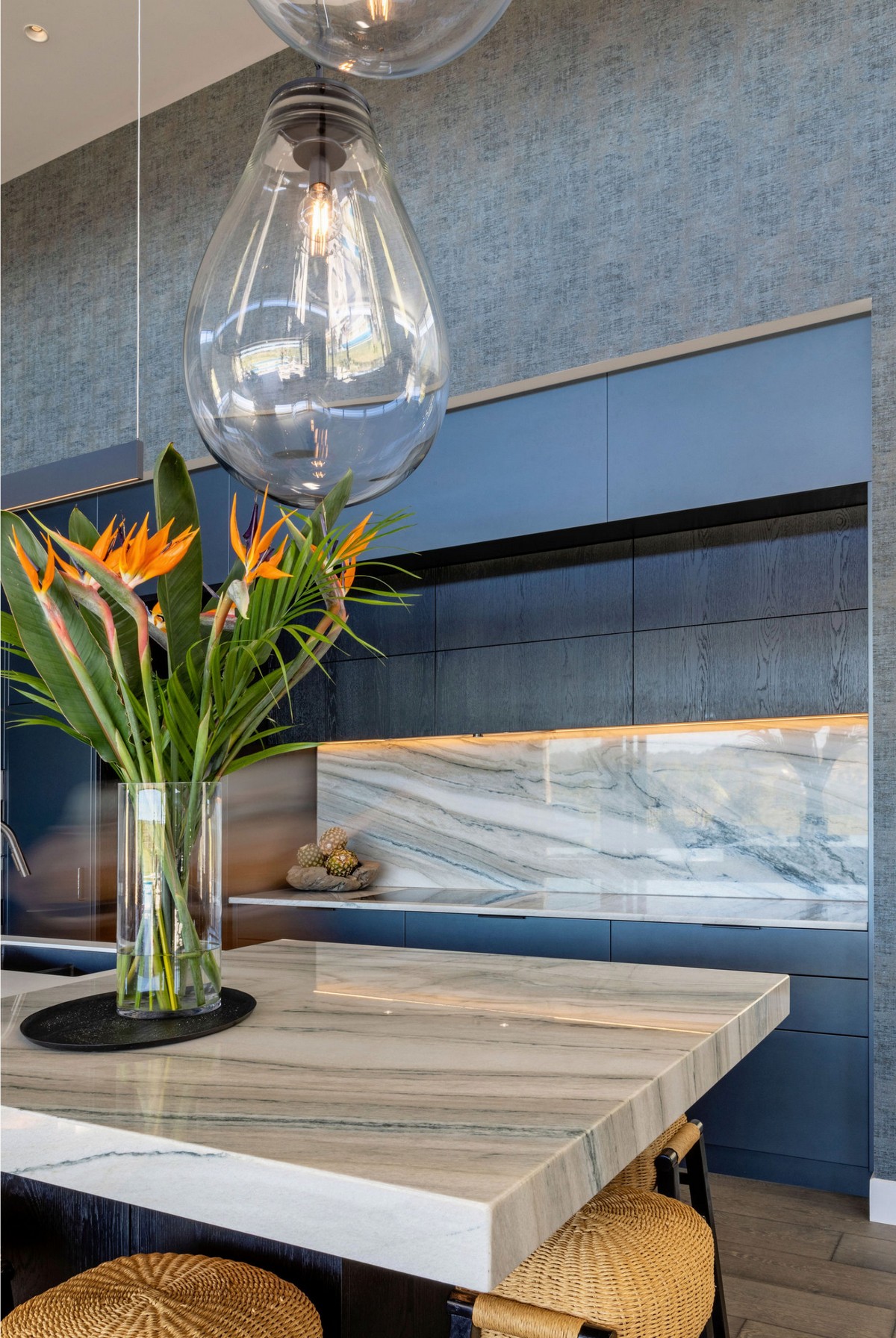 Oversized glass pendants from Czech Republic hang above the kitchen, and internal bridges separate all of the bedrooms from the living spaces.
