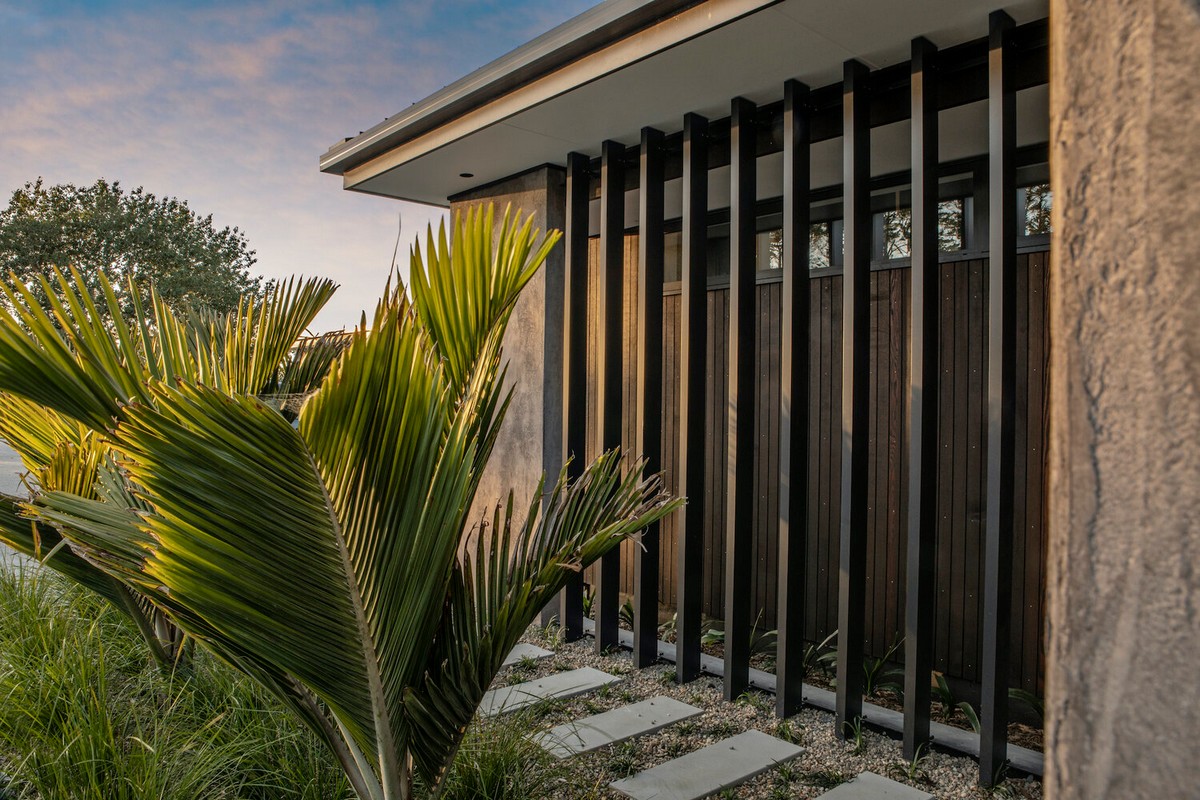 Clad in vertical timber with blade walls in marbled plaster, the strong geometry is softened by touches of the tropics.