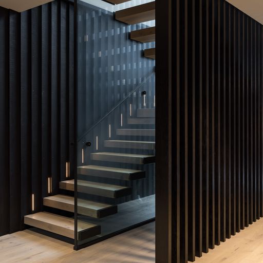 The steel staircase is a talking point in itself and features a giant 30mm thick pane of structural glass that had to be craned in, starting from the ground floor and reaching 4.5m high right through the middle of the house.
