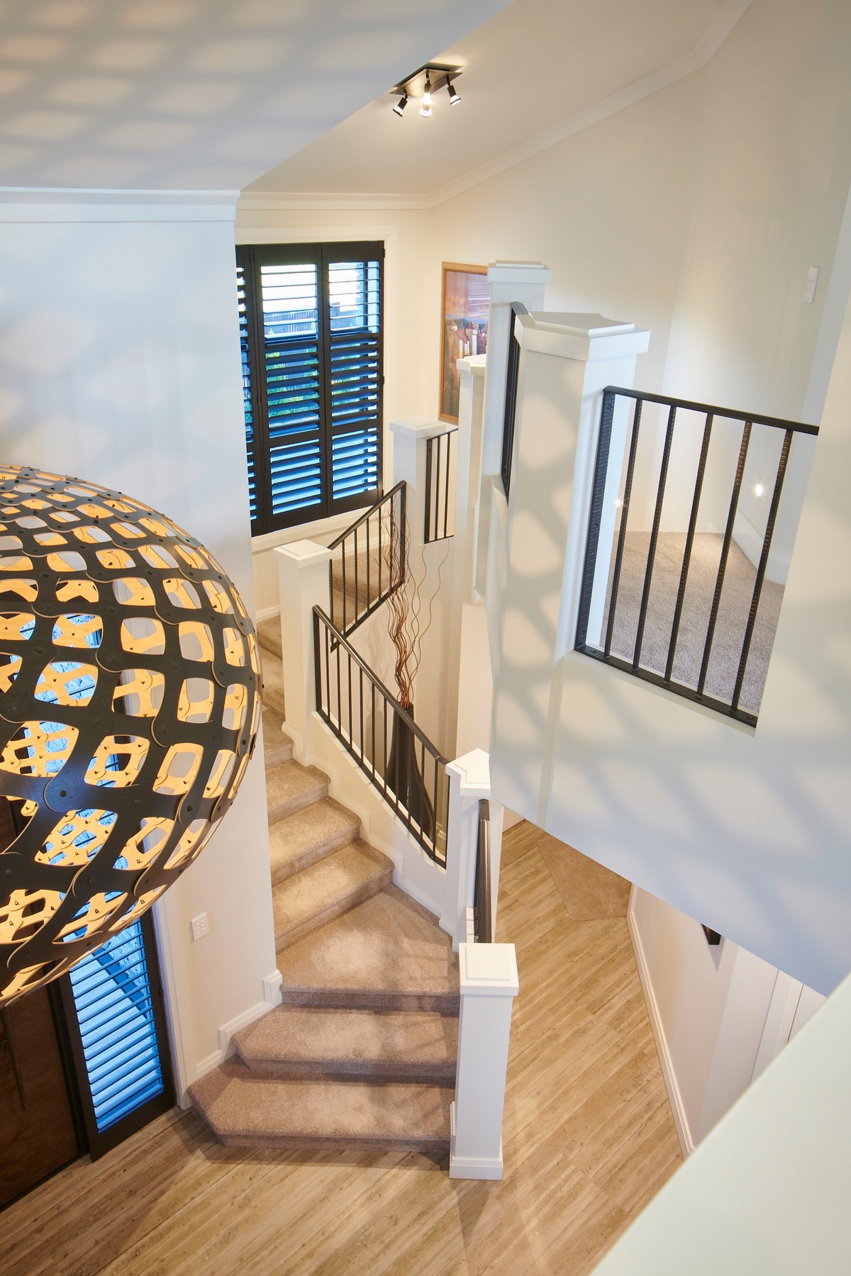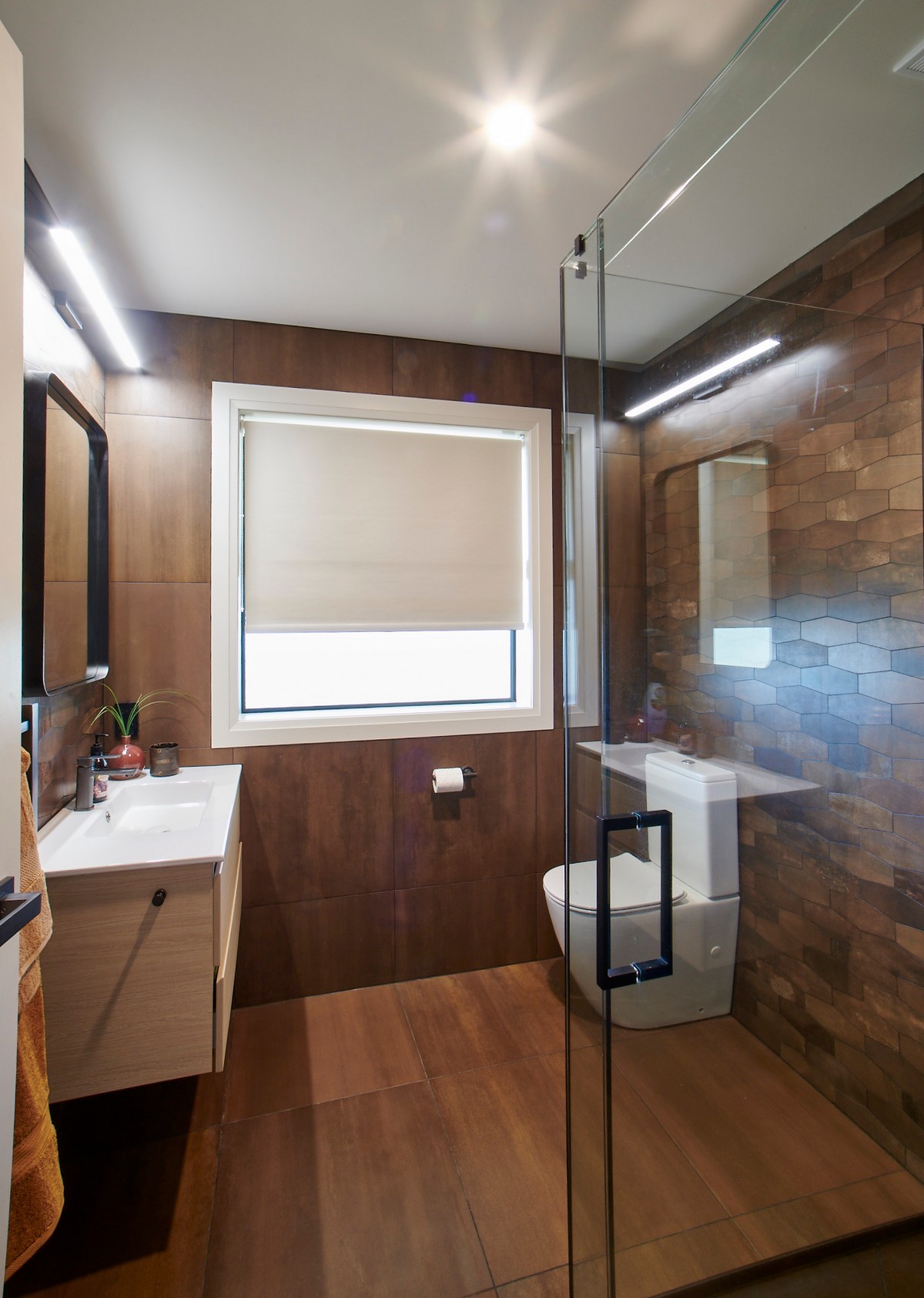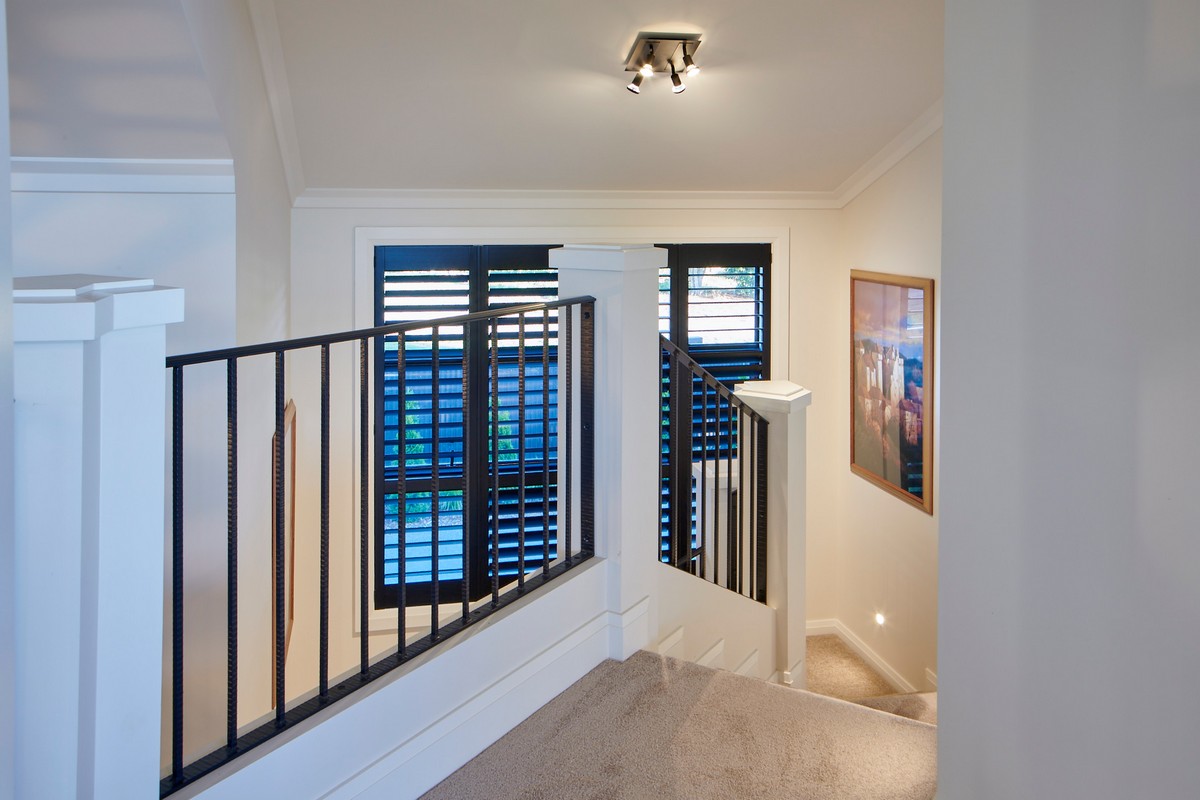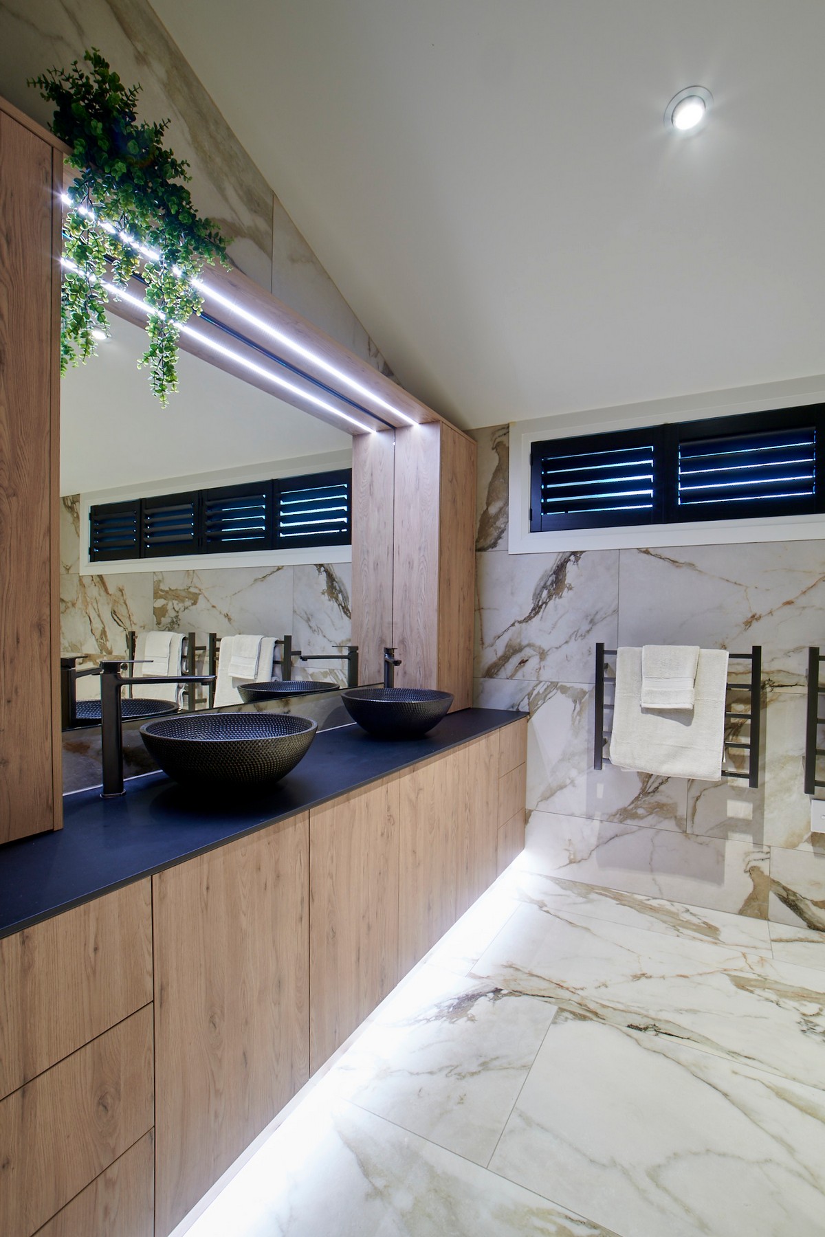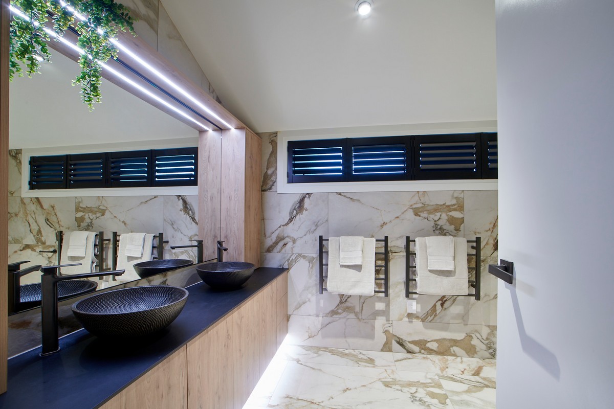 A mixture of light and dark tones in the bathroom complemented with louvred shutter windows throughout the entire house gives it a relaxed resort-like ambience.