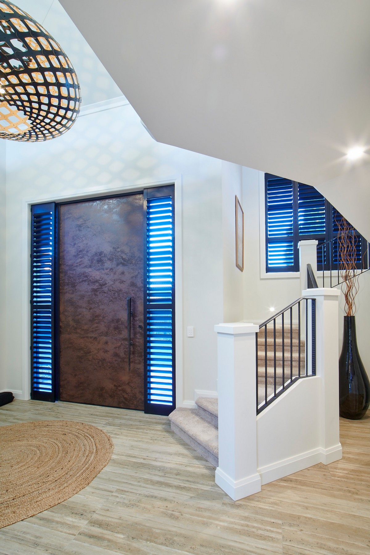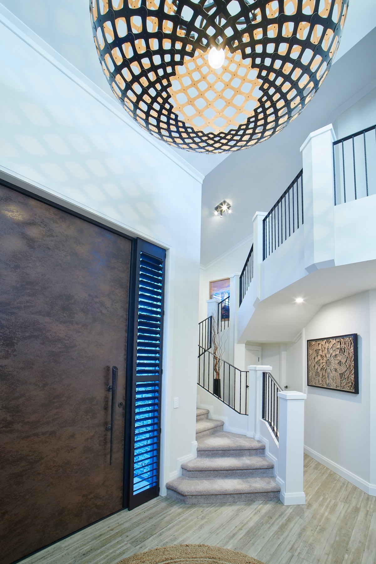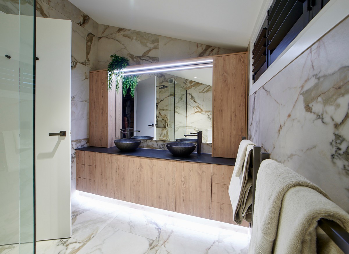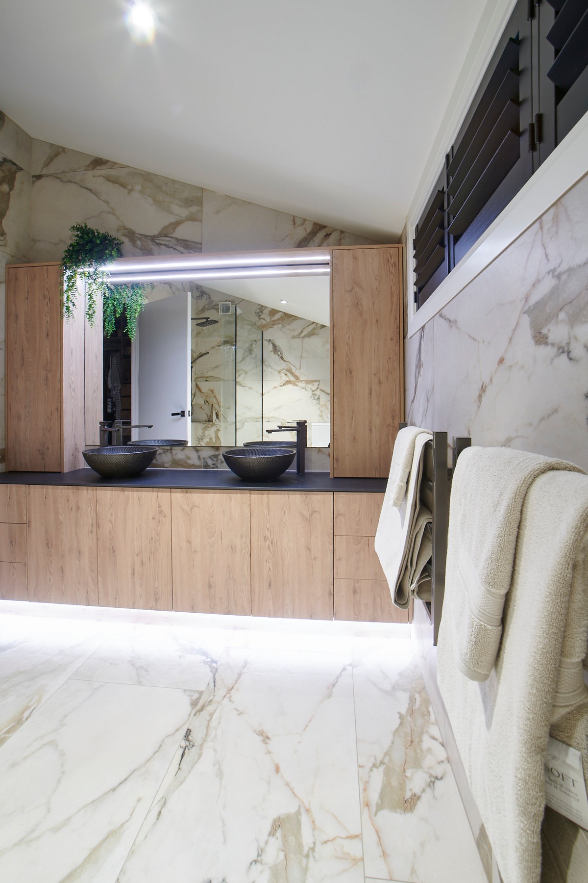 A mixture of light and dark tones in the bathroom complemented with louvred shutter windows throughout the entire house gives it a relaxed resort-like ambience.