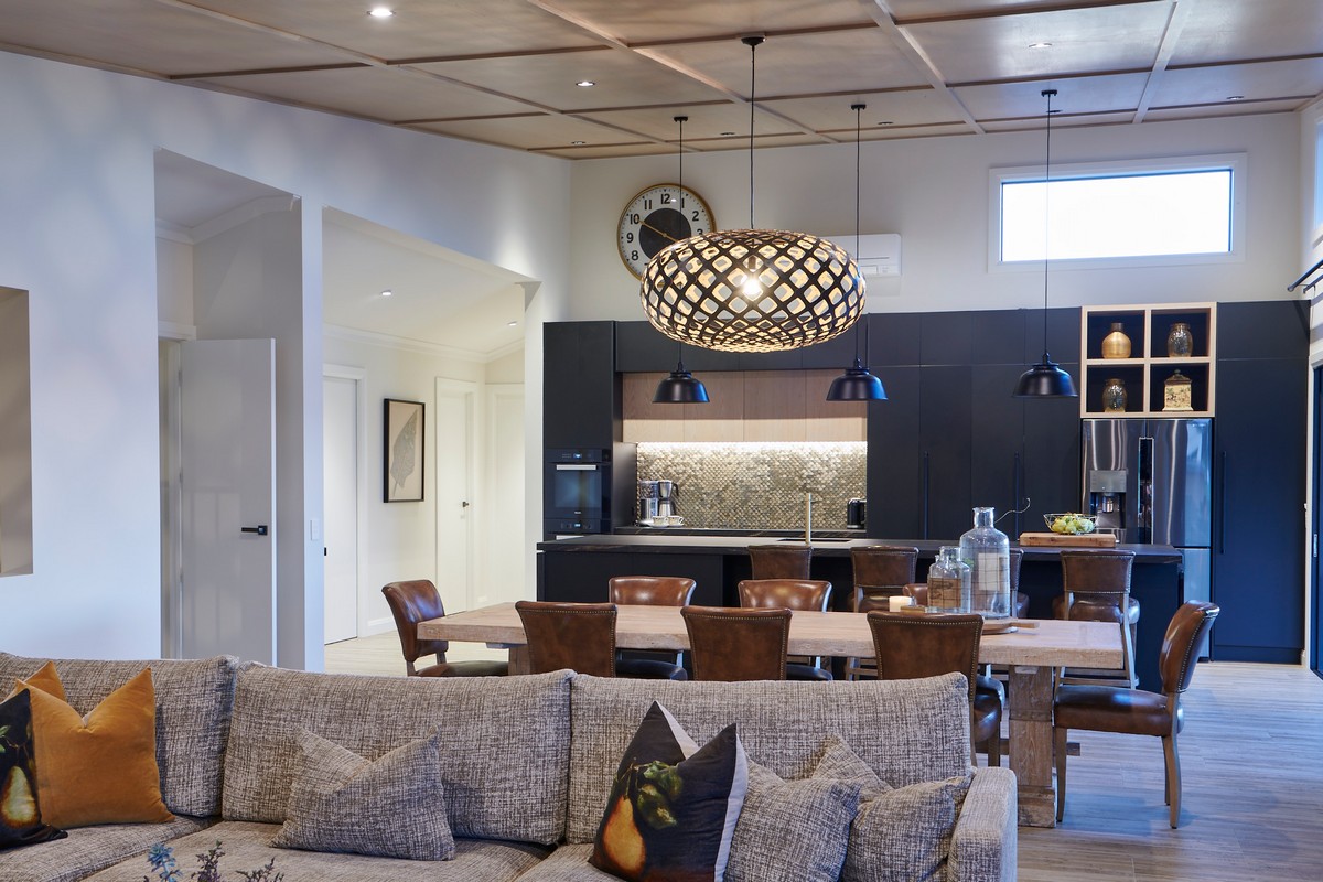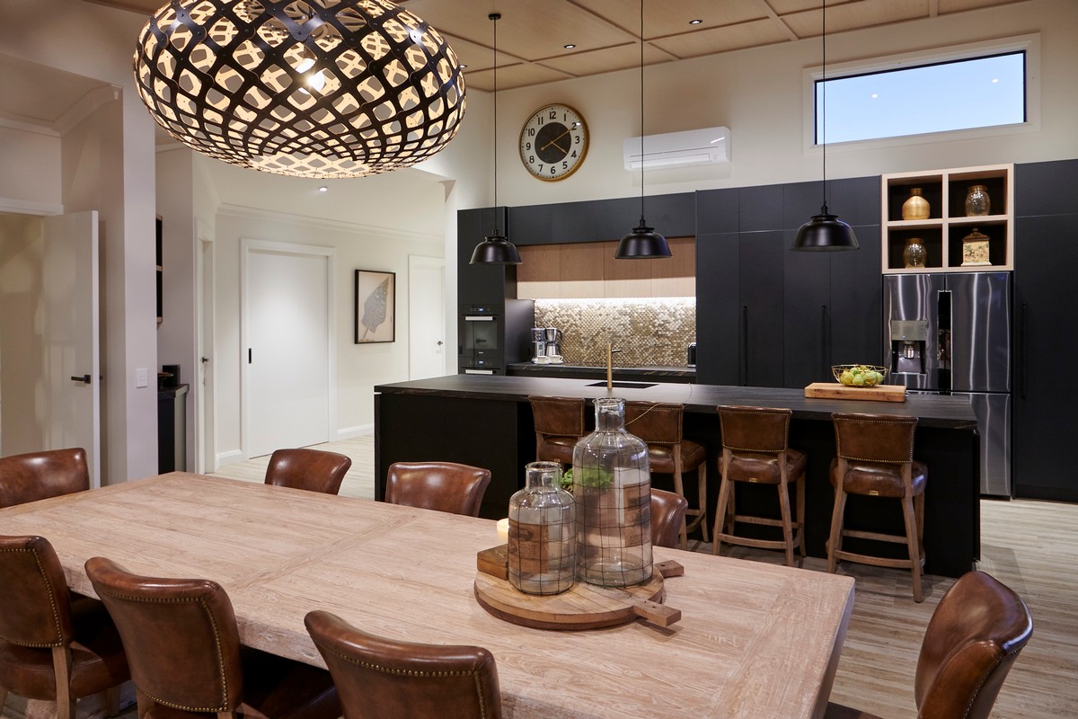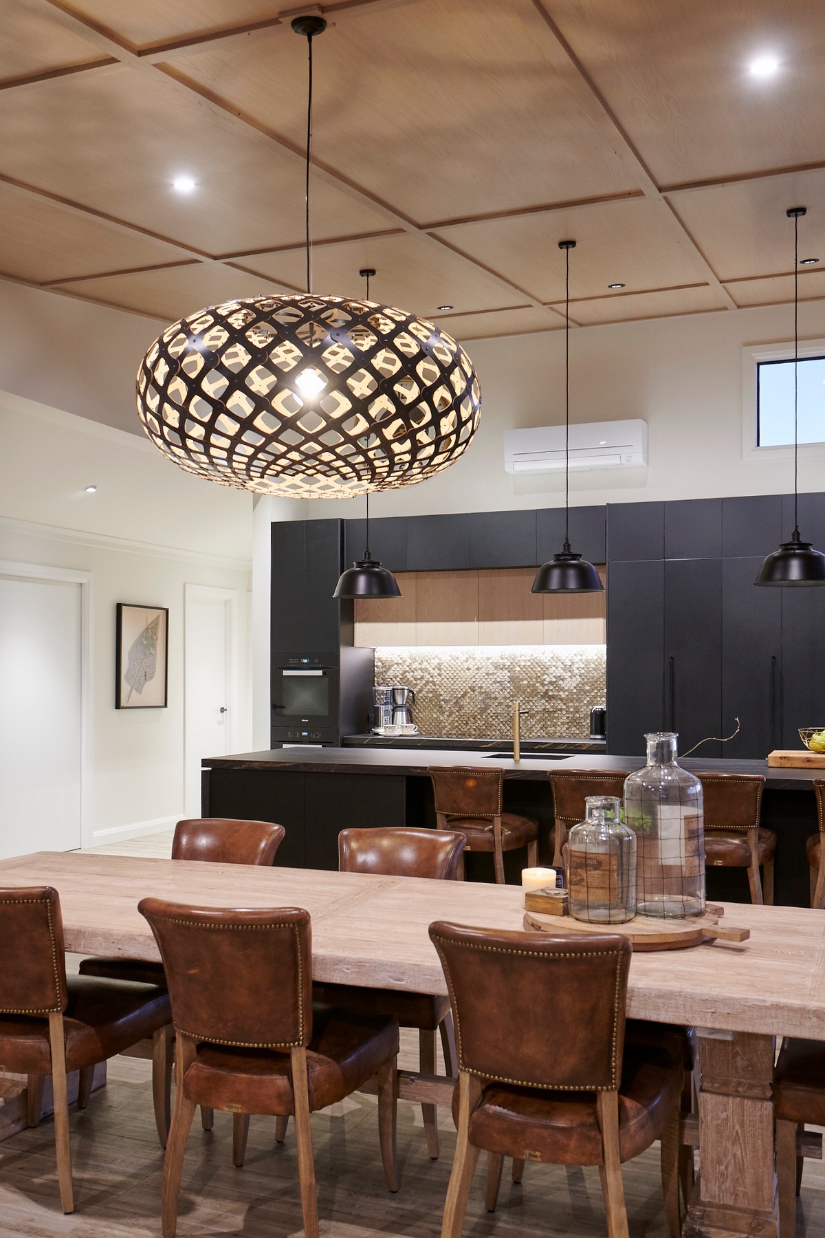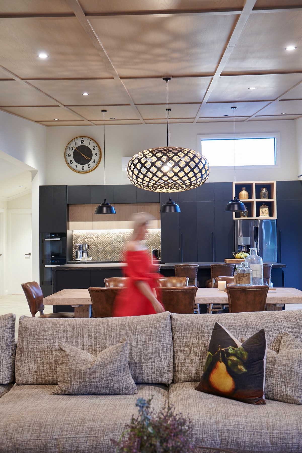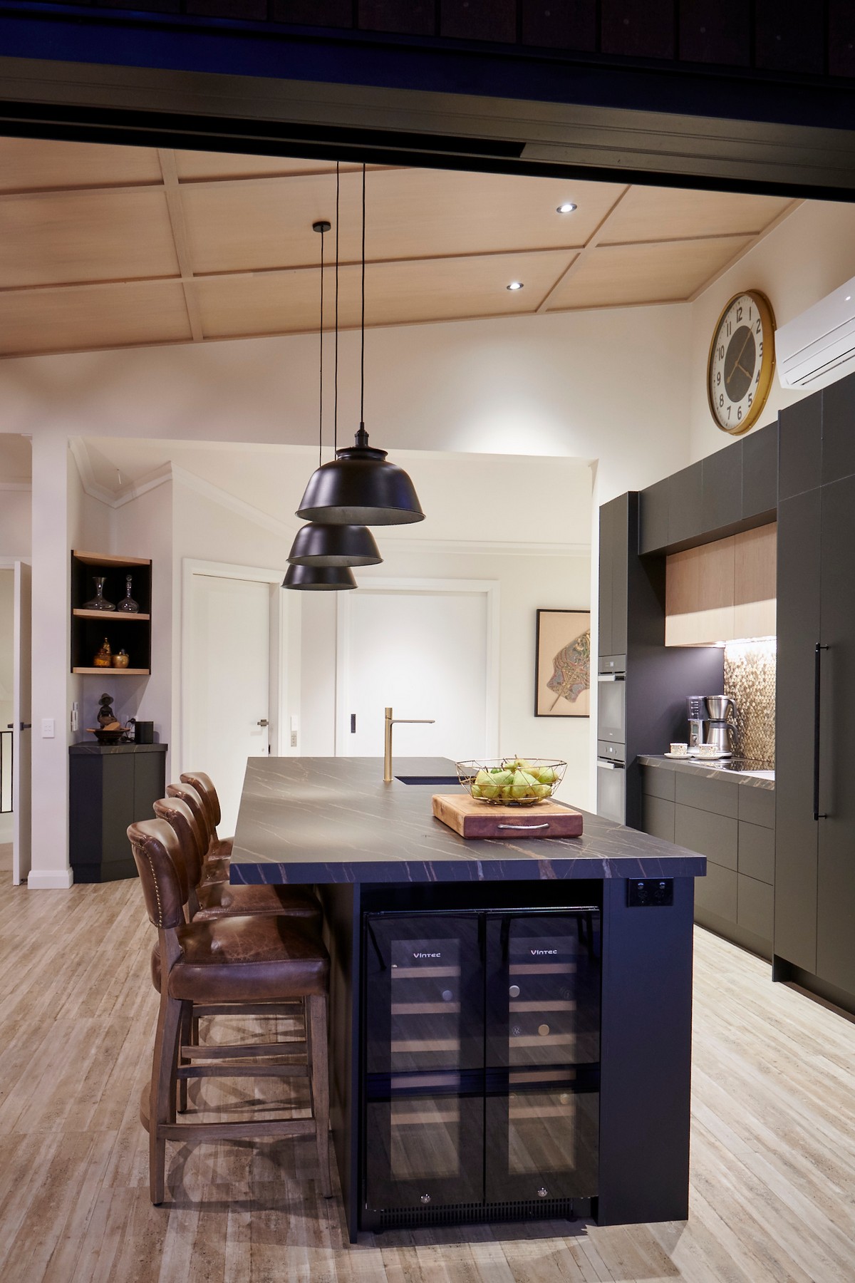 Everything about this house is striking and elegant, right down to the brass fitted tapware and the large 3-metre entrance door – also made from the same laminate product as the kitchen bench. Ample open shelving throughout allows the family to showcase some of their prized possessions, and also gives the house a true lived in feeling.