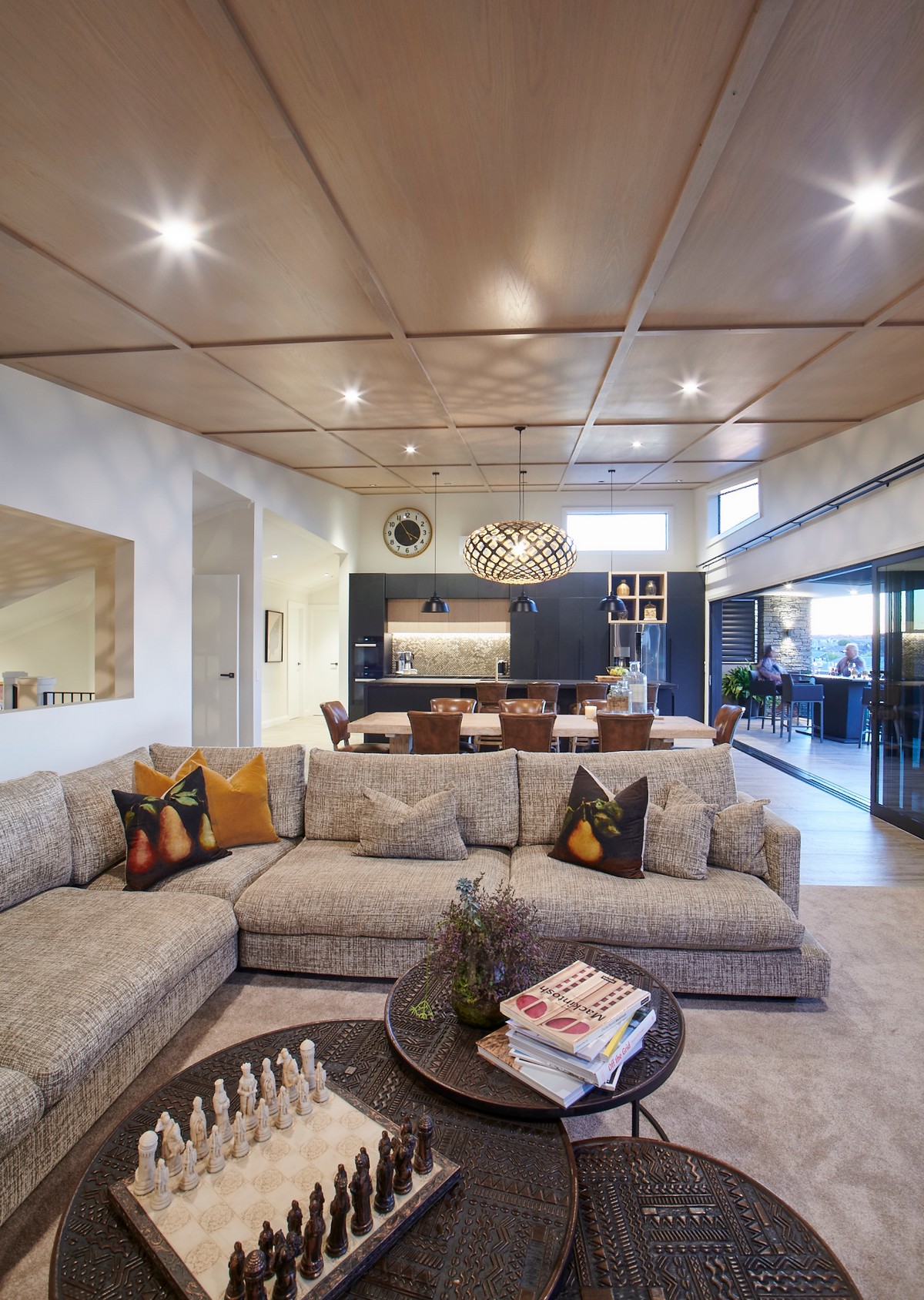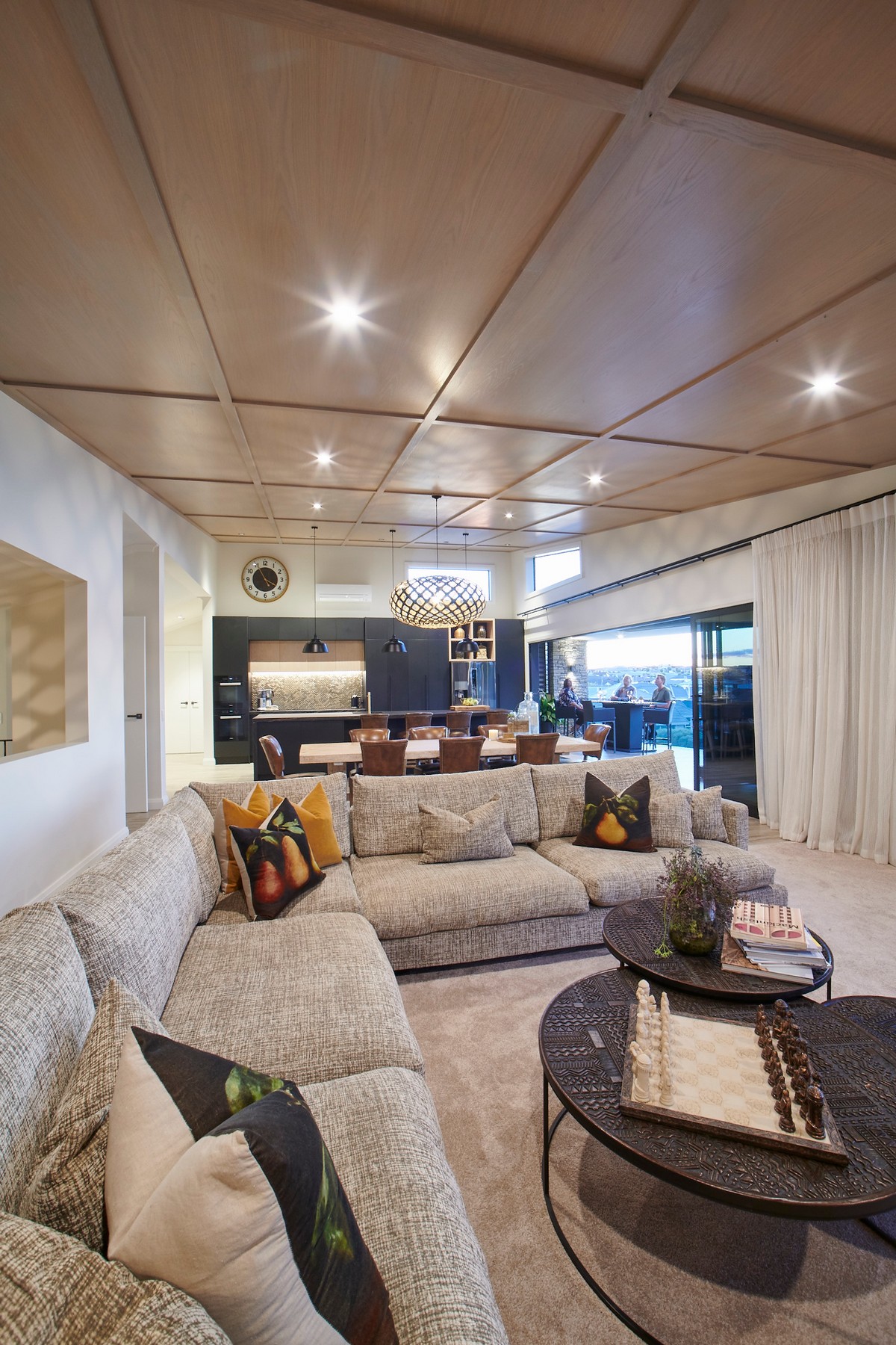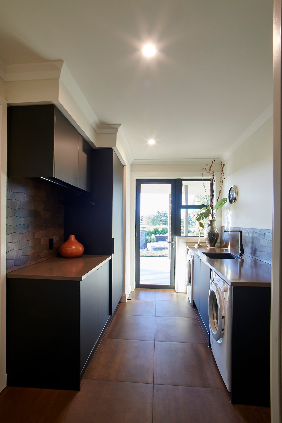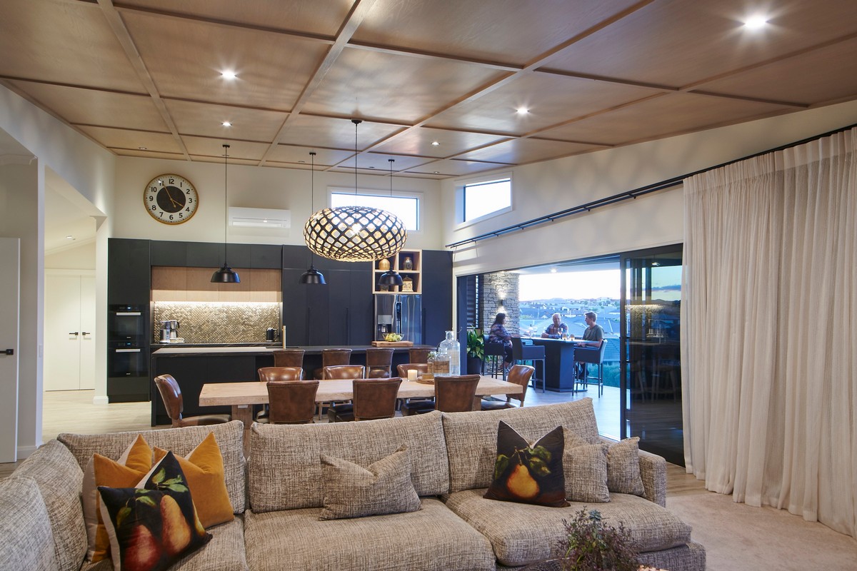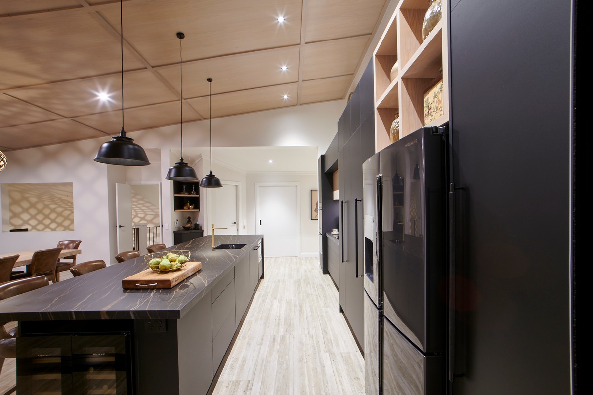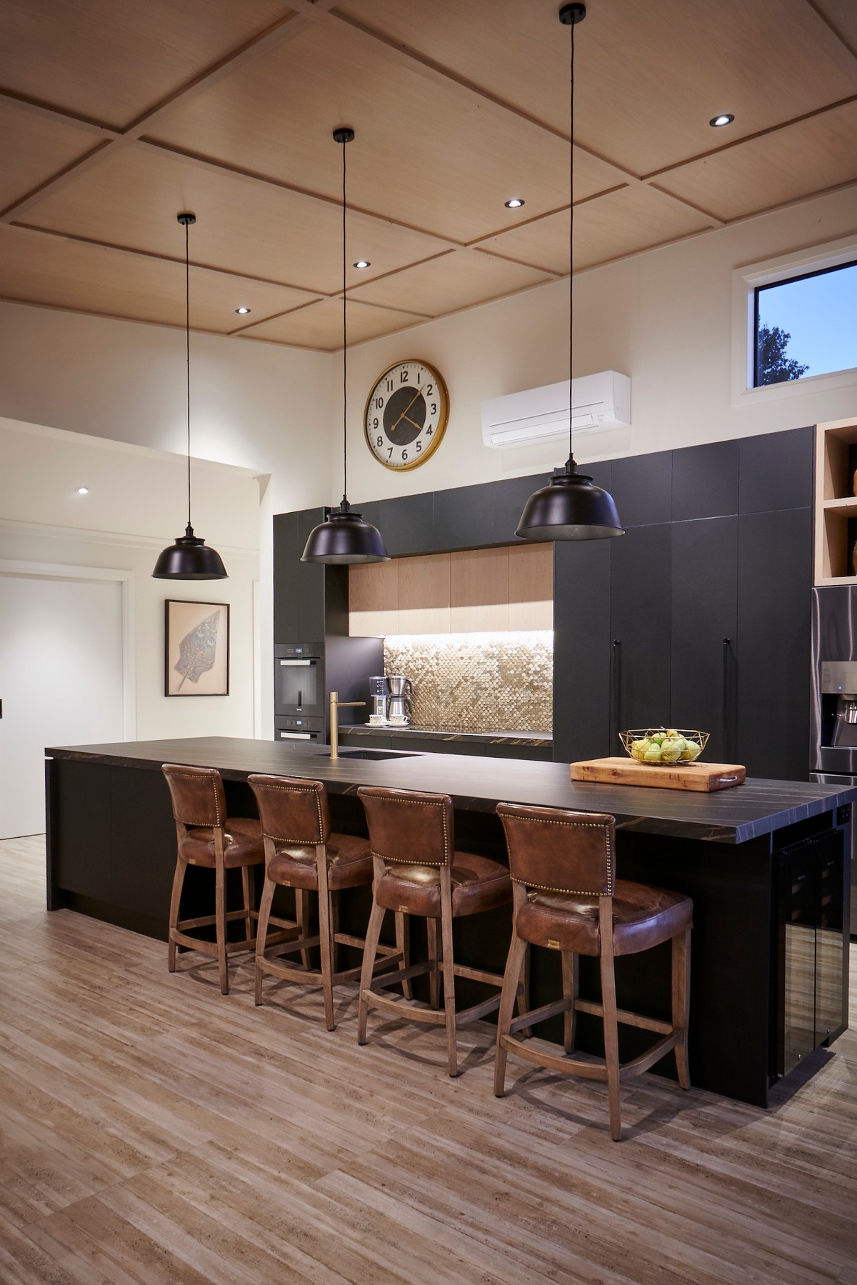 Everything about this house is striking and elegant, right down to the brass fitted tapware and the large 3-metre entrance door – also made from the same laminate product as the kitchen bench. Ample open shelving throughout allows the family to showcase some of their prized possessions, and also gives the house a true lived in feeling.