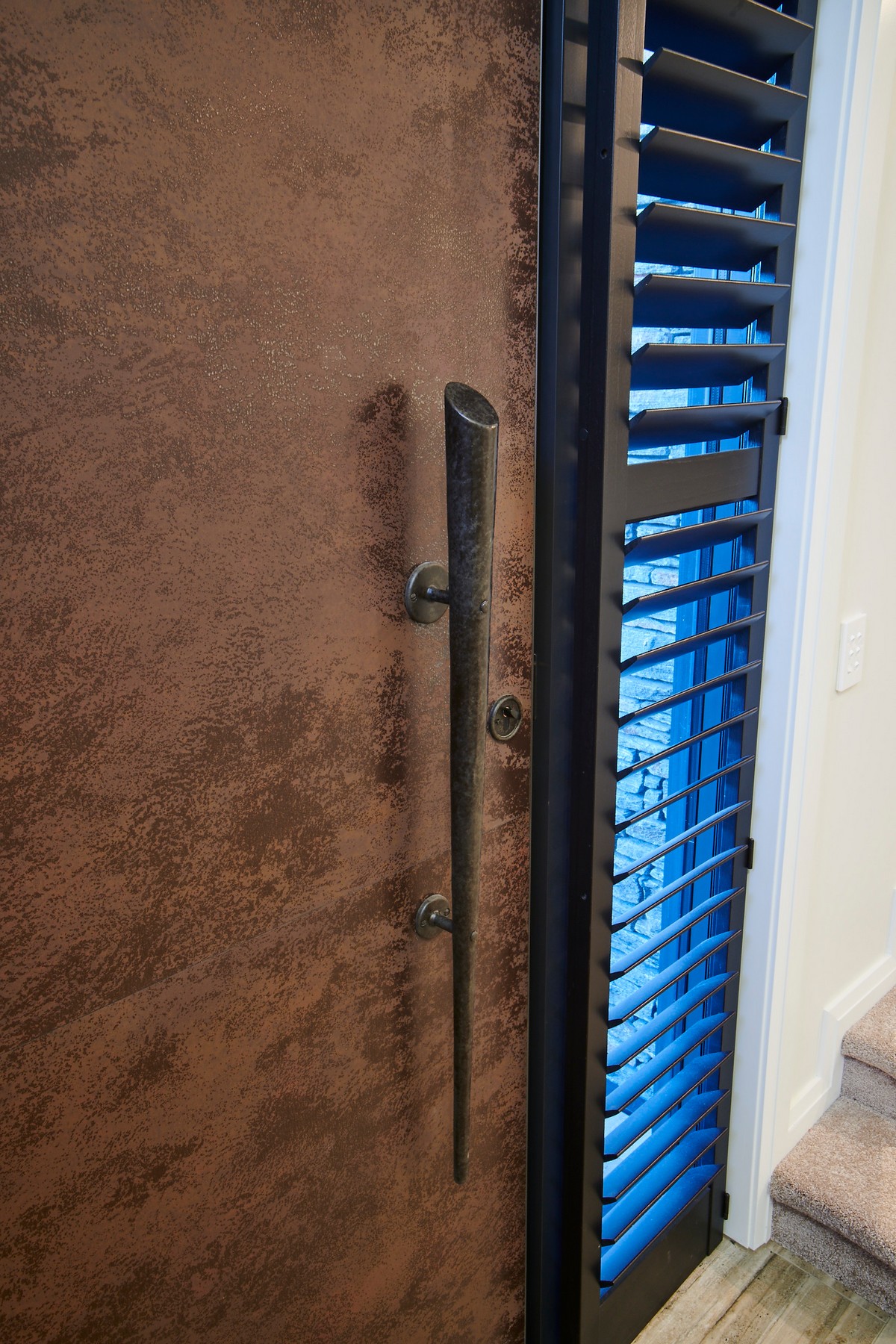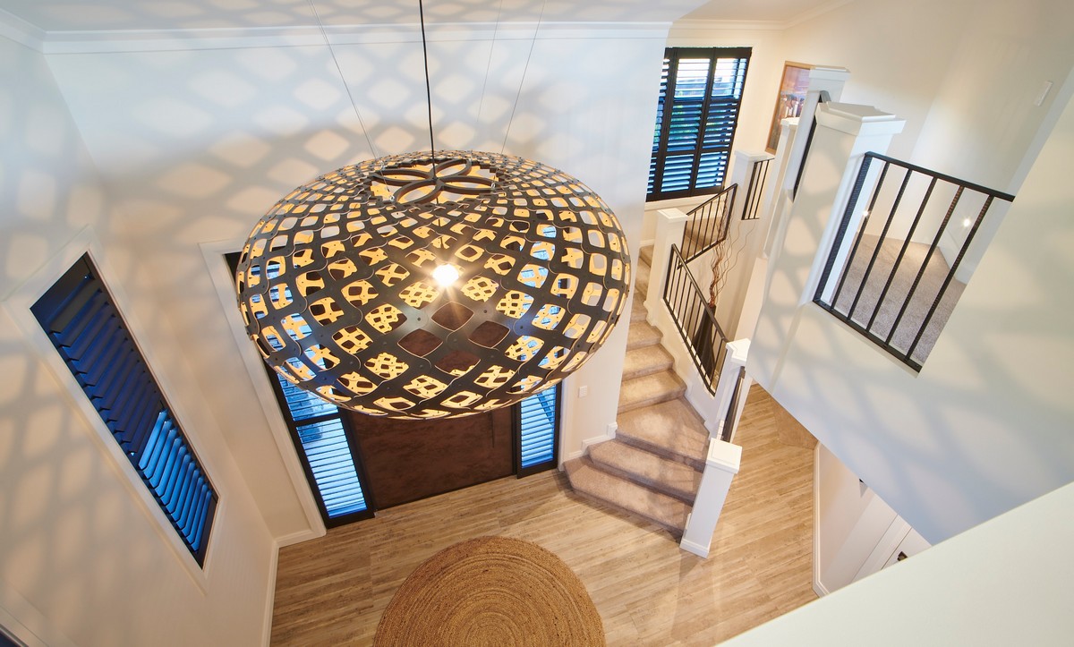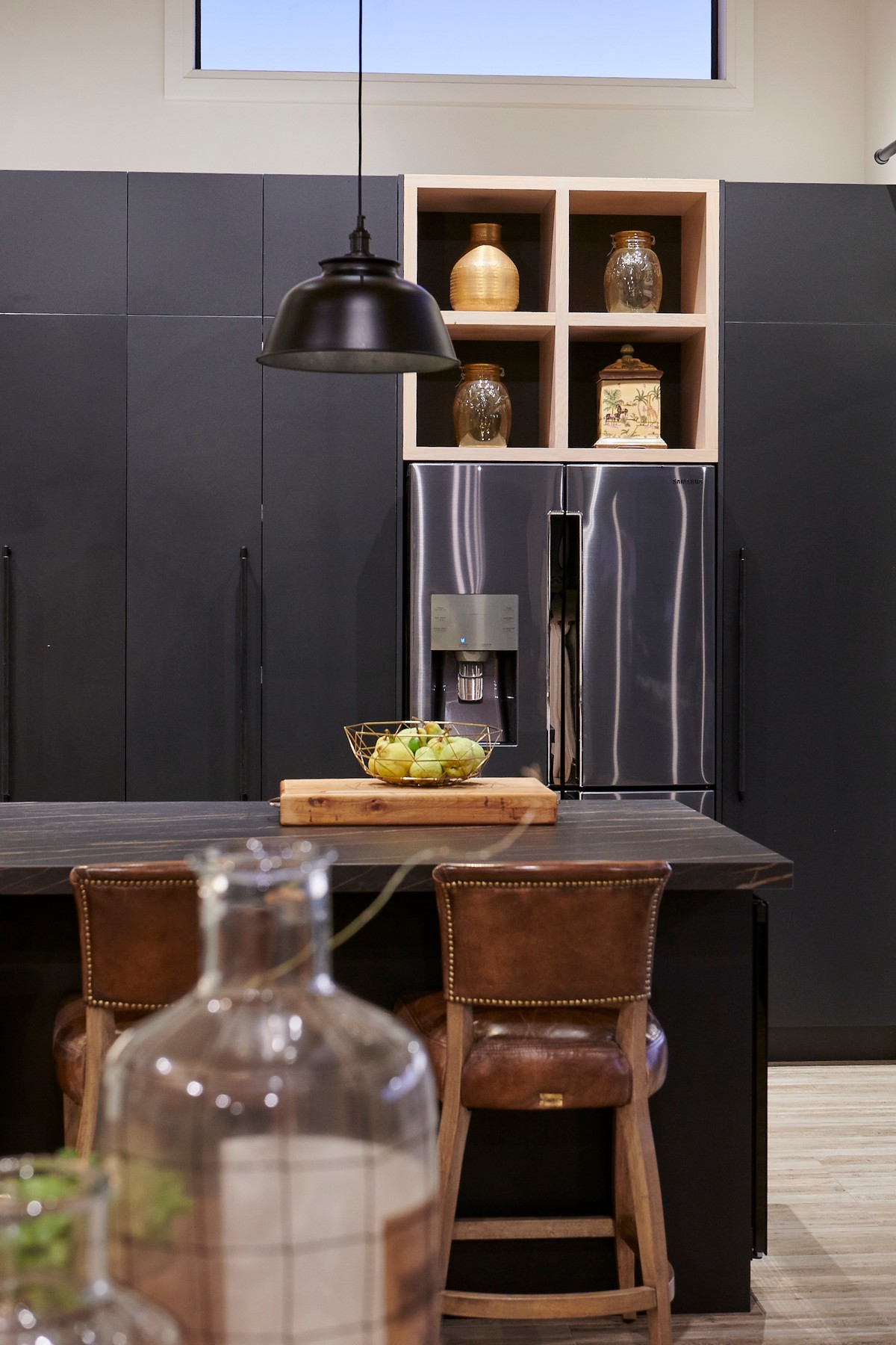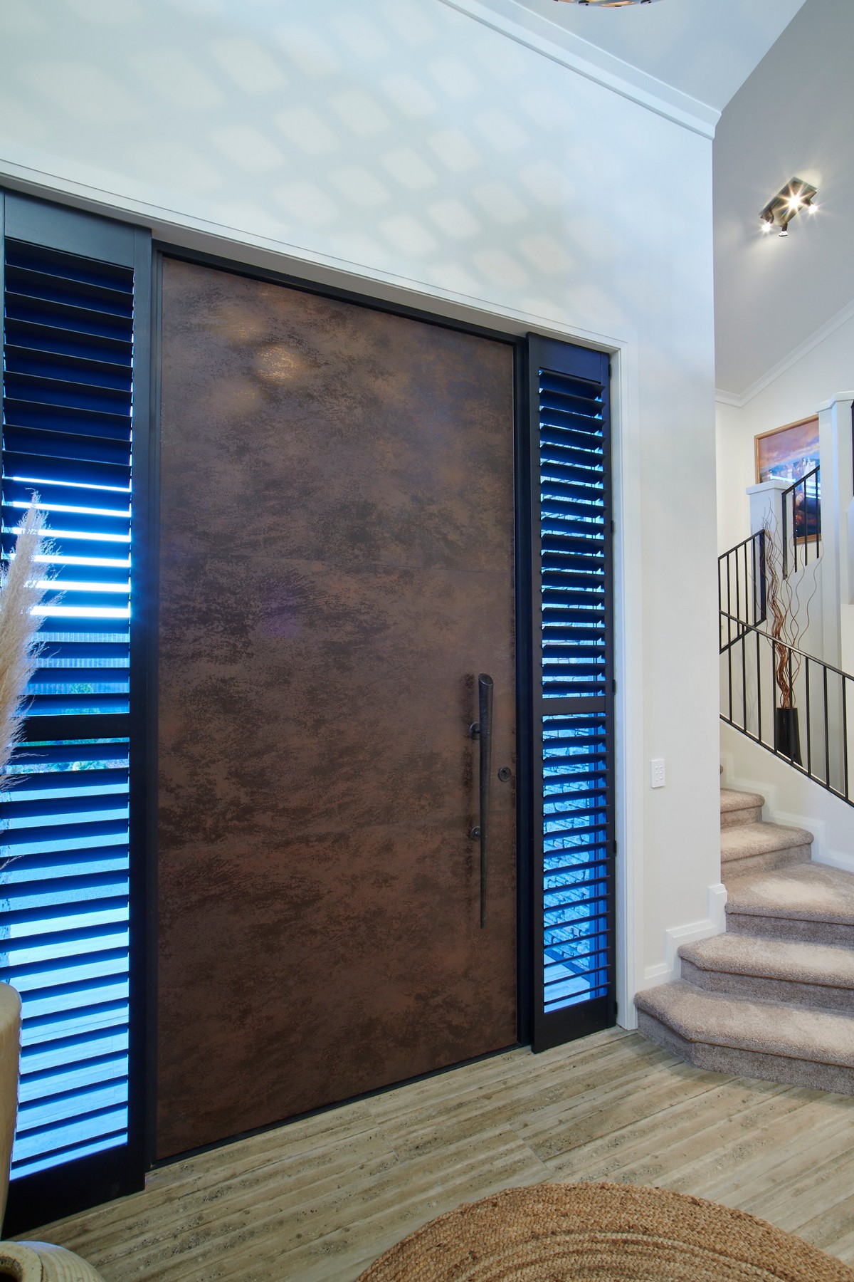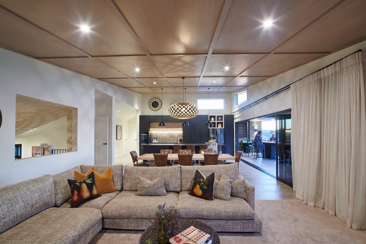 Everything about this house is striking and elegant, right down to the brass fitted tapware and the large 3-metre entrance door – also made from the same laminate product as the kitchen bench. Ample open shelving throughout allows the family to showcase some of their prized possessions, and also gives the house a true lived in feeling.