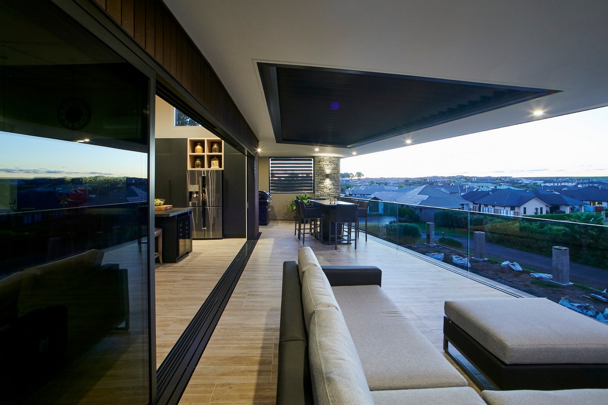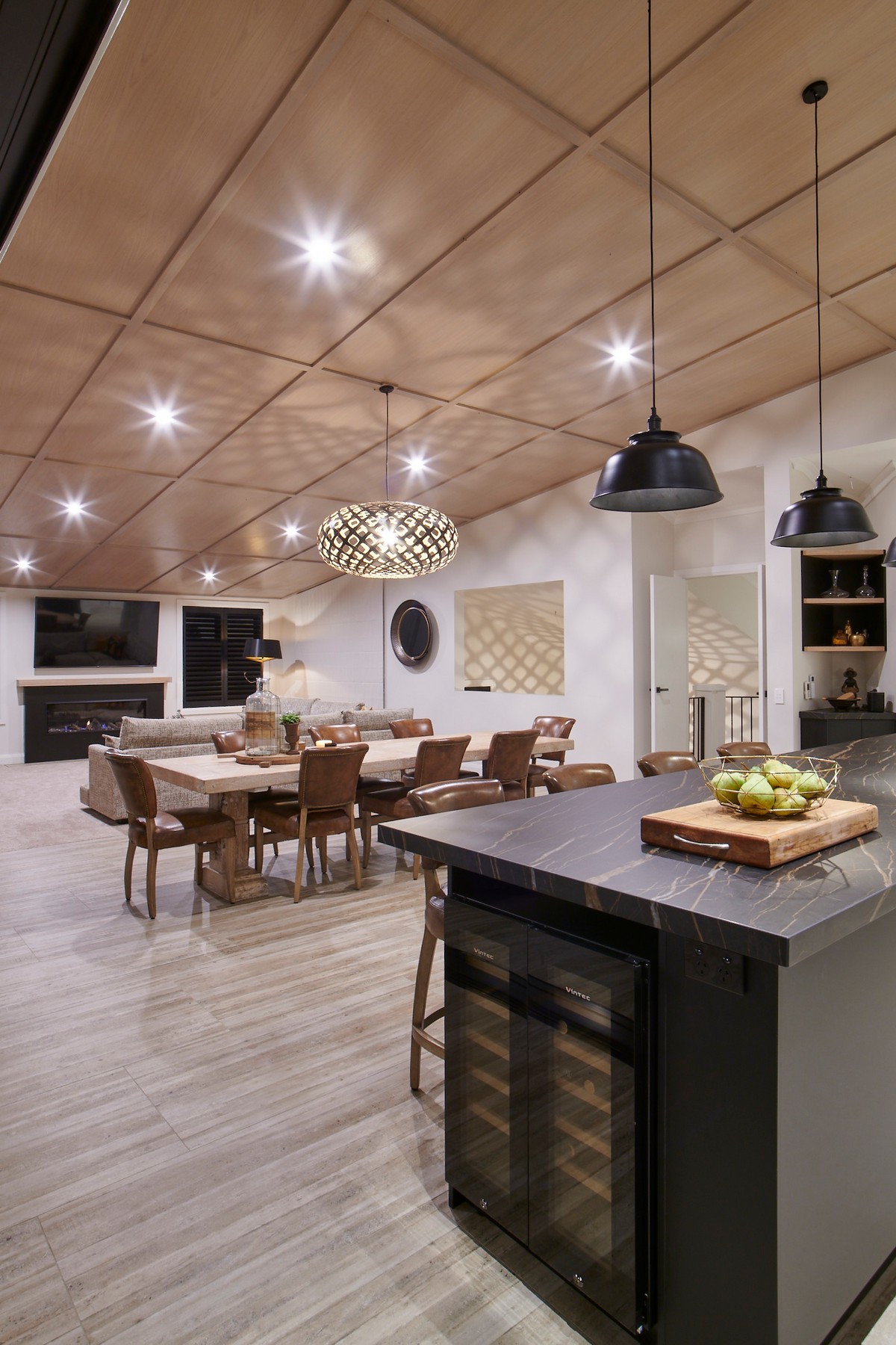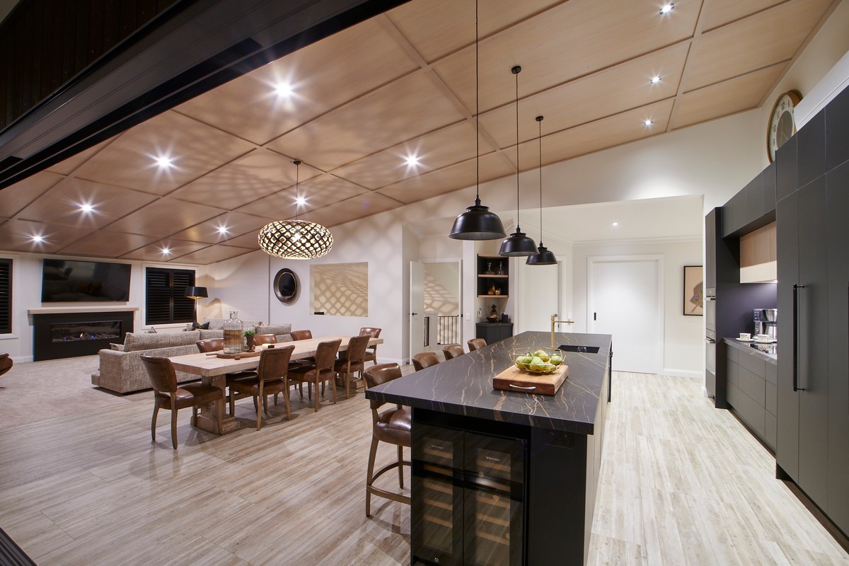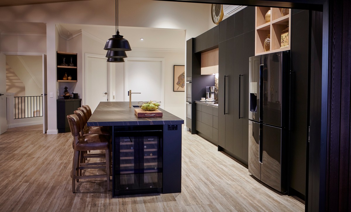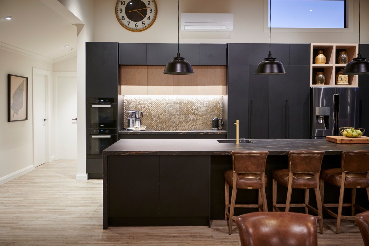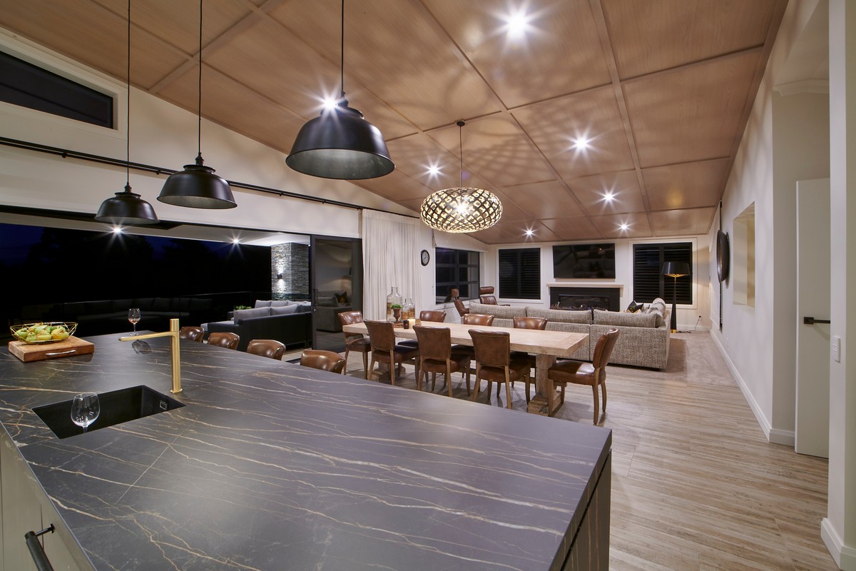 The kitchen is the centre-point of the house featuring an Italian porcelain Laminam benchtop and a honeycomb aluminium splash back for special effect.