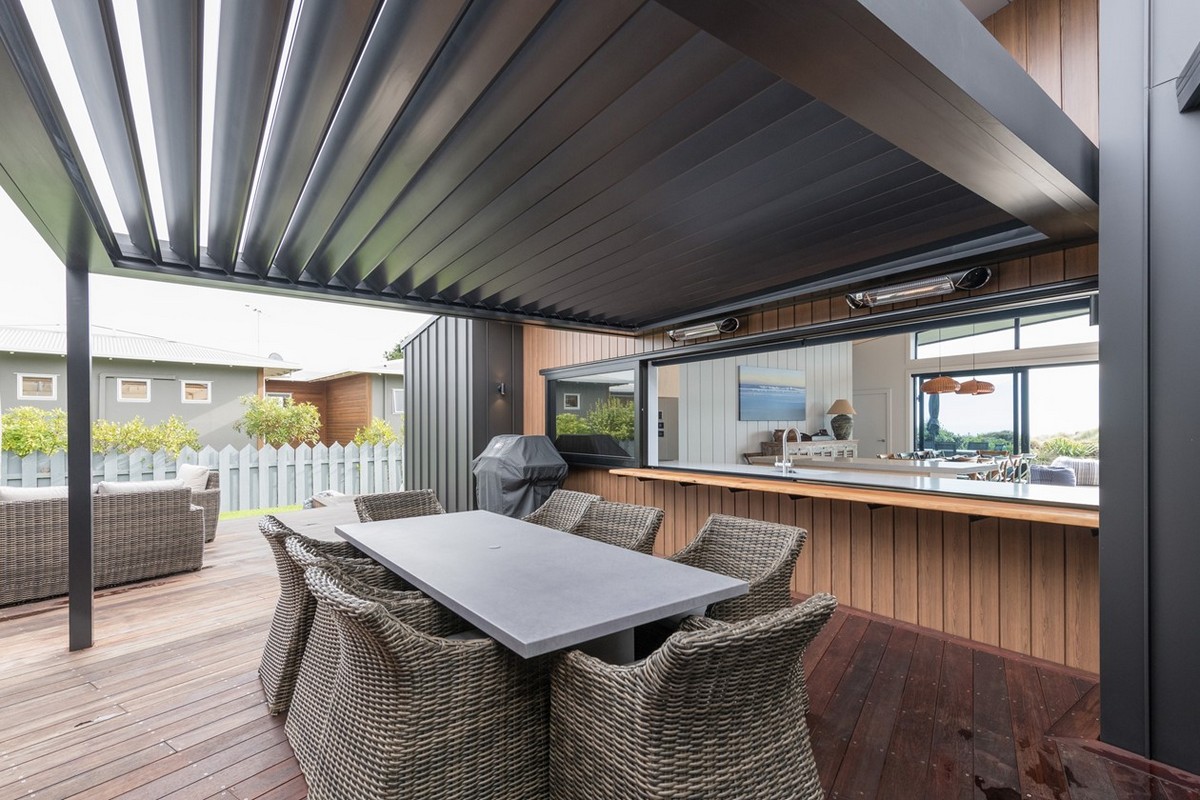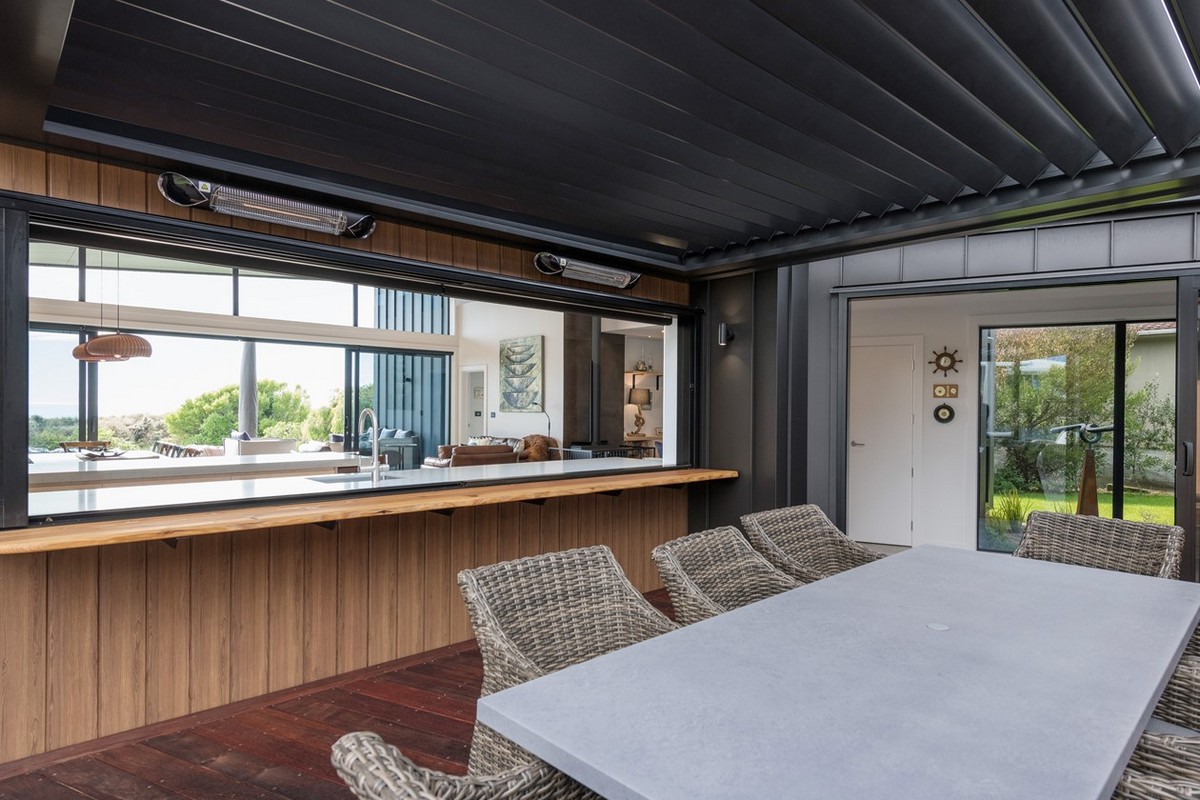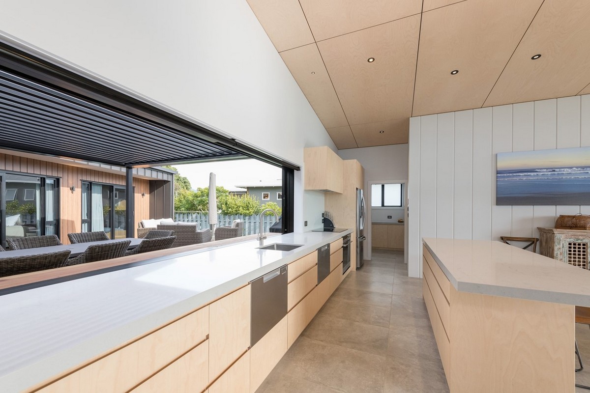The outdoor dining area beyond the kitchen is sheltered from the sea breeze and prevailing winds and the sliding kitchen window creates a practical link. Covered outdoor zones around the building take into account high rainfall and the cantilevered roof at the front provides ample shelter.