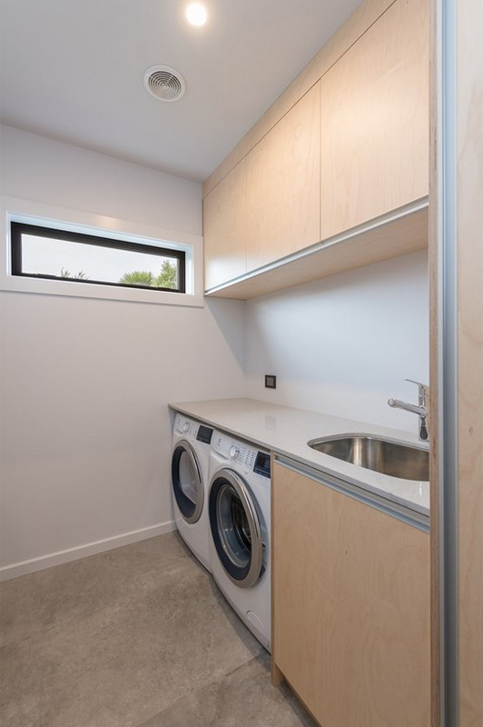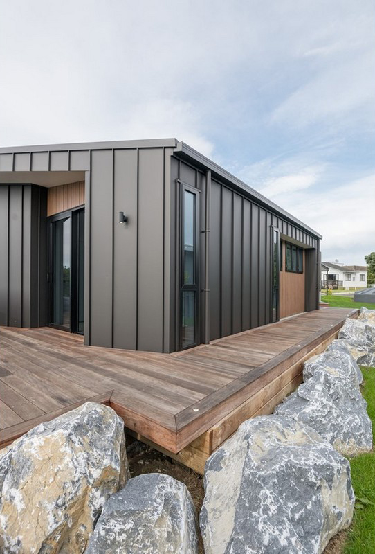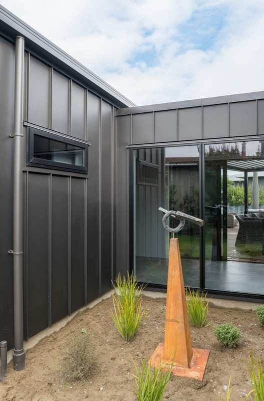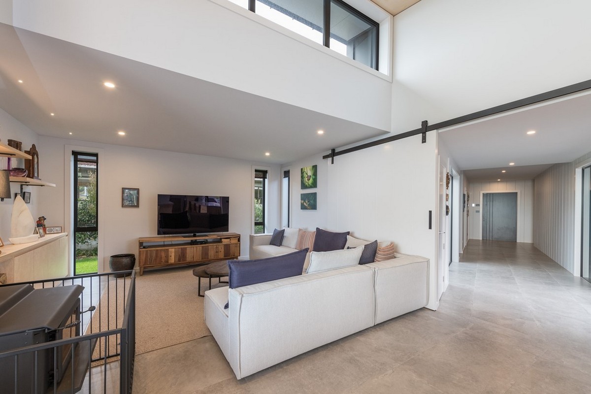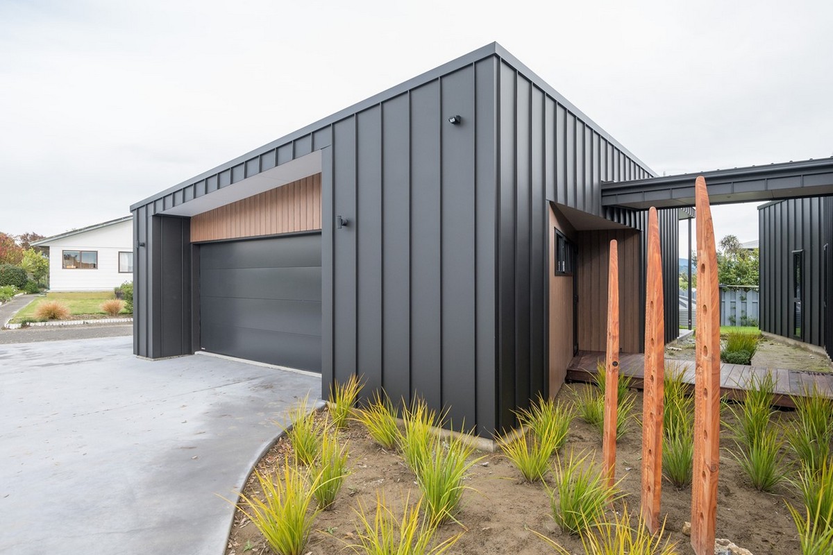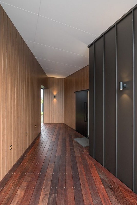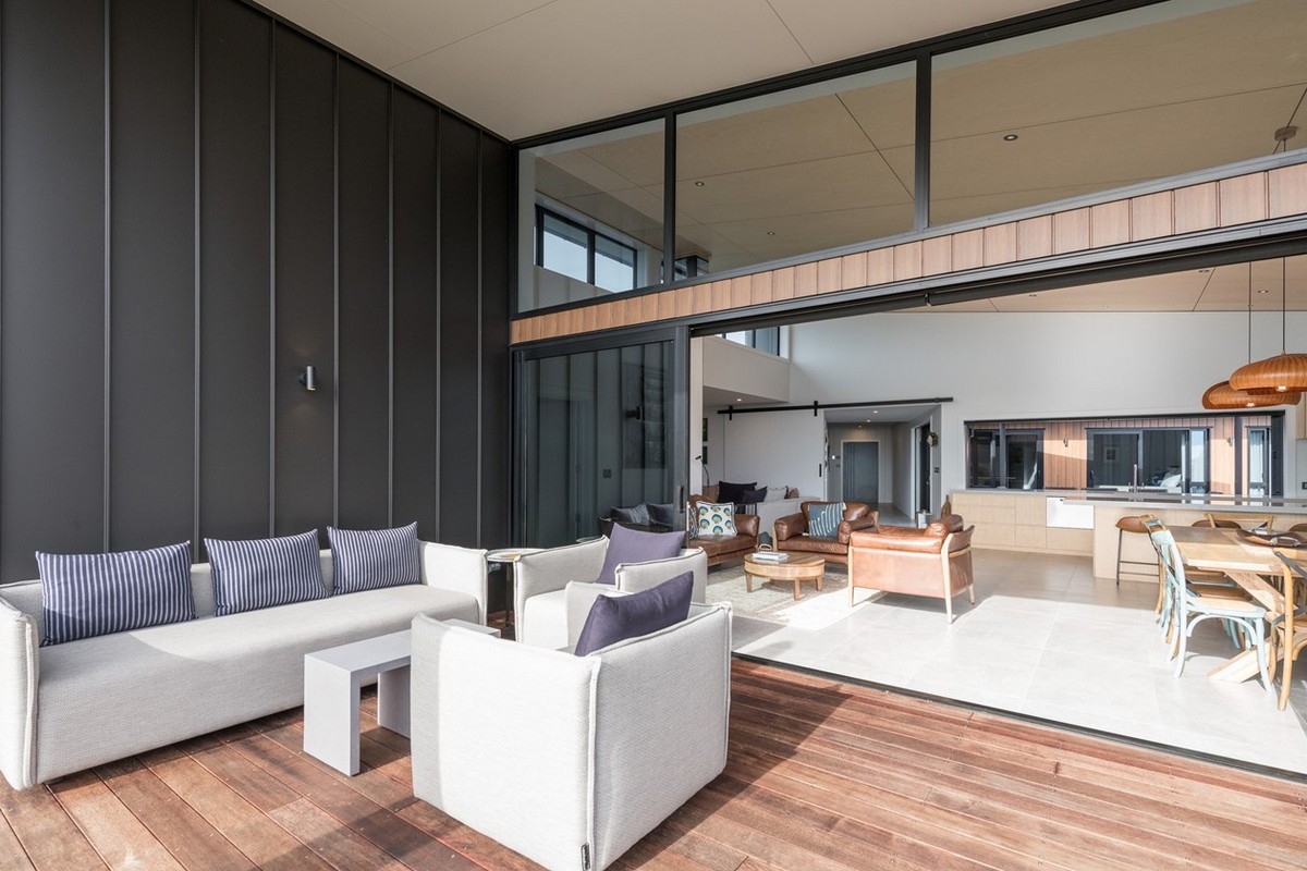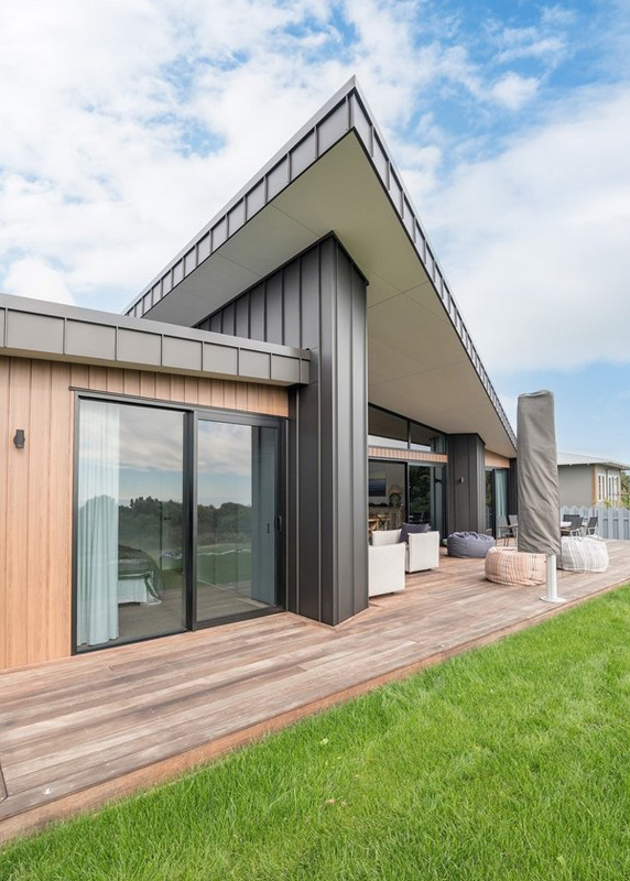 The delight is in the detail of this five-bedroom, four-bathroom luxury home. The soffit linings align with the ply on the living room ceiling and cement fibreboard wall linings are precisely cut to allow a negative detail around the top and base of the aluminium cladding.