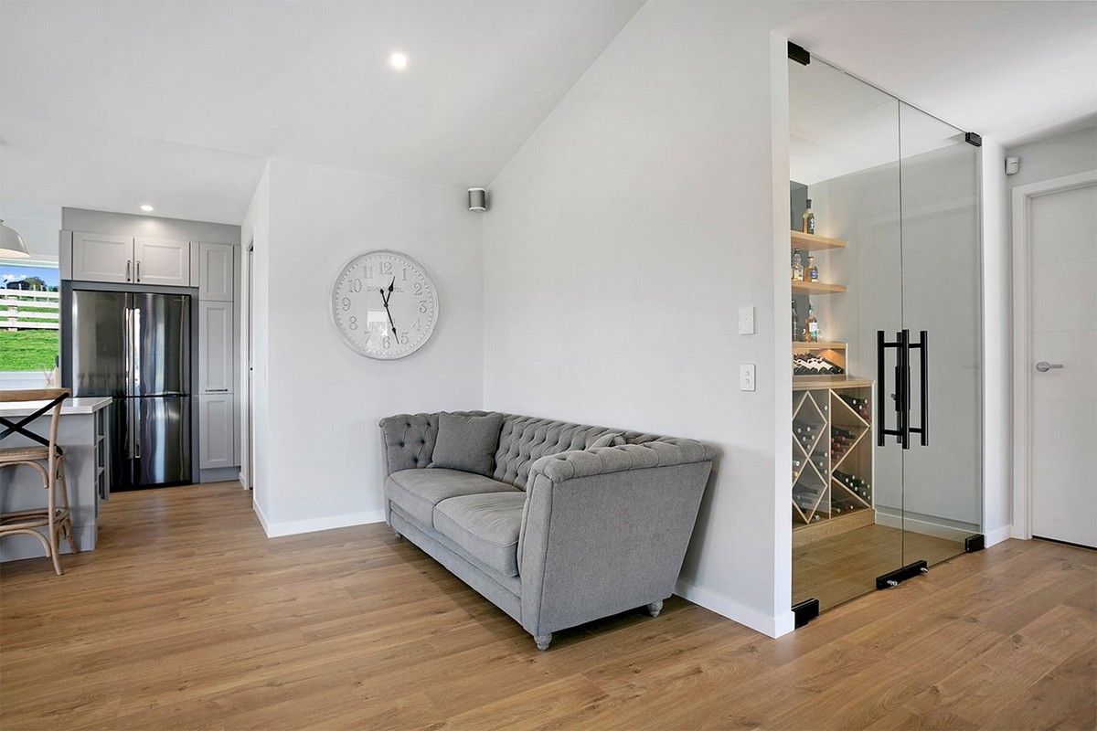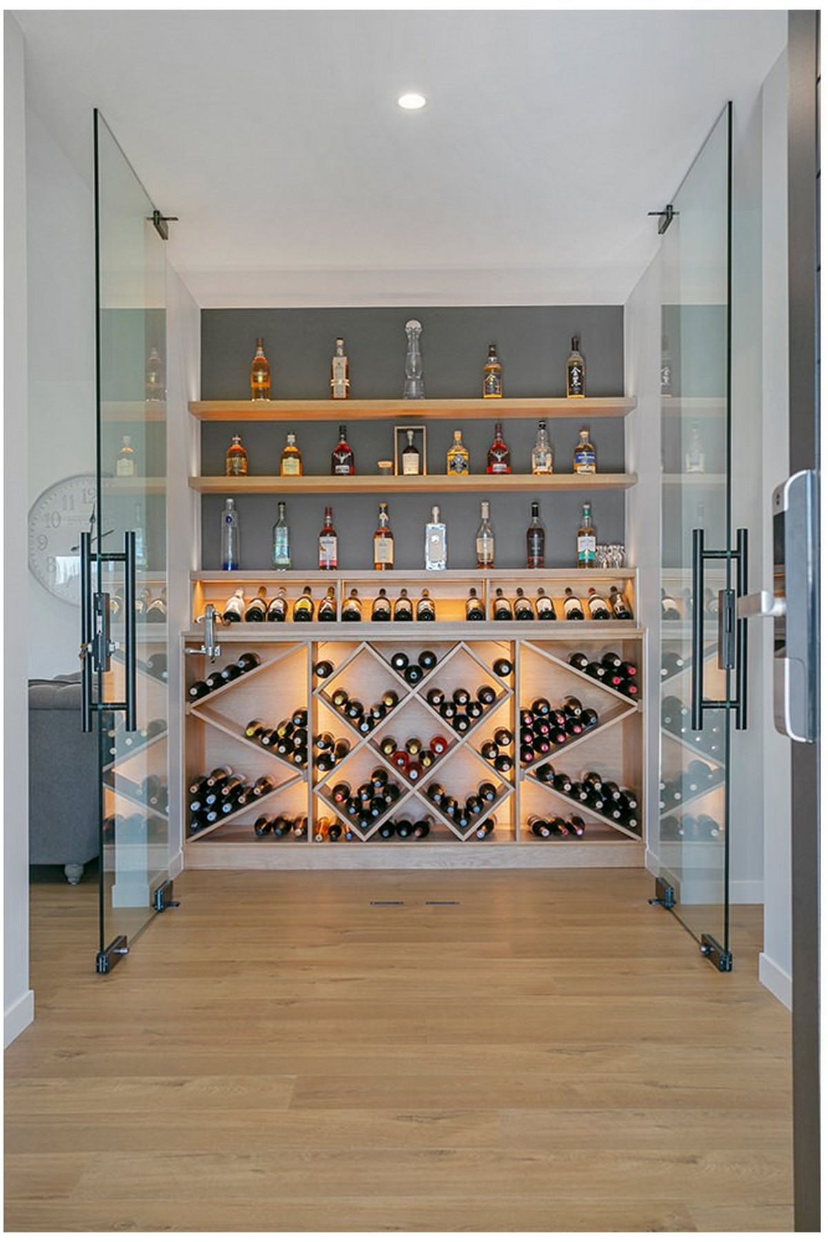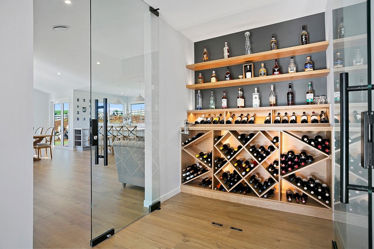 As you step inside, the entrance features a custom-built wine cellar that sits behind double-glass doors, creating an eye-catching talking point for guests.