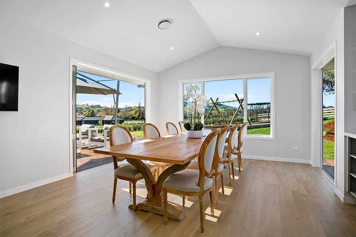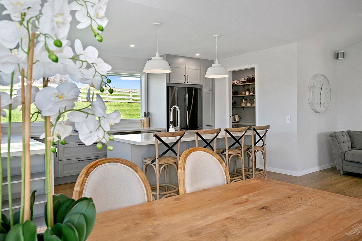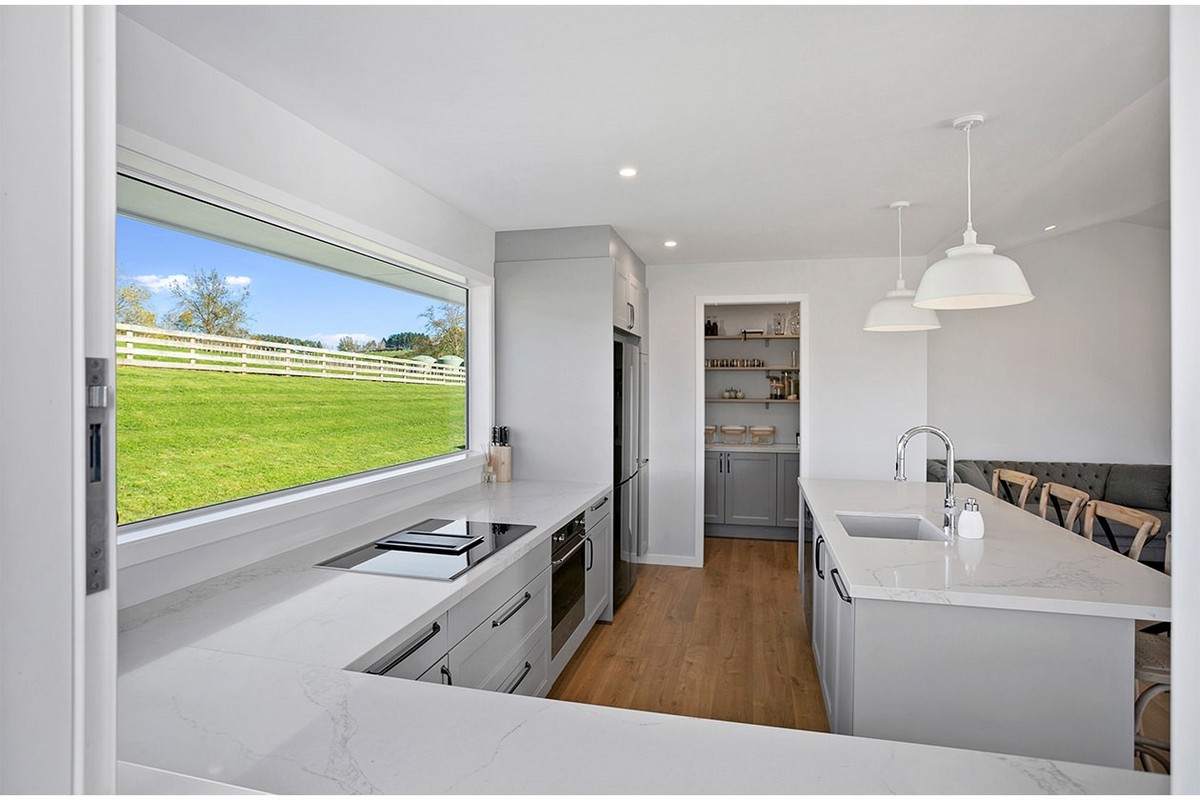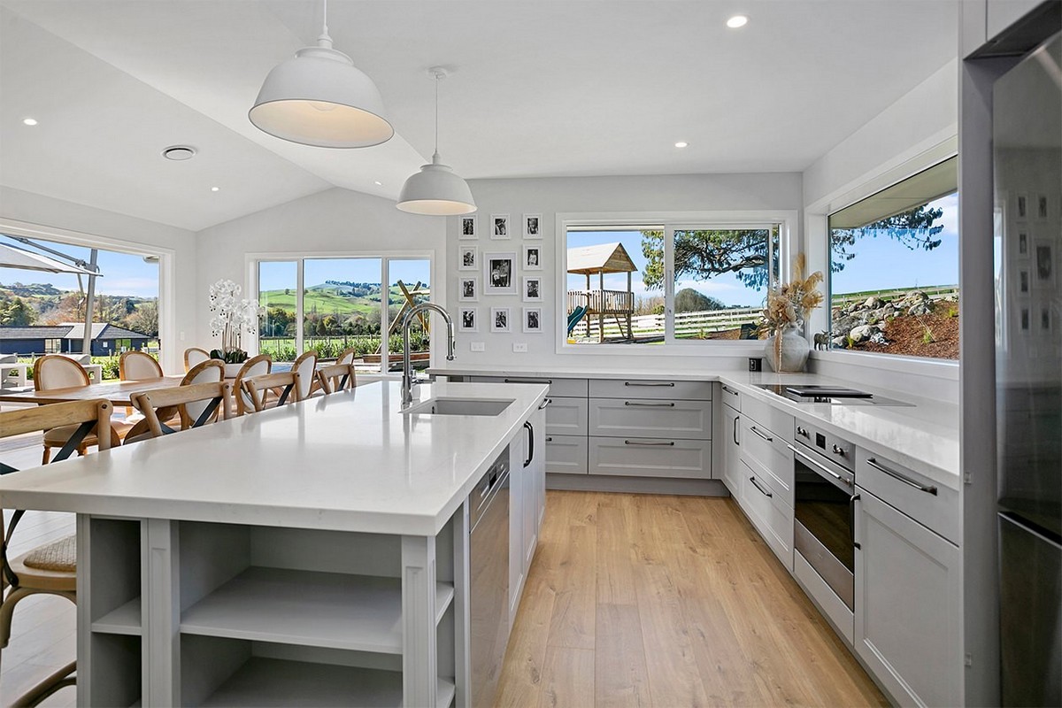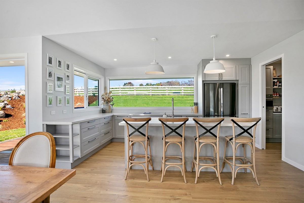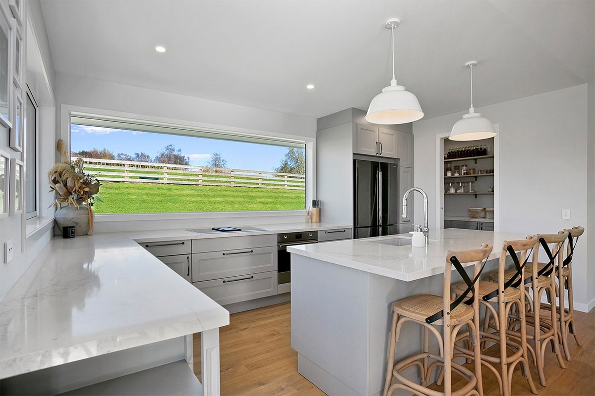 The designer kitchen is a pleasure to work in with generously sized windows overlooking the rural scenery, a butler’s pantry, and an island bench with breakfast bar.