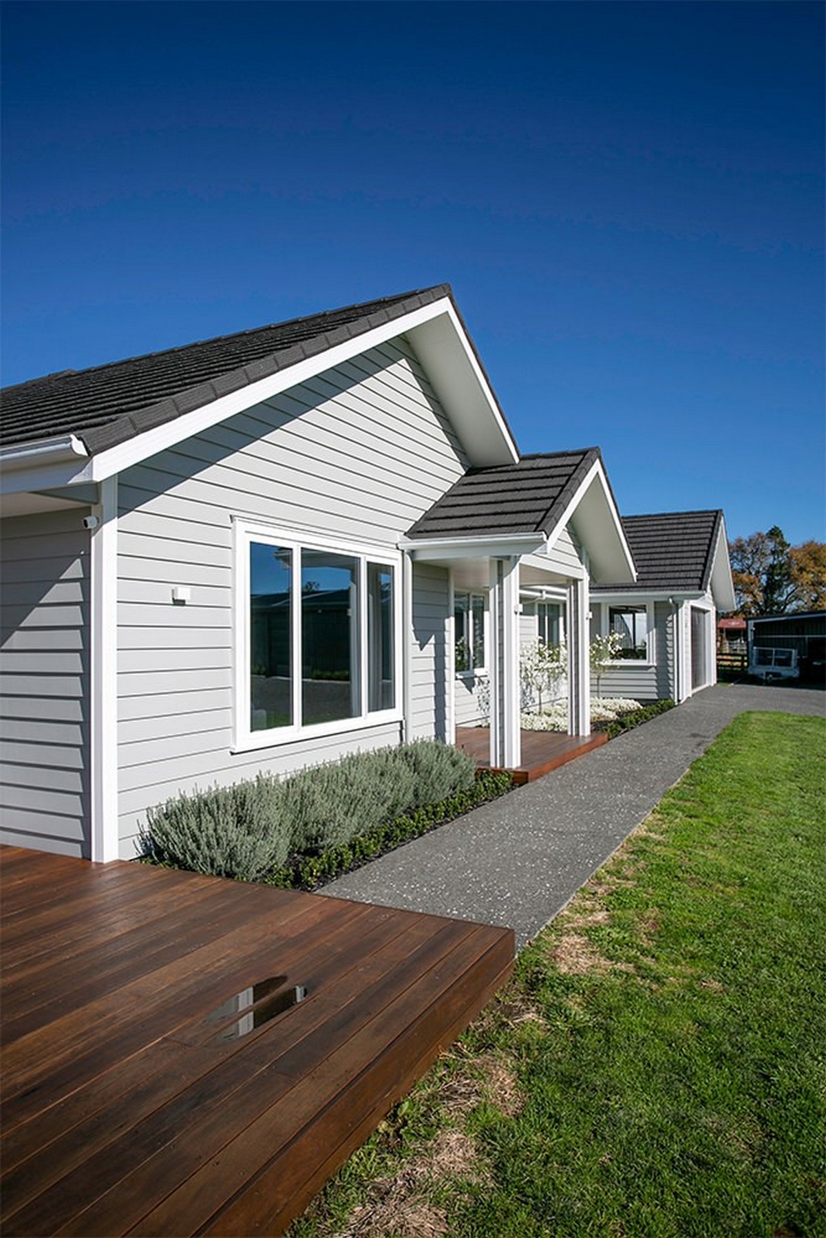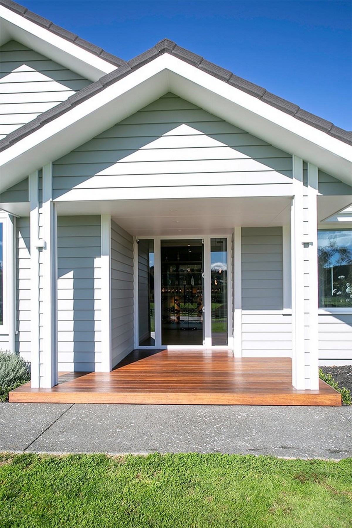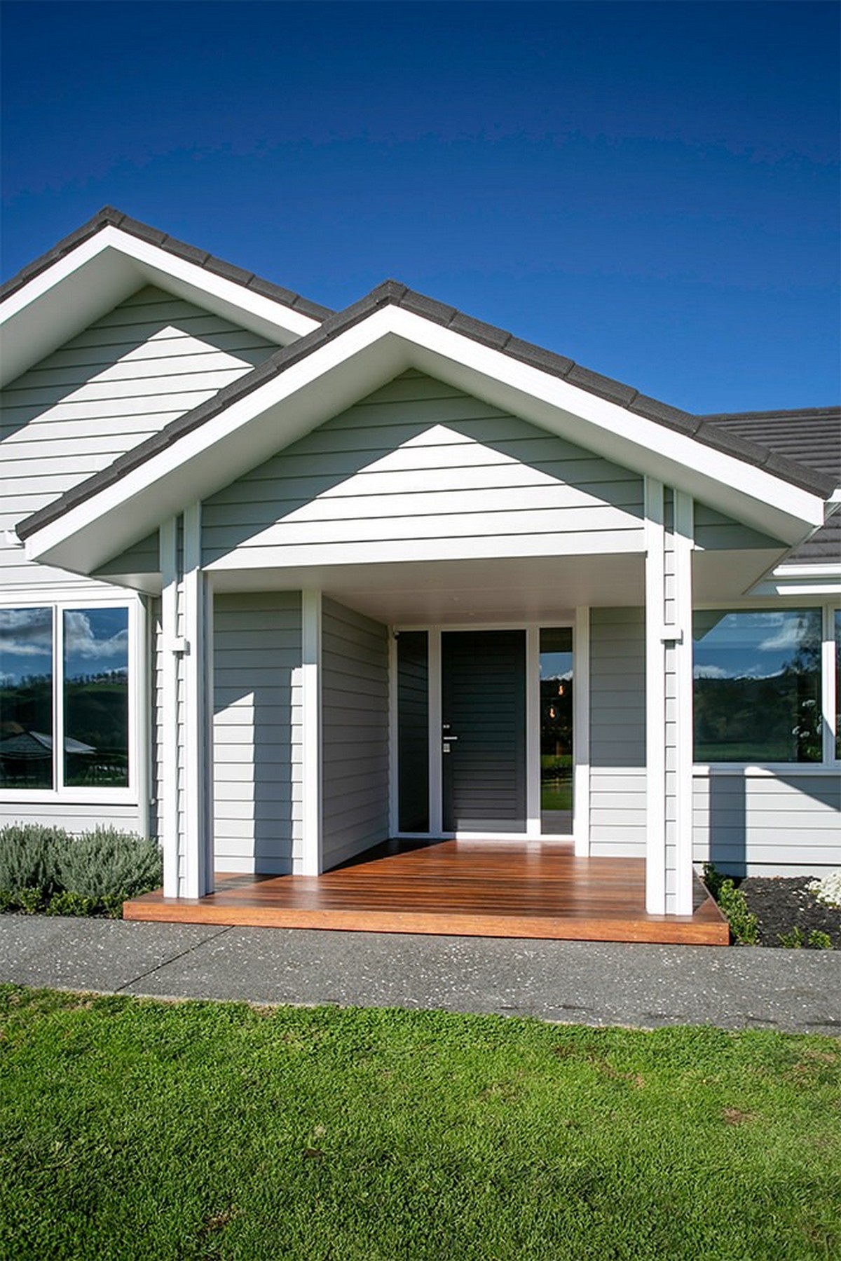The exterior is smart and chic in classic Linea weatherboard with attractive facings, including a gabled portico, and box corners.