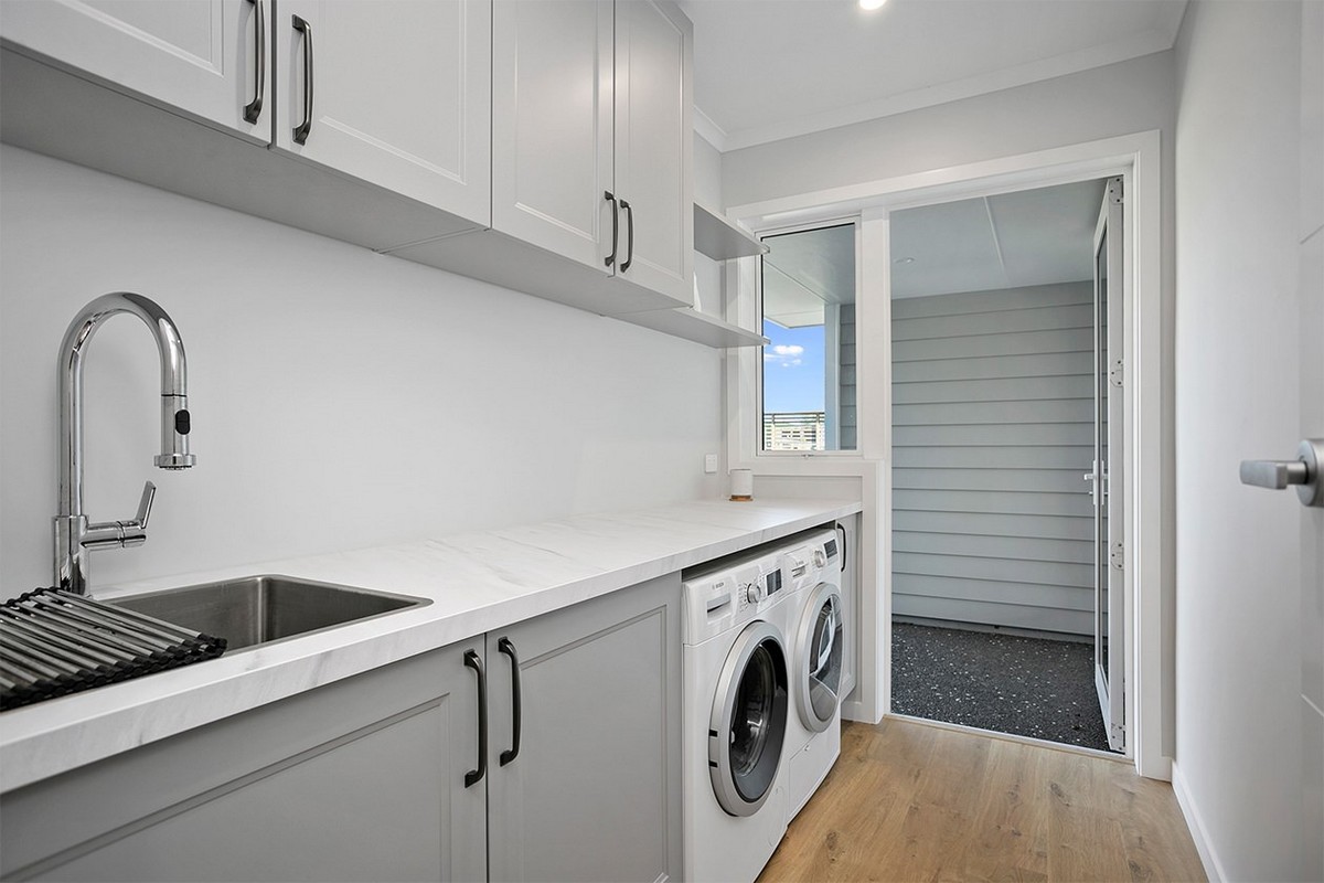 The spacious living and dining zone features a scissor trussed ceiling and multiple bi-fold doors that lead out to a choice of decked outdoor living spaces.