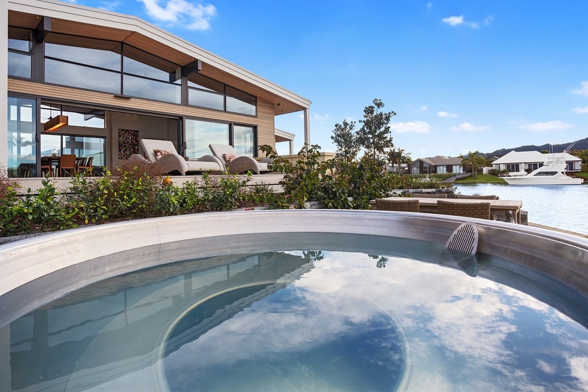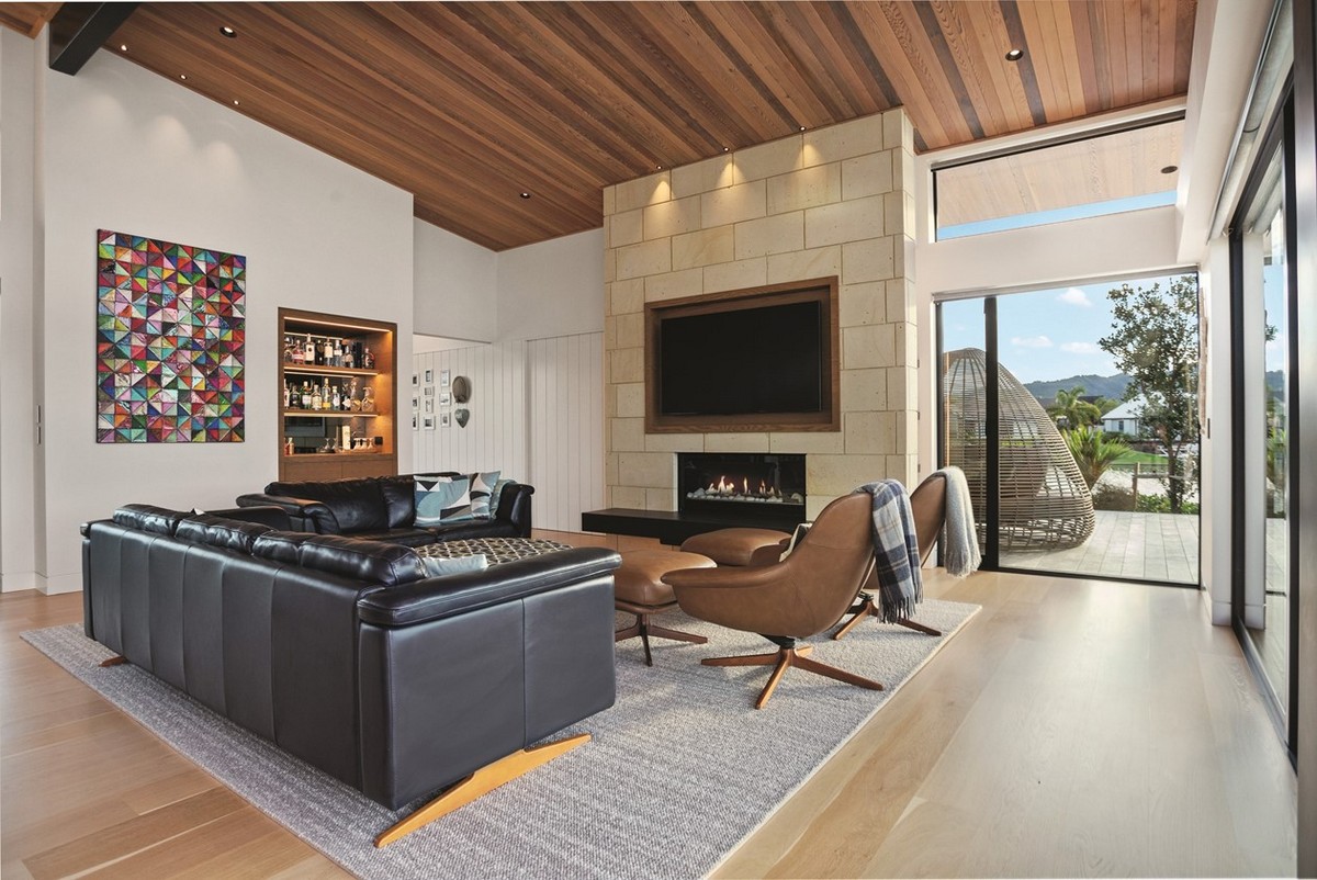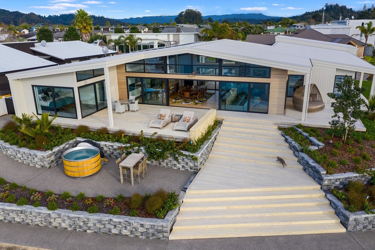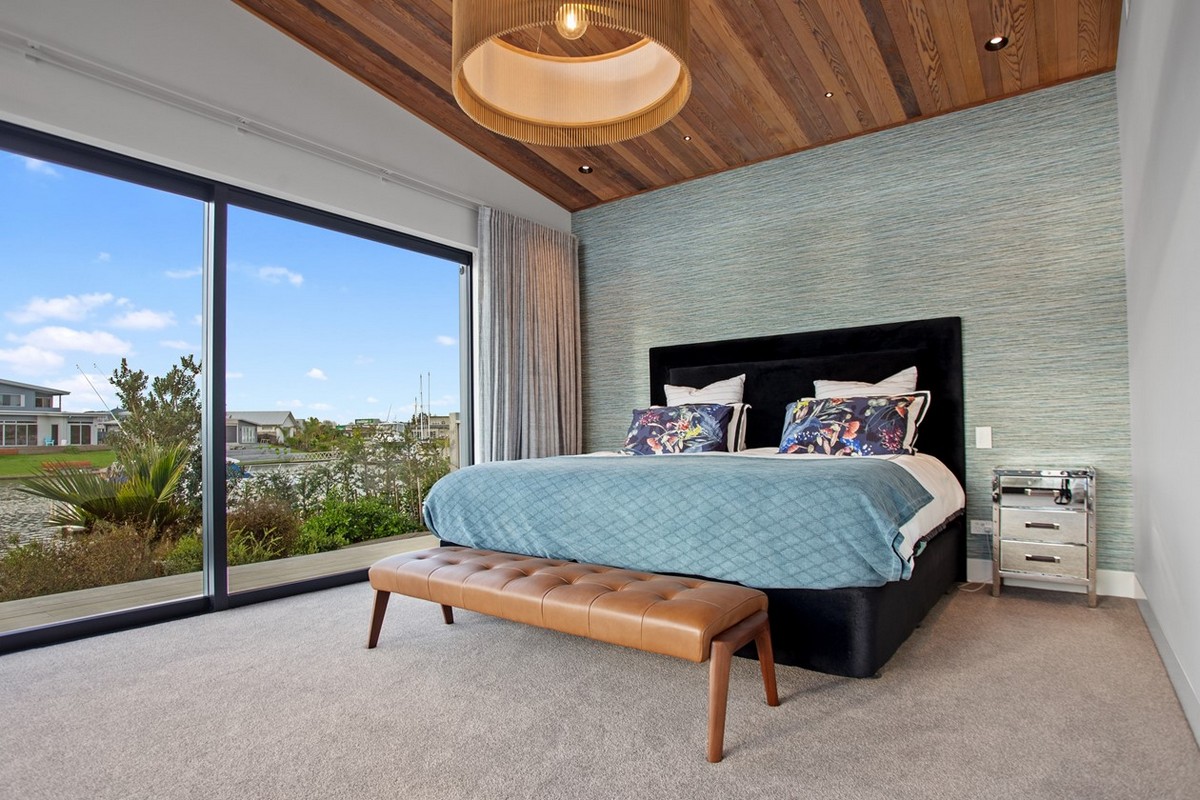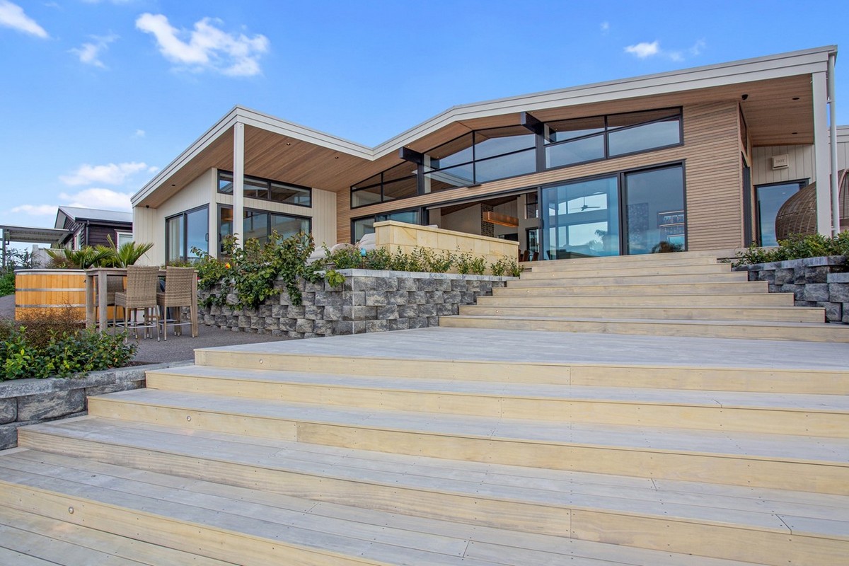 The exterior is a mix Hinuera stone, cedar batons and weatherboards, low maintenance and beautiful. All placed expertly to compliment the terraced landscape plan and allow the family to enjoy the benefits of living near the water. The options for entertaining outside are varied and include vast decks, a private poolside courtyard and sculptural garden steps that guide you down to the water or the hot tub.